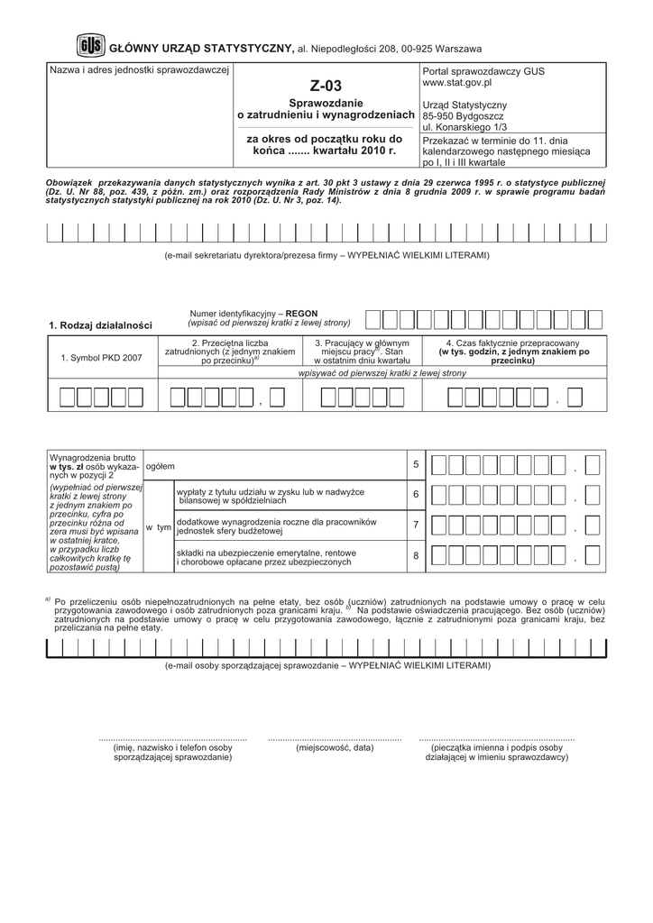 G£ÓWNY URZ¥D STATYSTYCZNY, al. Niepodleg³oœci 208, 00-925 Warszawa Nazwa i adres jednostki sprawozdawczej Portal sprawozdawczy GUS www.stat.gov.pl Z-03 Sprawozdanie Urz¹d Statystyczny o zatrudnieniu i wynagrodzeniach 85-950 Bydgoszcz ul. Konarskiego 1/3 Przekazaæ w terminie do 11. dnia kalendarzowego nastêpnego miesi¹ca po I, II i III kwartale za okres od pocz¹tku roku do koñca ....... kwarta³u 2010 r. Obowi¹zek przekazywania danych statystycznych wynika z art. 30 pkt 3 ustawy z dnia 29 czerwca 1995 r. o statystyce publicznej (Dz. U. Nr 88, poz. 439, z póŸn. zm.) oraz rozporz¹dzenia Rady Ministrów z dnia 8 grudnia 2009 r. w sprawie programu badañ statystycznych statystyki publicznej na rok 2010 (Dz. U. Nr 3, poz. 14). (e-mail sekretariatu dyrektora/prezesa firmy – WYPE£NIAÆ WIELKIMI LITERAMI) 1. Rodzaj dzia³alnoœci 1. Symbol PKD 2007 Numer identyfikacyjny – REGON (wpisaæ od pierwszej kratki z lewej strony) 2. Przeciêtna liczba zatrudnionych (z jednym znakiem po przecinku)a) 3. Pracuj¹cy w g³ównym 4. Czas faktycznie przepracowany miejscu pracyb). Stan (w tys. godzin, z jednym znakiem po w ostatnim dniu kwarta³u przecinku) wpisywaæ od pierwszej kratki z lewej strony , , Wynagrodzenia brutto w tys. z³ osób wykaza- ogó³em nych w pozycji 2 (wype³niaæ od pierwszej wyp³aty z tytu³u udzia³u w zysku lub w nadwy¿ce kratki z lewej strony bilansowej w spó³dzielniach z jednym znakiem po przecinku, cyfra po dodatkowe wynagrodzenia roczne dla pracowników przecinku ró¿na od zera musi byæ wpisana w tym jednostek sfery bud¿etowej w ostatniej kratce, w przypadku liczb sk³adki na ubezpieczenie emerytalne, rentowe ca³kowitych kratkê tê i chorobowe op³acane przez ubezpieczonych pozostawiæ pust¹) a) 5 , 6 , 7 , 8 , Po przeliczeniu osób niepe³nozatrudnionych na pe³ne etaty, bez osób (uczniów) zatrudnionych na podstawie umowy o pracê w celu przygotowania zawodowego i osób zatrudnionych poza granicami kraju. b) Na podstawie oœwiadczenia pracuj¹cego. Bez osób (uczniów) zatrudnionych na podstawie umowy o pracê w celu przygotowania zawodowego, ³¹cznie z zatrudnionymi poza granicami kraju, bez przeliczania na pe³ne etaty. (e-mail osoby sporz¹dzaj¹cej sprawozdanie – WYPE£NIAÆ WIELKIMI LITERAMI) ............................................................. (imiê, nazwisko i telefon osoby sporz¹dzaj¹cej sprawozdanie) ....................................................... (miejscowoœæ, data) ................................................................ (piecz¹tka imienna i podpis osoby dzia³aj¹cej w imieniu sprawozdawcy) Objaœnienia do formularza Z-03 1. Formularz Z-03 sk³ada siê z jednej czêœci zatytu³owanej ,,Rodzaj dzia³alnoœci”, w której jednostki sprawozdawcze wpisuj¹ symbol rodzaju dzia³alnoœci podstawowej wed³ug PKD 2007. W przypadku sprawozdañ zbiorczych, np. zespo³ów szkó³, szkó³ podstawowych, gimnazjów, wpisaæ REGON jednej ze szkó³ ujêtych w zbiorówce (w ramach dzia³u PKD=85) i przestrzegaæ tej zasady przez wszystkie kwarta³y. 2. W pozycji 1 nale¿y wpisaæ symbol zgodny z Polsk¹ Klasyfikacj¹ Dzia³alnoœci. 3. W pozycji 2 wykazuje siê przeciêtn¹ liczbê zatrudnionych, po przeliczeniu osób niepe³nozatrudnionych na pe³ne etaty, (po raz pierwszy w tym roku z jednym znakiem po przecinku) tj.: 1) osoby zatrudnione na podstawie umowy o pracê, powo³ania, wyboru lub mianowania, w tym równie¿: – osoby zatrudnione przy pracach interwencyjnych i robotach publicznych oraz osoby przebywaj¹ce za granic¹ na podstawie delegacji s³u¿bowej, z wyj¹tkiem zatrudnionych poza granicami kraju, 2) osoby pracuj¹ce w zak³adach pracy w formie zorganizowanych grup roboczych na podstawie zbiorowej lub indywidualnej umowy o pracê, tj. uczestnicy OHP (z wyj¹tkiem odbywaj¹cych naukê zawodu), ¿o³nierze, skazani, junacy obrony cywilnej, junacy stra¿y przemys³owej i po¿arnej. W poz. 2 nale¿y uwzglêdniæ cudzoziemców wykonuj¹cych pracê w Polsce z mocy przepisów ustawy z dnia 20 kwietnia 2004 r. o promocji zatrudnienia i instytucjach rynku pracy (Dz. U. z 2008 r. Nr 69, poz. 415, z póŸn. zm.). Do zatrudnionych nie zalicza siê: 1) osób wykonuj¹cych pracê nak³adcz¹, 2) osób (uczniów) zatrudnionych na podstawie umowy o pracê w celu przygotowania zawodowego, 3) agentów, 4) osób pracuj¹cych na umowê-zlecenie lub umowê o dzie³o. Metodê obliczania przeciêtnego zatrudnienia w miesi¹cu nale¿y dostosowaæ do sytuacji kadrowej w jednostce. W przypadku du¿ej p³ynnoœci kadr lub natê¿enia zjawiska udzielania urlopów bezp³atnych nale¿y stosowaæ metodê œredniej arytmetycznej ze stanów dziennych w miesi¹cu. Osób przebywaj¹cych na urlopach bezp³atnych nie nale¿y liczyæ do stanów dziennych w czasie trwania tych urlopów. Przy stabilnej sytuacji kadrowej przeciêtne zatrudnienie w miesi¹cu mo¿na obliczyæ metod¹ uproszczon¹, tj. na podstawie sumy dwóch stanów dziennych (w pierwszym i ostatnim dniu miesi¹ca) podzielonej przez dwa lub metod¹ œredniej chronologicznej, obliczanej na podstawie sumy po³owy stanu dziennego w pierwszym i ostatnim dniu miesi¹ca oraz stanu zatrudnienia w 15. dniu miesi¹ca podzielonej przez 2. Przy zastosowaniu tych metod nie nale¿y ujmowaæ osób, które korzysta³y z urlopów bezp³atnych w wymiarze powy¿ej 14 dni. Przeciêtne zatrudnienie w okresach narastaj¹cych nale¿y obliczaæ jako sumê przeciêtnego zatrudnienia w poszczególnych miesi¹cach podzielon¹ przez liczbê miesiêcy w okresie sprawozdawczym (bez wzglêdu na to, czy zak³ad funkcjonowa³ przez ca³y okres sprawozdawczy, czy nie). Przeliczania osób niepe³nozatrudnionych na pe³ne etaty dokonuje siê wed³ug liczby godzin pracy ustalonej w umowie o pracê w stosunku do obowi¹zuj¹cej normy. 4. W pozycji 3 wykazuje siê liczbê osób (bez uczniów), bêd¹cych w stanie ewidencyjnym w ostatnim dniu kwarta³u, dla których jednostka sprawozdawcza jest g³ównym miejscem