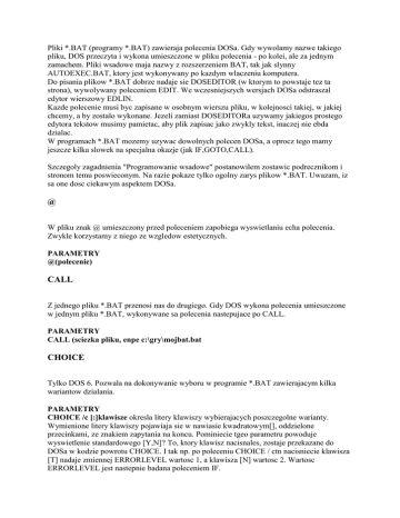 Pliki *.BAT (programy *.BAT) zawieraja polecenia DOSa. Gdy wywolamy nazwe takiego pliku, DOS przeczyta i wykona umieszczone w pliku polecenia - po kolei, ale za jednym zamachem. Pliki wsadowe maja nazwy z rozszerzeniem BAT, tak jak slynny AUTOEXEC.BAT, ktory jest wykonywany po kazdym wlaczeniu komputera. Do pisania plikow *.BAT dobrze nadaje sie DOSEDITOR (w ktorym to powstaje tez ta strona), wywolywany poleceniem EDIT. We wczesniejszych wersjach DOSa odstraszal edytor wierszowy EDLIN. Kazde polecenie musi byc zapisane w osobnym wierszu pliku, w kolejnosci takiej, w jakiej chcemy, a by zostalo wykonane. Jezeli zamiast DOSEDITORa uzywamy jakiegos prostego edytora tekstow musimy pamietac, aby plik zapisac jako zwykly tekst, inaczej nie ebda dzialac. W programach *.BAT mozemy uzywac dowolnych polecen DOSa, a oprocz tego mamy jeszcze kilka slowek na specjalna okazje (jak IF,GOTO,CALL). Szczegoly zagadnienia "Programowanie wsadowe" postanowilem zostawic podrecznikom i stronom temu poswieconym. Na razie pokaze tylko ogolny zarys plikow *.BAT. Uwazam, iz sa one dosc ciekawym aspektem DOSa. @ W pliku znak @ umieszczony przed poleceniem zapobiega wyswietlaniu echa polecenia. Zwykle korzystamy z niego ze wzgledow estetycznych. PARAMETRY @(polecenie) CALL Z jednego pliku *.BAT przenosi nas do drugiego. Gdy DOS wykona polecenia umieszczone w jednym pliku *.BAT, wykonywane sa polecenia nastepujace po CALL. PARAMETRY CALL (sciezka pliku, enpe c:\gry\mojbat.bat CHOICE Tylko DOS 6. Pozwala na dokonywanie wyboru w programie *.BAT zawierajacym kilka wariantow dzialania. PARAMETRY CHOICE /c [:]klawisze okresla litery klawiszy wybierajacych poszczegolne warianty. Wymienione litery klawiszy pojawiaja sie w nawiasie kwadratowym[], oddzielone przecinkami, ze znakiem zapytania na koncu. Pominiecie tgeo parametru powoduje wyswietlenie standardowego [Y,N]? To, ktory klawisz nacisnales, zostaje przekazane do DOSa w kodzie powrotu CHOICE. I tak np. po poleceniu CHOICE / ctn nacisniecie klawisza [T] nadaje zmiennej ERRORLEVEL wartosc 1, a klawisza [N] wartosc 2. Wartosc ERRORLEVEL jest nastepnie badana poleceniem IF. CHOICE /n powoduje, ze zostaje wyswietlony napisany przez ciebie tekst. CHOICE /s czyni CHOICE wrazliwym na duze i male litery. CHOICE /t[:]c,nn okresla klawisz c (jeden z wymienionych w opcji /c), ktory zostanie automatycznie wybrany, o ile w czasie nn (od 1 d0 99 sekund) nie dokonasz wyboru. ECHO Wyswietla tresc komunikatu albo decyduje o tym, czy DOS ma wyswietlac echo polcenia. PARAMETRY ECHO(komunikat) tresc, ktora chcesz, zeby ukazala sie na ekranie. ECHO ON wlacza wyswietlanie cha polecen. ECHO OFF wylacza wyswietlanie echa polecen. FOR Wykonuje okreslone polecenie DOSa dla kazdego elementu serii plikow lub ciagow znakow. Polecenie mozna podac rownioez z linii komend, wtedy zamiast %% piszesz %. PARAMETRY FOR %%zmienna IN (seria) DO polecenie [parametry] %%zmienna nazwa zmiennej, ktora bedzie kolejno zastepowana nazwa pliku lub ciagu znakow z serii. Moze to byc litera od A do Z, mala lub duza (FOR jest wrazliwa na wielkosc liter) i pozostale znaki, z wyjatkiem cyfr 0-9. (seria) koniecznie w nawiasach! Okresla jeden lub kilka plikow badz ciagow znakow, ktore ebda przetwarzane przez okreslone polecenie. Elementy serii odzielasz spacjami. W nazwach plikow mozna uzywac jokerow *i? polecenie nazwa polecenia, ktore bedzie przetwarzalo kazdy z elementow serii. parametry okresla parametry lub opcje polecenia, wsrod nich %%zmienna. GOTO Skok do wiersza pliku *.BAT okreslonego wymieniona etykieta. Uzycie polecenia GOTO ma sens w polaczeniu z uzyciem polcenia IF, pozwalajacego na warunkowe wykonywanie pewnych framgmentow programu *.BAT. PARAMETRY GOTO etykieta gdzie etykieta okresla, dokad przeniesie sie akcja programu. Gdy nadajesz wierszowi etykiete, musisz poprzedzic ja dwukropkiem. IF Umozliwia warunkowe wykonanie polecenia, jezeli warunek po IF jest seplniony. Jezeli nie, to polecenie jest ignorowane. PARAMETRY IF [not] errorlevel x polecenie IF [not] ciag_znakow1==ciag_znakow2 polecenie IF [not] exist nazwa_pliku polecenie not znaczy nie [not] errorlevel X wartosc errorlevel to kod powrotu, ktory programy pozostawiaja DOSowi po zakonczeniu swojego dzialania. Polecenie IF odczytuje te wartosc i jezeli (nie) jest ona wieksza lub rowna X, polecenie ejst wykonywane. [not] ciag_znakow1==ciag_znakow2 jezeli ciag_znakow1 (nie) jest taki sam, jak ciag_znakow2, to polecenie jest wykonywane. [not] exist nazwa_pliku jezeli (nie) istnieje plik o podanej nazwie, to polecenie jest wykonywane. polecenie okresla polecenie, ktore jest wykonywane w razie spelnienia warunku. PAUSE Wstrzymuje wykonanie programu *.BAT do momentu, kiedy nacisniesz dowolny klawisz. Dodatkowo moze wyswietlac w czasie pauzy ulozony przez ciebie komunikat. PARAMETRY PAUSE (tekst) gdzie tekst, to ulozony przez ciebie komunikat, ktory ma byc wyswietlany na ekranie, gdy sytem czeka na nacisniecie przez ciebie klawisza. UWAGA!!! Taki komunikat bedzie wyswietlony tylko przy wlaczonym ECHO. Jesli wprowadzisz PAUSE bez parametru tekstu, DOS wyswietli swoj standardowy komunikat PRESS ANY KEY TO CONTINUE. Standardowy komunikat pojawia sie takze przy wylaczonym echo. REM Wiersz w programie *.BAT zaczynajacy sie od REM moze zawierac dowolna tresc. DOSa taki wiersz nie interesuje. Najczesciej po REM umieszcza sie komentarz ulatwiajacy zrozumienie dzialania programu *.BAT. Jest to rowniez latwa metoda wylaczania okreslonego polecenia w pliku CONFIG.SYS badz AUTOEXEC.BAT. PARAMETRY REM (tekst) gdzie tekst to tresc komentarza polecenia, ktore ma byc wylaczone z programu. SHIFT Parametry, z ktorymi wywolujesz program *.BAT, sa przedstawione w tekscie pliku jako %1, %2 ... %9 (%0 to nazwa samego pliku *.BAT). W czasie wykonywania programu tajemnicze %n zastepowane sa przez rzeczywiste parametry, ktore zostaly wpisane za nazwa programu w linii komend. Pewnym ograniczeniem jest to, ze masz 10 zmiennych od %0 do %9. Czasem chcialbys, zeby program mogl korzystac z