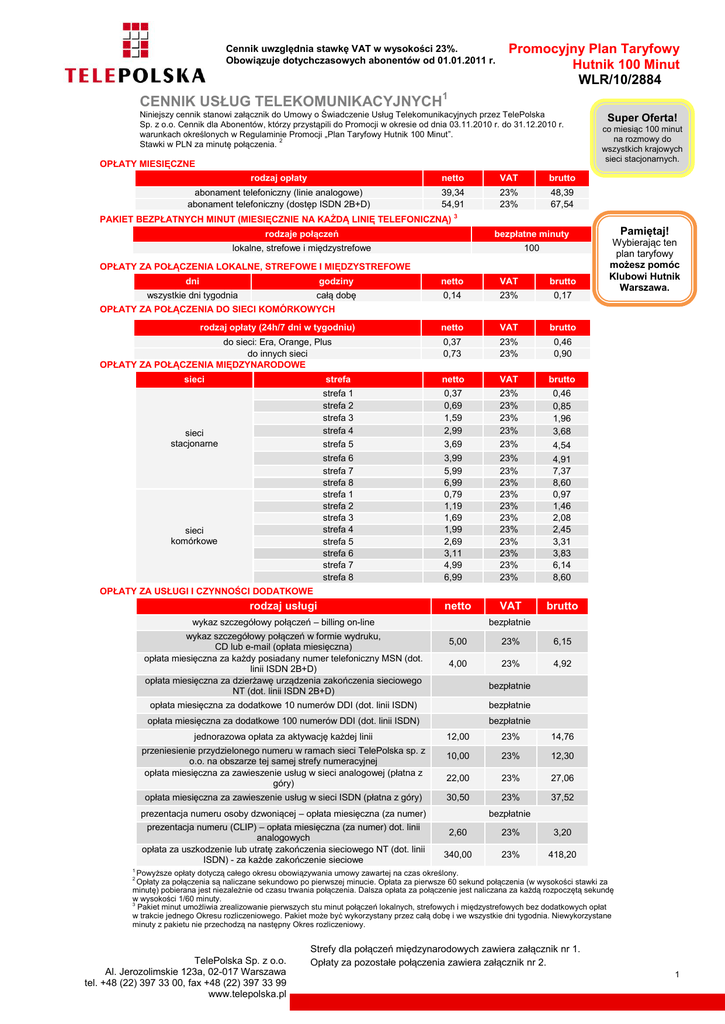 Cennik uwzględnia stawkę VAT w wysokości 23%. Obowiązuje dotychczasowych abonentów od 01.01.2011 r. Promocyjny Plan Taryfowy Hutnik 100 Minut WLR/10/2884 CENNIK USŁUG TELEKOMUNIKACYJNYCH1 Niniejszy cennik stanowi załącznik do Umowy o Świadczenie Usług Telekomunikacyjnych przez TelePolska Sp. z o.o. Cennik dla Abonentów, którzy przystąpili do Promocji w okresie od dnia 03.11.2010 r. do 31.12.2010 r. warunkach określonych w Regulaminie Promocji „Plan Taryfowy Hutnik 100 Minut”. 2 Stawki w PLN za minutę połączenia. OPŁATY MIESIĘCZNE rodzaj opłaty netto VAT brutto abonament telefoniczny (linie analogowe) abonament telefoniczny (dostęp ISDN 2B+D) 39,34 54,91 23% 23% 48,39 67,54 Super Oferta! co miesiąc 100 minut na rozmowy do wszystkich krajowych sieci stacjonarnych. PAKIET BEZPŁATNYCH MINUT (MIESIĘCZNIE NA KAŻDĄ LINIĘ TELEFONICZNĄ) 3 rodzaje połączeń bezpłatne minuty lokalne, strefowe i międzystrefowe 100 OPŁATY ZA POŁĄCZENIA LOKALNE, STREFOWE I MIĘDZYSTREFOWE dni godziny netto VAT brutto wszystkie dni tygodnia całą dobę 0,14 23% 0,17 netto VAT brutto 0,37 0,73 23% 23% 0,46 0,90 Pamiętaj! Wybierając ten plan taryfowy możesz pomóc Klubowi Hutnik Warszawa. OPŁATY ZA POŁĄCZENIA DO SIECI KOMÓRKOWYCH rodzaj opłaty (24h/7 dni w tygodniu) do sieci: Era, Orange, Plus do innych sieci OPŁATY ZA POŁĄCZENIA MIĘDZYNARODOWE sieci strefa netto VAT brutto sieci stacjonarne strefa 1 strefa 2 strefa 3 strefa 4 strefa 5 0,37 0,69 1,59 2,99 3,69 23% 23% 23% 23% 23% 0,46 0,85 1,96 3,68 strefa 6 strefa 7 strefa 8 strefa 1 strefa 2 strefa 3 strefa 4 strefa 5 strefa 6 strefa 7 strefa 8 3,99 5,99 6,99 0,79 1,19 1,69 1,99 2,69 3,11 4,99 6,99 23% 23% 23% 23% 23% 23% 23% 23% 23% 23% 23% 4,91 7,37 8,60 0,97 1,46 2,08 2,45 3,31 3,83 6,14 8,60 VAT brutto sieci komórkowe 4,54 OPŁATY ZA USŁUGI I CZYNNOŚCI DODATKOWE rodzaj usługi netto wykaz szczegółowy połączeń – billing on-line wykaz szczegółowy połączeń w formie wydruku, CD lub e-mail (opłata miesięczna) opłata miesięczna za każdy posiadany numer telefoniczny MSN (dot. linii ISDN 2B+D) opłata miesięczna za dzierżawę urządzenia zakończenia sieciowego NT (dot. linii ISDN 2B+D) bezpłatnie 5,00 23% 6,15 4,00 23% 4,92 bezpłatnie opłata miesięczna za dodatkowe 10 numerów DDI (dot. linii ISDN) bezpłatnie opłata miesięczna za dodatkowe 100 numerów DDI (dot. linii ISDN) bezpłatnie jednorazowa opłata za aktywację każdej linii przeniesienie przydzielonego numeru w ramach sieci TelePolska sp. z o.o. na obszarze tej samej strefy numeracyjnej opłata miesięczna za zawieszenie usług w sieci analogowej (płatna z góry) opłata miesięczna za zawieszenie usług w sieci ISDN (płatna z góry) 12,00 23% 14,76 10,00 23% 12,30 22,00 23% 27,06 23% 37,52 30,50 prezentacja numeru osoby dzwoniącej – opłata miesięczna (za numer) prezentacja numeru (CLIP) – opłata miesięczna (za numer) dot. linii analogowych opłata za uszkodzenie lub utratę zakończenia sieciowego NT (dot. linii ISDN) - za każde zakończenie sieciowe bezpłatnie 2,60 23% 3,20 340,00 23% 418,20 Powyższe opłaty dotyczą całego okresu obowiązywania umowy zawartej na czas określony. Opłaty za połączenia są naliczane sekundowo po pierwszej minucie. Opłata za pierwsze 60 sekund połączenia (w wysokości stawki za minutę) pobierana jest niezależnie od czasu trwania połączenia. Dalsza opłata za połączenie jest naliczana za każdą rozpoczętą sekundę w wysokości 1/60 minuty. 3 Pakiet minut umożliwia zrealizowanie pierwszych stu minut połączeń lokalnych, strefowych i międzystrefowych bez dodatkowych opłat w trakcie jednego Okresu rozliczeniowego. Pakiet może być wykorzystany przez całą dobę i we wszystkie dni tygodnia. Niewykorzystane minuty z pakietu nie przechodzą na następny Okres rozliczeniowy. 1 2 TelePolska Sp. z o.o. Al. Jerozolimskie 123a, 02-017 Warszawa tel. +48 (22) 397 33 00, fax +48 (22) 397 33 99 www.telepolska.pl Strefy dla połączeń międzynarodowych zawiera załącznik nr 1. Opłaty za pozostałe połączenia zawiera załącznik nr 2. 1 Promocyjny Plan Taryfowy Hutnik 100 Minut WLR/10/2884 REGULAMIN PROMOCJI ,,Plan Taryfowy Hutnik 100 Minut” 1. 2. 3. 1. 2. 3. 4. 5. 1. 2. 3. 4. 5. 6. 7. 1. 2. 3. 4. 1. 2. 3. 4. 5. 6. 7. 1. 2. 3. 4. 5. §1 Organizatorem Promocji „Plan Taryfowy Hutnik 100 Minut”, zwanej dalej Promocją jest TelePolska sp. z o.o. z siedzibą w Warszawie. Promocja dotyczy Umów o świadczenie usług telekomunikacyjnych (zwanych dalej „Umowami” lub „Umową”) zawartych przez Abonenta z TelePolska sp. z o.o. z siedzibą w Warszawie (zwaną dalej „Operatorem”) w okresie od dnia 03.11.2010 r. do 31.12.2010 r. na warunkach określonych w niniejszym regulaminie („Czas trwania Promocji”). Z Promocji może skorzystać każdy Abonent, który spełni łącznie poniższe warunki: a) zawrze Umowę z Operatorem w okresie od 03.11.2010 r. do 31.12.2010 r. przez Operatora na czas oznaczony obejmujący okres 26 miesięcy oraz b) zawarta Umowa dotyczyć będzie Promocyjnego Planu Taryfowego Hutnik 100 Minut oraz c) jest Konsumentem w rozumieniu § 1 Regulaminu Świadczenia Usług Telekomunikacyjnych przez TelePolska sp. z o.o. z dnia 30 listopada 2009 roku (zwanego dalej „Regulaminem”). §2 Czas obowiązywania Umowy na warunkach Promocji biegnie od dnia jej podpisania i obejmuje okres 26 miesięcy. Abonent może zawrzeć na warunkach niniejszej Promocji Umowę, której przedmiotem będzie świadczenie usług telekomunikacyjnych na więcej niż jeden numer telefoniczny. Jeżeli okres, na jaki została zawarta Umowa na czas określony upływa w trakcie Okresu rozliczeniowego, to Umowa zostaje przedłużona do końca Okresu rozliczeniowego. Zawarta na warunkach niniejszej promocji Umowa na czas określony przekształca się po upływie czasu, na jaki została zawarta w umowę na czas nieokreślony, chyba, że Abonent powiadomi Operatora na piśmie, że nie zamie