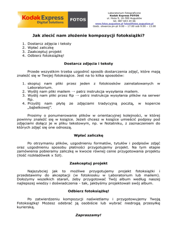 Laboratorium Fotograficzne Kodak Express FOTOS ul. Hoża 9, 16-300 Augustów tel. 087 643 24 66 www.fotos.augustow.pl [email protected] Godz. otwarcia pn-pt 9.00 – 17.00 sob 9.00 – 13.00 Jak zlecić nam złożenie kompozycji fotoksiążki? 1. 2. 3. 4. Dostarcz zdjęcia i teksty Wpłać zaliczkę Zaakceptuj projekt Odbierz fotoksiążkę! Dostarcz zdjęcia i teksty Przede wszystkim trzeba uzgodnić sposób dostarczenia zdjęć, które mają znaleźć się w Twojej fotoksiążce. Jest na to kilka sposobów: 1. skopiuj nam pliki przez jeden z fotokiosków zainstalowanych w Laboratorium. 2. Wyślij nam pliki mailem → patrz instrukcja wysyłania mailem. 3. Wyślij nam pliki przez ftp → patrz instrukcja wysyłania plików na serwer ftp. 4. Przyślij nam płytę ze zdjęciami tradycyjną pocztą, w kopercie „bąbelkowej”. Prosimy o powinny znaleźć zdjęciami dołącz których zdjęć się ponumerowanie plików w orientacyjnej kolejności, w której się w książce. Jeżeli chcesz w książce umieścić podpisy pod je w pliku tekstowym, np. w Notatniku, z zaznaczeniem do one odnoszą. Wpłać zaliczkę Po otrzymaniu plików, uzgodnieniu formatów, tytułów i podpisów zdjęć oraz uzgodnieniu sposobu płatności przygotujemy projekt. Na tym etapie zamówienia pobieramy zaliczkę w kwocie równej cenie przygotowania projektu (ilość rozkładówek x 5zł). Zaakceptuj projekt Najszybciej jak to możliwe przygotujemy projekt fotoksiążki i przedstawimy do akceptacji (w fotokiosku w Laboratorium lub mailem). Dołożymy wszelkich starań, żeby przygotować Twój album według naszej najlepszej wiedzy i doświadczenia - tak, jakbyśmy projektowali swój album. Odbierz fotoksiążkę! Po zatwierdzeniu kompozycji naświetlamy i przygotowujemy Twoją Fotoksiążkę! Możesz odebrać ją osobiście lub wybrać niedrogą przesyłkę kurierską. Zapraszamy!