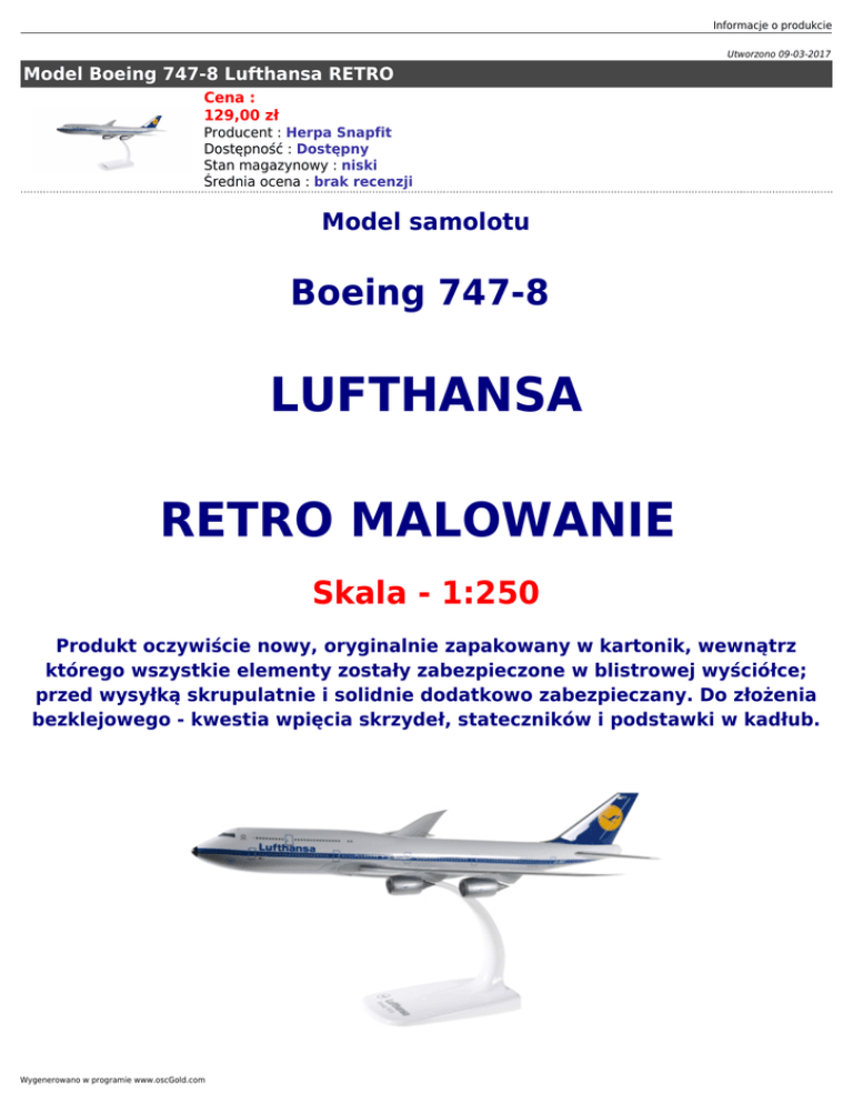 Informacje o produkcie Utworzono 09-03-2017 Model Boeing 747-8 Lufthansa RETRO Cena : 129,00 zł Producent : Herpa Snapfit Dostępność : Dostępny Stan magazynowy : niski Średnia ocena : brak recenzji Model samolotu Boeing 747-8 LUFTHANSA RETRO MALOWANIE Skala - 1:250 Produkt oczywiście nowy, oryginalnie zapakowany w kartonik, wewnątrz którego wszystkie elementy zostały zabezpieczone w blistrowej wyściółce; przed wysyłką skrupulatnie i solidnie dodatkowo zabezpieczany. Do złożenia bezklejowego - kwestia wpięcia skrzydeł, stateczników i podstawki w kadłub. Wygenerowano w programie www.oscGold.com Wymiary modelu: - Długość 30 cm PRODUCENT - HERPA SNAPFIT