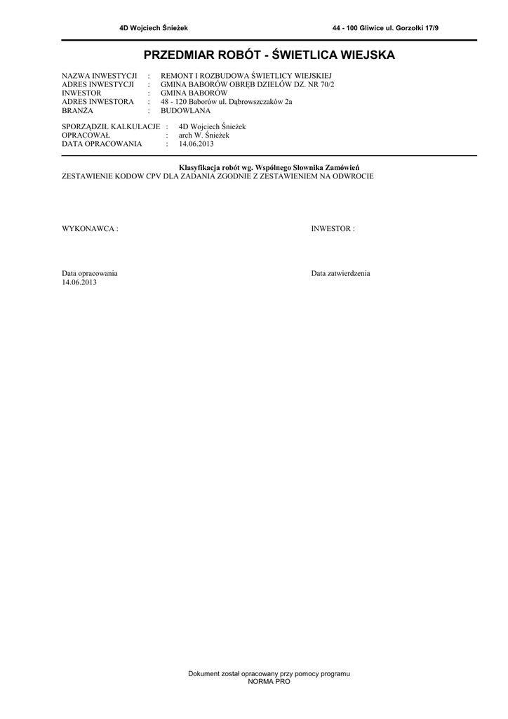 4D Wojciech Śnieżek 44 - 100 Gliwice ul. Gorzołki 17/9 PRZEDMIAR ROBÓT - ŚWIETLICA WIEJSKA NAZWA INWESTYCJI ADRES INWESTYCJI INWESTOR ADRES INWESTORA BRANŻA : : : : : REMONT I ROZBUDOWA ŚWIETLICY WIEJSKIEJ GMINA BABORÓW OBRĘB DZIELÓW DZ. NR 70/2 GMINA BABORÓW 48 - 120 Baborów ul. Dąbrowszczaków 2a BUDOWLANA SPORZĄDZIŁ KALKULACJE : OPRACOWAŁ : DATA OPRACOWANIA : 4D Wojciech Śnieżek arch W. Śnieżek 14.06.2013 Klasyfikacja robót wg. Wspólnego Słownika Zamówień ZESTAWIENIE KODOW CPV DLA ZADANIA ZGODNIE Z ZESTAWIENIEM NA ODWROCIE WYKONAWCA : INWESTOR : Data opracowania 14.06.2013 Data zatwierdzenia Dokument został opracowany przy pomocy programu NORMA PRO OGÓLNA CHARAKTERYSTYKA OBIEKTU KLASYFIKACJA WG KODÓW CPV CPV 45000000-7 Roboty budowlane CPV 45262690-4 Remont starych budynków CPV 45453000-7 Roboty remontowe i renowacyjne CPV 45110000-1 Roboty demontażowe i rozbiórkowe CPV 45113000-2 Roboty na placu budowy CPV 45262100-2 Roboty przy wznoszeniu rusztowań CPV 45262110-5 Demontaż rusztowań CPV 45262500-6 Roboty murarskie CPV 45331210-1 Instalowanie wentylacji CPV 45421141-4 Instalowanie przegród CPV 45262310-7 Zbrojenie CPV 45262300-4 Betonowanie CPV 45262311-4 Betonowanie konstrukcji CPV 45223500-1 Konstrukcje betonowe i żelbetowe CPV 45422000-1 Roboty ciesielskie drewniane CPV 45442300-0 Roboty w zakresie ochrony powierzchni CPV 20322000-9 Konstrukcje dachowe CPV 20310000-2 Drewniane wyroby stolarskie dla budów CPV 45422000-1 Konstrukcje drewniane CPV 45321000-3 Izolacja cieplna CPV 45261410-1 Izolowanie dachu CPV 45260000-7 Roboty w zakresie wykonania pokryć i konstrukcji dachowych CPV 45261211-6 Kładzenie płytek dachowych CPV 45261400-8 Pokrywanie CPV 45261420-4 Uszczelnianie dachu CPV 45261900-3 Naprawa i konserwacja dachów CPV 45261320-3 Wykonywanie robót blacharskich CPV 45261320-3 Kładzenie rynien CPV 45232460-4 Roboty sanitarne CPV 45310000-3 Roboty instalacyjne elektryczne CPV 45400000-1 Roboty wykończeniowe w zakresie obiektów budowlanych CPV 45430000-0 Pokrywanie podłóg i ścian CPV 45410000-4 Tynkowanie CPV 45442100-8 Roboty malarskie CPV 45421100-5 Instalowanie drzwi i okien, i podobnych elementów CPV 45443000-4 Roboty elewacyjne CPV 45324000-4 Roboty w zakresie okładziny tynkowej OGÓLNA CHARAKTERYSTYKA ZADANIA Przedmiotem inwestycji jest rozbudowa istniejącej świetlicy wiejskiej o obiekt murowanego zaplecza sanitarno - technicznego. Inwestycja przeznaczona jest do celów wypoczynku, rekreacji. Przewiduje się kompleksową realizacje przedmiotu inwestycji w zakresie: - budowę murowanego budynku zaplecza świetlicy. - budowę ciągów komunikacyjnych pieszych - budowę infrastruktury technicznej podziemnej: kanalizacja sanitarna ze szczelnym zbiornikiem wybieralnym [wymiana istniejących] , - kompleksowy remont wszystkich instalacji wewnętrznych obiektu istniejącego - remont ogólnobudowlany wszystkich pomieszczeń świetlicy - wymianę całej stolarki okiennej i drzwiowej - remont elewacji z iniekcją ciśnieniową przy zastosowaniu emulsji silikonowej W zakresie zaplecza budynku zaplecza świetlicy projektuje się wykonanie fundamentów żelbetowych, ścian murowanych, dachu trójspadowego oraz kompletne wyposażenie obiektu w instalacje [wg projektów branżowych] i w wyposażenie ruchome przewidziane programem. Lokalizacja: GMINA BABORÓW OBRĘB DZIELÓW, DZ. NR 70/2 Inwestor: GMINA BABORÓW 48-120 Baborów ul. Dąbrowszczaków 2a Parametry techniczne systemowego budynku zaplecza: Obiekt niski [N], dwie kondygnacje nadziemna. Świetlica istniejąca: Szerokość: 12,33m -2- Norma PRO Wersja 4.25 OGÓLNA CHARAKTERYSTYKA OBIEKTU Długość: 14,81m Wysokość: - okap: 4,35 m - w najwyższym miejscu - kalenica: 9,40 m - w najwyższym miejscu Powierzchnia zabudowy 182,61 m2 Powierzchnia użytkowa 135,34 m2 Kubatura wewnętrzna 416,85 m3 Zaplecze projektowane: Szerokość: 8,17m Długość: 4,38m Wysokość: - okap: 3,40 m - kalenica: 7,65 m Powierzchnia zabudowy 35,78 m2 Powierzchnia użytkowa 27,91 m2 Kubatura wewnętrzna razem z pustą nad sufitem 83,73+1/3*29,86 m2*4,20m = 125,12 m3 OPIS ZAKRESU DO REALIZACJI BUDYNEK ZAPLECZA Obiekt jednokondygnacyjny bez podpiwniczenia zaprojektowano jako konstrukcję murowaną. Zastosowane rozwiązania konstrukcyjne zawarte w projekcie wynikają z typowych systemowych rozwiązań tego typu wielkości obiektów o prostej konstrukcji. Nowoczesna forma architektoniczna jest atrakcyjna, a także umożliwia zapewnienie komfortu użytkowania. Zastosowano naturalne ekologiczne materiały łatwo wpisujące sie w dowolne otoczenie. Wykończenie elewacji nawiązuje do otoczenia.. Posadowienie obiektu: Warunki gruntowe umożliwiły zaprojektowanie posadowienia bezpośredniego, na warstwie rodzimej gruntu. Poziom posadowienia fundamentów pod budynek przewidziano na głębokości -1,30m poniżej poziomu posadzki obiektu projektowanego i -1,20m poniżej poziomu terenu. Poziom wód gruntowych zlokalizowano poniżej poziomu posadowienia. Kategoria geotechniczna obiektu i warunki geologiczne posadowienia -w kategorii pierwszej. Nie wykonuje się zabezpieczeń przed wpływami eksploatacji górniczej - nie występuje na terenie inwestycji. Fundamenty: Ławy fundamentowe liniowe monolityczne żelbetowe: beton B20, stal 34GS o wym. 40*30cm Ściany fundamentowe z bloczków betonowych gr. 24 cm ocieplane styrodurem gr. 5 cm Pod ławami fundamentowymi- "chudy" beton - 100 mm z betonu B10. WYMIARY ZEWNĘTRZNE: Długość: 8200mm Szerokość: 4600mm Wysokość* Szerokość ławy ; 300*400 mm POSADZKI: Tradycyjne wylewane z izolacjami przeciwwodnymi w układzie zgodnym z częścią rysunkową. Wykończenie płytkami gresowymi barwionymi w masie, antypoślizgowymi i deskami podłogowymi. ŚCIANY ZEWNĘTRZNE: Murowane z bloczków gazobetonu gr. 36,50 cm w układzie jednowarstwowym na zaprawie ciepłej. Sposób tynkowania i płytkowania zgd. z częścią rysunkową. Zabezpieczenie konstrukcji drewnianej dachu - wszy