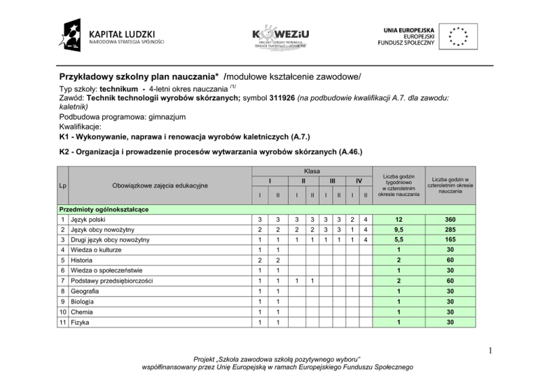 Przykładowy szkolny plan nauczania* /modułowe kształcenie zawodowe/ Typ szkoły: technikum - 4-letni okres nauczania /1/ Zawód: Technik technologii wyrobów skórzanych; symbol 311926 (na podbudowie kwalifikacji A.7. dla zawodu: kaletnik) Podbudowa programowa: gimnazjum Kwalifikacje: K1 - Wykonywanie, naprawa i renowacja wyrobów kaletniczych (A.7.) K2 - Organizacja i prowadzenie procesów wytwarzania wyrobów skórzanych (A.46.) Klasa I II I II I II I II Liczba godzin tygodniowo w czteroletnim okresie nauczania 1 Język polski 3 3 3 3 3 3 2 4 12 360 2 Język obcy nowożytny 2 2 2 2 3 3 1 4 9,5 285 3 Drugi język obcy nowożytny 1 1 1 1 1 1 1 4 5,5 165 4 Wiedza o kulturze 1 1 1 30 5 Historia 2 2 2 60 6 Wiedza o społeczeństwie 1 1 1 30 7 Podstawy przedsiębiorczości 1 1 2 60 8 Geografia 1 1 1 30 9 Biologia 1 1 1 30 10 Chemia 1 1 1 30 11 Fizyka 1 1 1 30 Lp I Obowiązkowe zajęcia edukacyjne II III IV Liczba godzin w czteroletnim okresie nauczania Przedmioty ogólnokształcące 1 1 1 Projekt „Szkoła zawodowa szkołą pozytywnego wyboru” współfinansowany przez Unię Europejską w ramach Europejskiego Funduszu Społecznego 2 1 30 12 360 1 30 4 120 65 1950 6 8 240 1 3 6 180 2 2 2 4 120 5 5 11 18 540 8 240 21 630 9 270 12 360 50 1500 133 3990 2 13 Informatyka 1 1 14 Wychowanie fizyczne 3 3 15 Edukacja dla bezpieczeństwa 1 1 16 Zajęcia z wychowawcą 1 1 1 1 23 23 13 13 14 14 10 20 2 2 2 2 2 2 2 1 1 2 5 3 3 3 300 2 Łączna liczba godzin 2 10 12 Matematyka 3 3 3 1 1 2 4 3 3 1 1 Przedmioty realizowane w zakresie rozszerzonym oraz uzupełniające 1 Chemia 2 Matematyka 1 1 3 Historia i społeczeństwo - przedmiot uzupełniający Łączna liczba godzin 1 1 9 7 4 4 Modułowe kształcenie zawodowe 1 M1 Przygotowanie do prowadzenia działalności usługowej 2 M2 Wytwarzanie wyrobów kaletniczych 2 18 3 M3 Wykonywanie napraw wyrobów kaletniczych 4 M4 Organizowanie procesów wytwarzania wyrobów skórzanych Łączna liczba godzin kształcenia zawodowego Tygodniowy wymiar godzin obowiązkowych zajęć edukacyjnych 18 4 11 7 8 9 9 33 18 35 16 18 15 15 16 34 31 0 /1/ do celów obliczeniowych przyjęto 30 tygodni w ciągu jednego roku szkolnego *w szkolnym planie uwzględnia się również wymiar godzin zajęć określonych w par. 4 ust. 2 rozporządzenia w sprawie ramowych planów nauczania, t.j. m.in. religii lub etyki oraz wychowania do życia w rodzinie. 2 Projekt „Szkoła zawodowa szkołą pozytywnego wyboru” współfinansowany przez Unię Europejską w ramach Europejskiego Funduszu Społecznego Wymiar praktyk zawodowych tyg. kl. I - zgodnie z podstawą programową godz. 0 kl. II - zgodnie z podstawą programową kl. III - zgodnie z podstawą programową 4 kl. IV - zgodnie z podstawą programową 160 0 Razem 4 160 Egzamin potwierdzający pierwszą kwalifikację (A.7.) odbywa się pod koniec klasy trzeciej. Egzamin potwierdzający drugą kwalifikację (A.46.) odbywa się pod koniec pierwszego semestru klasy czwartej. 3 Projekt „Szkoła zawodowa szkołą pozytywnego wyboru” współfinansowany przez Unię Europejską w ramach Europejskiego Funduszu Społecznego Tabela efektów kształcenia Tabela przyporządkowania poszczególnym modułom efektów kształcenia dla zawodu: Liczba godzin przeznaczona na realizację efektów kształcenia II semestr I semestr IV II semestr III I semestr II II semestr I I semestr Uczeń: klasa II semestr Efekty kształcenia /umiejętności, wiedza oraz kompetencje personalne i społeczne/ Efekty wspólne dla wszystkich zawodów / wspólne dla zawodów w ramach obszaru A / kwalifikacje I semestr Numer i nazwa jednostki modułowej Numer i nazwa modułu Technik technologii wyrobów skórzanych; symbol 311926 (na podbudowie kwalifikacji A.7. dla zawodu: kaletnik) 311926(753702)M1.J1 Przestrzeganie zasad bezpieczeństwa i higieny pracy 311926(753702)M1 Przygotowanie do prowadzenia działalności usługowej Kształcenie modułowe BHP(1) rozróżnia pojęcia związane z bezpieczeństwem i higien ochroną przeciwpożarową, ochroną środowiska i ergonomią; X BHP(2) rozróżnia zadania i uprawnienia instytucji oraz służb działających w zakresie ochrony pracy i ochrony środowiska w Polsce; X BHP(3) określa prawa i obowiązki pracownika oraz pracodawcy w zakresie bezpieczeństwa i higieny pracy; X BHP(4) przewiduje zagrożenia dla zdrowia i życia człowieka oraz mienia i środowiska związane z wykonywaniem zadań zawodowych; BHP(5) określa zagrożenia związane z występowaniem szkodliwych czynników w środowisku pracy; BHP(6) określa skutki oddziaływania czynników szkodliwych na organizm człowieka; 25 BHP X X X 4 Projekt „Szkoła zawodowa szkołą pozytywnego wyboru” współfinansowany przez Unię Europejską w ramach Europejskiego Funduszu Społecznego BHP(7) organizuje stanowisko pracy zgodnie z obowiązującymi wymaganiami ergonomii, przepisami bezpieczeństwa i higieny pracy, ochrony przeciwpożarowej i ochrony środowiska; X BHP(8) stosuje środki ochrony indywidualnej i zbiorowej podczas wykonywania zadań zawodowych; BHP(9) przestrzega zasad bezpieczeństwa i higieny pracy oraz stosuje przepisy prawa dotyczące ochrony przeciwpożarowej i ochrony środowiska; BHP(10) udziela pierwszej pomocy poszkodowanym w wypadkach przy pracy oraz w stanach zagrożenia zdrowia i życia. X X X 311926(753702)M1J3 Podejmowanie i prowadzenie działalności usługowej 311926(753702)M1.J2 Wykonywanie rysunku zawodowego Łączna liczba godzin przeznaczona na jednostkę modułową M1.J1 KPS(2) jest kreatywny i konsekwentny w realizacji zadań; KPS(4) jest otwarty na zmiany KPS(7) przestrzega tajemnicy zawodowej; PKZ(A.e)(1) wykonuje rysunki wyrobów skórzanych; PKZ(A.e)(8) odczytuje oznaczenia i symbole stosowane w rysunkach technicznych; PKZ(A.e)(11) stosuje programy komputerowe wspomagające wykonywanie zadań; KPS PKZ(A.e) X X X X X X X X X X X X Łączna liczba godzin przeznaczona na jednostkę modułową M1.J2 KPS(1) przestrzega zasad kultury i etyki; KP
