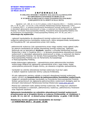 WYBORY PREZYDENTA RP. zarządzone na dzień 10 MAJA 2015 R. INFORMACJA W SPRAWIE SPOSOBU I TERMINU ZGŁASZANIA KANDYDATÓW DO OBWODOWYCH KOMISJI WYBORCZYCH W WYBORACH PREZYDENTA RZECZYPOSPOLITEJ POLSKIEJ ZARZĄDZONYCH NA DZIEŃ 10 MAJA 2015 R. Zgodnie z art. 182, § 1-2, § 4-6 ustawy z dnia 5 stycznia 2011 r. – Kodeks wyborczy (Dz. U. Nr 21, poz. 112 ze zm.) oraz Uchwały Państwowej Komisji Wyborczej z dnia 11 kwietnia 2011 r. w sprawie powoływania obwodowych komisji wyborczych w wyborach w obwodach głosowania utworzonych w kraju, w wyborach do Sejmu Rzeczypospolitej Polskiej i do Senatu Rzeczypospolitej Polskiej, Prezydenta Rzeczypospolitej Polskiej oraz do Parlamentu Europejskiego w Rzeczypospolitej Polskiej (M.P. Nr 30, poz.345 ) – informuje się wyborców: - zgłoszeń kandydatów do obwodowych komisji wyborczych mogą dokonać wyłącznie pełnomocnicy komitetów wyborczych, które zarejestrowały kandydatów na Prezydenta RP. lub upoważnione przez nich osoby, - pełnomocnik wyborczy (lub upoważniona przez niego osoba) może zgłosić tylko po jednym kandydacie do każdej obwodowej komisji wyborczej. Zgłoszeń dokonuje się na specjalnych drukach, zgodnie z uchwałą Państwowej Komisji Wyborczej z dnia 11 kwietnia 2011 r. w sprawie powoływania obwodowych komisji wyborczych w obwodach głosowania utworzonych w kraju, w wyborach do Sejmu Rzeczypospolitej Polskiej i do Senatu Rzeczypospolitej Polskiej, Prezydenta Rzeczypospolitej Polskiej oraz do Parlamentu Europejskiego w Rzeczypospolitej Polskiej, -osoba dokonująca zgłoszenia – upoważniona przez pełnomocnika komitetu wyborczego dołącza do zgłoszenia upoważnienie wraz z jego kopią. Kopię uwierzytelnia pracownik Urzędu Gminy, po okazaniu oryginału upoważnienia, - kandydat na członka obwodowej komisji wyborczej musi być ujęty w stałym rejestrze wyborców Gminy Lubycza Królewska, - W celu zgłoszenia zamiaru udziału w pracach obwodowej komisji wyborczej, należy zwrócić się bezpośrednio do pełnomocników komitetów wyborczych, mających zarejestrowanego kandydata na Prezydenta Rzeczypospolitej Polskiej. Wykaz uprawnionych do zgłaszania pełnomocników wyborczych dostępny jest na stronach internetowych Państwowej Komisji Wyborczej (www.pkw.gov.pl), - Można być członkiem tylko jednej komisji wyborczej. Nie mogą być członkami komisji kandydaci w wyborach, pełnomocnicy wyborczy, pełnomocnicy finansowi oraz mężowie zaufania. Zgłoszenia kandydatów na członków obwodowych komisji wyborczych przyjmowane są w Urzędzie Gminy w Lubyczy Królewskiej, ul. Kolejowa 1, w pok. Nr 11, lub 16 w dniach pracy Urzędu Gminy w godz. 7.00-15.00. Ostateczny termin zgłaszania kandydatów do komisji – - 17 KWIETNIA 2015 r. do godz. 15.00.
