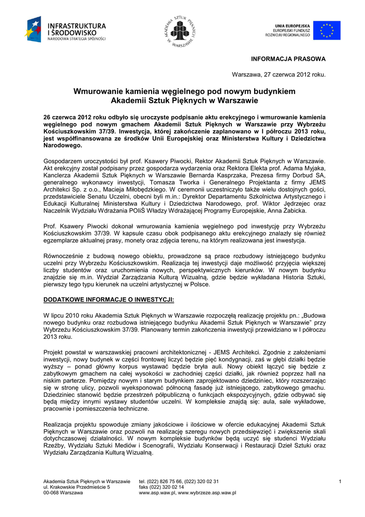 INFORMACJA PRASOWA Warszawa, 27 czerwca 2012 roku. Wmurowanie kamienia węgielnego pod nowym budynkiem Akademii Sztuk Pięknych w Warszawie 26 czerwca 2012 roku odbyło się uroczyste podpisanie aktu erekcyjnego i wmurowanie kamienia węgielnego pod nowym gmachem Akademii Sztuk Pięknych w Warszawie przy Wybrzeżu Kościuszkowskim 37/39. Inwestycja, której zakończenie zaplanowano w I półroczu 2013 roku, jest współfinansowana ze środków Unii Europejskiej oraz Ministerstwa Kultury i Dziedzictwa Narodowego. Gospodarzem uroczystości był prof. Ksawery Piwocki, Rektor Akademii Sztuk Pięknych w Warszawie. Akt erekcyjny został podpisany przez gospodarza wydarzenia oraz Rektora Elekta prof. Adama Myjaka, Kanclerza Akademii Sztuk Pięknych w Warszawie Bernarda Kasprzaka, Prezesa firmy Dorbud SA, generalnego wykonawcy inwestycji, Tomasza Tworka i Generalnego Projektanta z firmy JEMS Architekci Sp. z o.o., Macieja Miłobędzkiego. W ceremonii uczestniczyło także wielu dostojnych gości, przedstawiciele Senatu Uczelni, obecni byli m.in.: Dyrektor Departamentu Szkolnictwa Artystycznego i Edukacji Kulturalnej Ministerstwa Kultury i Dziedzictwa Narodowego, prof. Wiktor Jędrzejec oraz Naczelnik Wydziału Wdrażania POIiŚ Władzy Wdrażającej Programy Europejskie, Anna Żabicka. Prof. Ksawery Piwocki dokonał wmurowania kamienia węgielnego pod inwestycję przy Wybrzeżu Kościuszkowskim 37/39. W kapsule czasu obok podpisanego aktu erekcyjnego znalazły się również egzemplarze aktualnej prasy, monety oraz zdjęcia terenu, na którym realizowana jest inwestycja. Równocześnie z budową nowego obiektu, prowadzone są prace rozbudowy istniejącego budynku uczelni przy Wybrzeżu Kościuszkowskim. Realizacja tej inwestycji daje możliwość przyjęcia większej liczby studentów oraz uruchomienia nowych, perspektywicznych kierunków. W nowym budynku znajdzie się m.in. Wydział Zarządzania Kulturą Wizualną, gdzie będzie wykładana Historia Sztuki, pierwszy tego typu kierunek na uczelni artystycznej w Polsce. DODATKOWE INFORMACJE O INWESTYCJI: W lipcu 2010 roku Akademia Sztuk Pięknych w Warszawie rozpoczęłą realizację projektu pn.: „Budowa nowego budynku oraz rozbudowa istniejącego budynku Akademii Sztuk Pięknych w Warszawie” przy Wybrzeżu Kościuszkowskim 37/39. Planowany termin zakończenia inwestycji przewidziano w I półroczu 2013 roku. Projekt powstał w warszawskiej pracowni architektonicznej - JEMS Architekci. Zgodnie z założeniami inwestycji, nowy budynek w części frontowej liczyć będzie pięć kondygnacji, zaś w głębi działki będzie wyższy – ponad główny korpus wystawać będzie bryła auli. Nowy obiekt łączyć się będzie z zabytkowym gmachem na całej wysokości w zachodniej części działki, jak również poprzez hall na niskim parterze. Pomiędzy nowym i starym budynkiem zaprojektowano dziedziniec, który rozszerzając się w stronę ulicy, pozwoli wyeksponować północną fasadę już istniejącego, zabytkowego gmachu. Dziedziniec stanowić będzie przestrzeń półpubliczną o funkcjach ekspozycyjnych, gdzie odbywać się będą między innymi wystawy studentów uczelni. W kompleksie znajdą się: aula, sale wykładowe, pracownie i pomieszczenia techniczne. Realizacja projektu spowoduje zmiany jakościowe i ilościowe w ofercie edukacyjnej Akademii Sztuk Pięknych w Warszawie oraz pozwoli na realizację szeregu nowych przedsięwzięć i zwiększenie skali dotychczasowej działalności. W nowym kompleksie budynków będą uczyć się studenci Wydziału Rzeźby, Wydziału Sztuki Mediów i Scenografii, Wydziału Konserwacji i Restauracji Dzieł Sztuki oraz Wydziału Zarządzania Kulturą Wizualną. Akademia Sztuk Pięknych w Warszawie ul. Krakowskie Przedmieście 5 00-068 Warszawa tel. (022) 826 75 66, (022) 320 02 31 faks (022) 320 02 14 www.asp.waw.pl, www.wybrzeze.asp.waw.pl 1 Całkowita wartość projektu wynosi 65 542 248,26 zł. Inwestycja odpowiada ściśle kryteriom działania 11.3 „Infrastruktura szkolnictwa artystycznego” Programu Operacyjnego Infrastruktura i Środowisko, w którym przewidziano do realizacji projekty polegające w szczególności na budowie, rozbudowie oraz remontach szkół i uczelni artystycznych. Projekt dofinansowany został z Europejskiego Funduszu Rozwoju Regionalnego (kwota: 41 142 507,79 zł – 62,77%) oraz otrzymał dotację celową z Ministerstwa Kultury i Dziedzictwa Narodowego (kwota: 24 399 740,47 zł – 37,23%). Podstawowe informacje o inwestycji: Termin rozpoczęcia prac: 15 kwietnia 2011 roku Termin zakończenia prac: I półrocze 2013 roku Autor projektu architektonicznego: JEMS Architekci Sp. z o.o. (Warszawa) Generalny wykonawca: Konsorcjum firm: DORBUD SA (Kielce) oraz Przedsiębiorstwo Budowlano-Usługowe INTERBUD - WEST Sp. z o.o. (Gorzów Wielkopolski) Inwestor zastępczy: Project Management Intertecno Sp. z o.o. (Warszawa) Akademia Sztuk Pięknych w Warszawie – najważniejsze dane: Akademia Sztuk Pięknych w Warszawie jest jedną z siedmiu państwowych uczelni wyższych tego typu w Polsce. W roku akademickim 2011/2012 studiuje na niej, w trybie stacjonarnym i niestacjonarnym 1450 studentek i studentów, na siedmiu wydziałach: Wydział Malarstwa, Wydział Rzeźby, Wydział Grafiki, Wydział Konserwacji i Restauracji Dzieł Sztuki, Wydział Architektury Wnętrz, Wydział Wzornictwa, Wydział Sztuki Mediów i Scenografii. Stworzony został Wydział Zarządzania Kulturą Wizualną. Więcej informacji udzielają: Katarzyna Błesznowska Rzecznik Prasowy Akademia Sztuk Pięknych w Warszawie ul. Krakowskie Przedmieście 5, 00-068 Warszawa tel. 22 320 02 72, 515 06 37 68 e-mail: [email protected] Akademia Sztuk Pięknych w Warszawie ul. Krakowskie Przedmieście 5 00-068 Warszawa Magdalena Drożdż Reputation Managers Sp. z o.o. ul. Dygasińskiego 44, 01-603 Warszawa tel. 22 887 07 28, 509 61 88 99 e-mail:[email protected]; [email protected] tel. (022) 826 75 66, (022) 320 02 31 faks (022) 3
