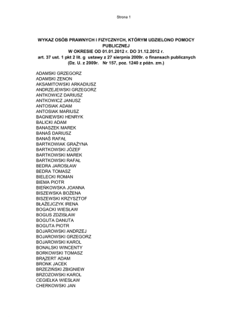 Strona 1 WYKAZ OSÓB PRAWNYCH I FIZYCZNYCH, KTÓRYM UDZIELONO POMOCY PUBLICZNEJ W OKRESIE OD 01.01.2012 r. DO 31.12.2012 r. art. 37 ust. 1 pkt 2 lit. g ustawy z 27 sierpnia 2009r. o finansach publicznych (Dz. U. z 2009r. Nr 157, poz. 1240 z późn. zm.) ADAMSKI GRZEGORZ ADAMSKI ZENON AKSAMITOWSKI ARKADIUSZ ANDRZEJEWSKI GRZEGORZ ANTKOWICZ DARIUSZ ANTKOWICZ JANUSZ ANTOSIAK ADAM ANTOSIAK MARIUSZ BAGNIEWSKI HENRYK BALICKI ADAM BANASZEK MAREK BANAŚ DARIUSZ BANAŚ RAFAŁ BARTKOWIAK GRAŻYNA BARTKOWSKI JÓZEF BARTKOWSKI MAREK BARTKOWSKI RAFAŁ BEDRA JAROSŁAW BEDRA TOMASZ BIELECKI ROMAN BIEMA PIOTR BIEŃKOWSKA JOANNA BISZEWSKA BOŻENA BISZEWSKI KRZYSZTOF BŁAŻEJCZYK IRENA BOGACKI WIESŁAW BOGUS ZDZISŁAW BOGUTA DANUTA BOGUTA PIOTR BOJAROWSKI ANDRZEJ BOJAROWSKI GRZEGORZ BOJAROWSKI KAROL BONALSKI WINCENTY BORKOWSKI TOMASZ BRĄZERT ADAM BRONK JACEK BRZEZIŃSKI ZBIGNIEW BRZOZOWSKI KAROL CEGIEŁKA WIESŁAW CHERKOWSKI JAN Strona 2 CHĘĆ TOMASZ CHMIELEWSKI ANDRZEJ CHMIELEWSKI JAN CHODUBSKI DARIUSZ CHOJNACKI STANISŁAW CICHACZEWSKA ANNA CIEŚLAK KRYSTYNA CYGAŃSKI JACEK CZAJKOWSKI ANDRZEJ CZAJKOWSKI BOGDAN CZARNOWSKI EDWARD CZYŻEWSKI LEONARD DAWID MIROSŁAW DĄBROWSKI MIROSŁAW DĄBROWSKI PIOTR DEPTUŁA ROBERT DŁUGOKIŃSKI WOJCIECH DOBROWOLSKI ANDRZEJ DOLIŃSKI JANUSZ DOLIŃSKI JERZY DOLIŃSKI PAWEŁ DOLNA ANNA DOMOZYCH DANIEL DOMŻALSKI TADEUSZ DRAMIŃSKA RENATA DRAMIŃSKI KRZYSZTOF DROPIEWSKA JADWIGA DUDA JAN DUDALSKI ANDRZEJ DUDEK JAN DUTKOWSKI ALEKSANDER DYMCZYK MAREK FILIP GRAŻYNA FLOREK JÓZEF FLOREK MICHAŁ FREJNIK KAROL GAJEWSKI JERZY GALICKI ANDRZEJ GAWENDA JAROSŁAW GESEK JERZY GIESEK BENEDYKT GIESEK MARIUSZ GŁADYSZEWSKA ANNA GODLEWSKI ANDRZEJ GÓRNECKI CEZARY GÓRNECKI KAROL GROBLEWSKI LESZEK Strona 3 GRODKOWSKA RENATA GROSZ ANDRZEJ GROSZ KRZYSZTOF GROSZEK STANISŁAW GRZEBSKI JAN GRZEGRZÓŁKA JERZY GRZELA SŁAWOMIR GWIAZDA PAULINA HUNTER SAFES SP. Z O.O. IWAN HALINA JABŁOŃSKI GRZEGORZ JACKOWSKI JAN JANISZEWSKI JÓZEF JANKOWSKI ZYGMUNT JAROS JOANNA JAROS STANISŁAW JAROSZEWSKI BOGDAN JARZYNKA ADAM JARZYNKA GRZEGORZ JARZYNKA MICHAŁ JÓZEFOWICZ ADAM KACPRZYCKA ALEKSANDRA KACZMARCZYK ARKADIUSZ KACZMARCZYK JANUSZ KACZMARSKI WIESŁAW KAMIŃSKA EDYTA KAMIŃSKA HANNA KAMIŃSKA IRENA KAMIŃSKI LESZEK KAMIŃSKI WOJCIECH KARBOWSKI DARIUSZ KARBOWSKI TOMASZ KARKUT ALEKSANDRA KARPIŃSKA MARIOLA KARPIŃSKI PIOTR KASZUBA JERZY KASZUBA TOMASZ KASZUBA WALDEMAR KAŹMIERCZAK JANUSZ KĘPKA PIOTR KIECZMERSKI JÓZEF KIERSZNIEWSKI TADEUSZ KIŃSKA JADWIGA KLONOWSKI WIESŁAW KŁOS WOJCIECH KOCIELA EWA KOCIELA PIOTR Strona 4 KOŁKOWSKI MIECZYSŁAW KOŁODZIEJSKI RYSZARD KOMOROWSKI BOGDAN KOPYCIŃSKI DANIEL KORONA TADEUSZ KOŚCIŃSKI JANUSZ KOWALKOWSKI ANDRZEJ KOWALKOWSKI PIOTR KOWALSKA ALINA KOWALSKI ARKADIUSZ KOWALSKI JÓZEF KOWALSKI MICHAŁ KOWALSKI SŁAWOMIR KOWALSKI ZBIGNIEW KOZIARZ MARCIN KOZŁOWSKI KRZYSZTOF KRAJEWSKI JAN KRAJEWSKI JERZY KRAJEWSKI ZYGMUNT KRAMKOWSKA BARBARA KRASIŃSKA JADWIGA KRAŚNIEWSKI KRZYSZTOF KRAŚNIK WITOLD KRYSIAK ELŻBIETA KRZEMIŃSKI BOGDAN KRZYWICKA BARBARA KRZYŻEWSKI ANDRZEJ KUCIŃSKI MAREK KULCZYŃSKI PIOTR KULIŃSKI WOJCIECH KUSKOWSKI ROMAN KUŚPIEL FRANCISZEK LELIWA ZDZISŁAW LEMPEK PAWEŁ LEWANDOWSKA MARLENA LEWANDROWSKA JADWIGA LINEK JAN LIPKA EDWARD LIPOWSKA JADWIGA LIPOWSKA MICHALINA LIPOWSKI MICHAŁ LIPOWSKI WOJCIECH LIS WALDEMAR ŁACHACZ ADAM ŁAKATYSZEWSKI TOMASZ ŁOZIŃSKI PAWEŁ MACHAŁOWSKA BEATA Strona 5 MACIEJEWSKI MAREK MACIEJEWSKI MARIUSZ MALINOWSKI PAWEŁ MARCINKOWSKI DANIEL MARGALSKA AGNIESZKA MARKOWSKA WIOLETA MARKOWSKI ADAM MARUSZAK-WEBSTER JUSTYNA MAZUROWSKA BERNADETA MELVIT S.A. MIKOŁAJSKI ANDRZEJ MILEWSKI STANISŁAW MILEWSKI WOJCIECH MODZELEWSKI WOJCIECH MÓWIŃSKI ROMAN NADWODNA ANNA NASIADKA ANDRZEJ NIEWIADOMSKA MAGDALENA NIŚCIGORSKI SŁAWOMIR NOWAKOWSKA MAGDALENA NOWOSIELSKA ANNA OJDOWSKI MAREK ORZECHOWSKI WALDEMAR OSSOWSKI BOGDAN OSTROWSKA BARBARA OSTROWSKI DARIUSZ OSTROWSKI JAN OSTROWSKI KAZIMIERZ PACIOREK TERESA PACZKOWSKI DANIEL PAJEWSKI MAREK PATALON ROMAN PAUBA DOMINIK PAW HENRYK PAW PIOTR PAWLIKOWSKA EWA PAZIK MAREK PEĆ ANDRZEJ PEĆ DOROTA PEĆ MIROSŁAW PEPEL BEATA PERGOŁ ROMAN PERGOŁ RYSZARD PIELGRZYMOWSKI PIOTR PIOTROWICZ ANTONI PIÓREK ZBIGNIEW PISAREWICZ KRZYSZTOF Strona 6 PLETA WOJCIECH PLUCHCIŃSKI ANDRZEJ PŁOCHARCZYK RYSZARD PŁOCHARSKI JAN PSIUK GRZEGORZ PUZDROWSKI TADEUSZ PYDYNKOWSKA ELŻBIETA PYDYNKOWSKI ROBERT PYDYNKOWSKI RYSZARD PYDYNKOWSKI SŁAWOMIR RADZKI KRZYSZTOF RELUGA JAN RELUGA TERESA RELUGA TOMASZ ROGOWICZ WITOLD ROGOZIŃSKI BONIFACY ROGOZIŃSKI ROBERT ROGUSZCZAK KAZIMIERZ ROŻEK MAŁGORZATA RUDZIŃSKI JAN RUSIECKI JAN RUTKOWSKI DARIUSZ RUTKOWSKI TOMASZ RYCHCIK HENRYK RYCHCIK TADEUSZ RYKACZEWSKI JAN RYSKA JÓZEF RZESZOTALSKA ANNA SAŁACH PAWEŁ SARBIEWSKI BOGUSŁAW SARBIEWSKI DARIUSZ SARNECKI PIOTR SEBASTIAN KRZYSZTOF SIEDLIŃSKI JAROSŁAW SKOROCH MARZENA SKORUPSKI WŁODZIMIERZ SKUZA WOJCIECH SŁOWIKOWSKI KRZYSZTOF SMOLIŃSKI ERWIN SMOSARSKI JÓZEF SOBIECH WOJCIECH STANKIEWICZ JANUSZ STAŃCZAK ZDZISŁAW STEFAN BOŻENA STEFANIAK JANUSZ STEMPKOWSKI HENRYK STOLARCZYK ROBERT Strona 7 STRUZIK JAN STRYJEWSKI SŁAWOMIR STRZESZEWSKI MARIAN SYGUT WIESŁAW SZARMACHER HELENA SZARMACHER KRZYSZTOF SZATKOWSKI MARCIN SZCZECH MARIAN SZCZEPANIK AGNIESZKA SZCZEPKOWSKA JOANNA SZCZYGIELSKA MARIA SZCZYGIELSKI ANDRZEJ SZCZYPIŃSKI MARIUSZ SZERSZEŃ SŁAWOMIR SZLOCH-DAWIDOWSKA MAŁGORZATA SZMIT KRZYSZTOF SZOSTEK SŁAWOMIR SZRAMOWSKI MIROSŁAW SZTUBA MARIAN SZUBIAK SEBASTIAN SZULC SŁAWOMIR SZWARC JANUSZ SZYMAŃSKA MARIANNA ŚLESIŃSKI STANISŁAW ŚLIŻEWSKI ANDRZEJ ŚLIŻEWSKI BERNARD ŚWIĄTKOWSKI JAN ŚWIDER SŁAWOMIR ŚWIDER STANISŁAW ŚWIDERSKI ANDRZEJ ŚWIĘCICKI ZDZISŁAW TATKOWSKI WIESŁAW TEODORCZAK ROMAN TEODORCZAK TOMASZ TRĄBIŃSKI PIOTR TRUSZKOWSKI JERZY TRYBUŁA JAN TRYBUŁA PAWEŁ TUCHOLSKI MAREK TUŁODZIECKI MARIUSZ ULATOWSKA BOŻENA ULIŃSKI ANDRZEJ WARDĘGA BOGUSŁAW WARMIŃSKI KAZIMIERZ WARSZAWSKIE PRZEDSIĘBIORSTWO MOSTOWE "MOSTY" S.A. WĄSIEWSKI TOMASZ WIELONGOWSKI JACEK Strona 8 WIÓRKOWSKI KRZYSZTOF WISZOWATY JAN