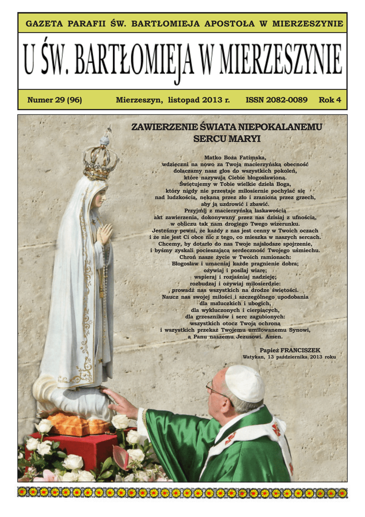 GAZETA PARAFII ŚW. BARTŁOMIEJA APOSTOŁA W MIERZESZYNIE Numer 29 (96) Mierzeszyn, listopad 2013 r. ISSN 2082-0089 Rok 4 ZAWIERZENIE ŚWIATA NIEPOKALANEMU SERCU MARYI Matko Boża Fatimska, wdzięczni na nowo za Twoją macierzyńską obecność dołączamy nasz głos do wszystkich pokoleń, które nazywają Ciebie błogosławioną. Świętujemy w Tobie wielkie dzieła Boga, który nigdy nie przestaje miłosiernie pochylać się nad ludzkością, nękaną przez zło i zranioną przez grzech, aby ją uzdrowić i zbawić. Przyjmij z macierzyńską łaskawością akt zawierzenia, dokonywany przez nas dzisiaj z ufnością, w obliczu tak nam drogiego Twego wizerunku. Jesteśmy pewni, że każdy z nas jest cenny w Twoich oczach i że nie jest Ci obce nic z tego, co mieszka w naszych sercach. Chcemy, by dotarło do nas Twoje najsłodsze spojrzenie, i byśmy zyskali pocieszającą serdeczność Twojego uśmiechu. Chroń nasze życie w Twoich ramionach: Błogosław i umacniaj każde pragnienie dobra; ożywiaj i posilaj wiarę; wspieraj i rozjaśniaj nadzieję; rozbudzaj i ożywiaj miłosierdzie: prowadź nas wszystkich na drodze świętości. Naucz nas swojej miłości i szczególnego upodobania dla maluczkich i ubogich, dla wykluczonych i cierpiących, dla grzeszników i serc zagubionych: wszystkich otocz Twoją ochroną i wszystkich przekaż Twojemu umiłowanemu Synowi, a Panu naszemu Jezusowi. Amen. Papież FRANCISZEK Watykan, 13 października 2013 roku U ŒW. BART£OMIEJA W MIERZESZYNIE - nr 29(96) listopad 2013 2 Watykan, Plac św. Piotra, 13 października 2013 DZIEŃ MARYI W Psalmie responsoryjnym powtarzaliśmy: „Śpiewajcie Panu pieśń nową, albowiem uczynił cuda” (Ps 97,1) Dziś stajemy w obliczu jednego z cudów Pana: Maryi! Stworzenia pokornego i słabego, tak jak my, wybranej by była Matką Boga, Matką swego Stworzyciela. Właśnie patrząc na Maryję, w świetle usłyszanych czytań, pragnę wraz z wami rozważyć trzy sprawy: pierwsza, Bóg nas zaskakuje; druga, Bóg żąda od nas wierności; trzecia, Bóg jest naszą siłą. 1. Pierwsza: Bóg nas zaskakuje. Historia Naamana, wodza wojska króla Aramu jest wyjątkowa: aby wyleczyć się z trądu zwraca się do Bożego proroka, Elizeusza, który nie wykonuje magicznych obrzędów ani żąda od niego czegoś nadzwyczajnego, ale jedynie zaufania Bogu i zanurzenia się w wodach rzeki. Jednakże nie w żadnej z wielkich rzek Damaszku, ale małej rzece Jordan. To żądanie wprawia Naamana w zakłopotanie, a także jest zaskoczeniem: co to za Bóg, który żąda czegoś tak prostego? Chce się wycofać, ale w końcu stawia krok, zanurza się w Jordanie i natychmiast odzyskuje zdrowie (por. 2 Krl 5,1-14). Oto Bóg nas zaskakuje. Ukazuje się właśnie w ubóstwie, w słabości, w pokorze i daje nam swoją miłość, która nas zbawia, uzdrawia i daje nam siłę. Żąda jedynie, abyśmy poszli za Jego słowem i Jemu zaufali. To jest doświadczenie Maryi Panny: w obliczu zwiastowania anielskiego nie kryje swojego zadziwienia. Jest to zdumienie, gdy widzi, że Bóg aby stać się człowiekiem wybrał właśnie ją, prostą dziewczynę z Nazaretu, która nie mieszkała w pałacach ludzi władzy i bogactwa, która nie dokonała niezwykłych czynów, ale która otwarta jest na Boga, potrafi Jemu zaufać, nawet jeśli nie wszystko rozumie: „Oto Ja służebnica Pańska, niech Mi się stanie według Twego słowa!”(Łk 1,38 ). Jest Jej odpowiedź. Bóg nas zawsze zaskakuje, łamie nasze schematy, powoduje załamanie się naszych planów i mówi: zaufaj mi, nie lękaj się, daj się zadziwić, opuść siebie i idź za Mną! Zadajmy dziś sobie pytanie, czy boimy się tego, co Bóg może ode mnie zażądać, czy tego, czego ode mnie żąda? Czy pozwalam się Bogu zaskoczyć, jak to uczyniła Maryja, czy też zamykam się w moich zabezpieczeniach, zabezpieczeniach materialnych, zabezpieczeniach intelektualnych, zabezpieczeniach ideologicznych, zabezpieczeniach w moich planach? Czy naprawdę pozwalam Bogu wejść w moje życie? Jak Jemu odpowiadam? 2. W usłyszanym fragmencie z listu św. Pawła Apostoł zwraca się do swego ucznia Tymoteusza, mówiąc mu, by pamiętał o Jezusie Chrystusie, bowiem jeśli z Nim wytrwamy, to będziemy też wraz z Nim królować (por. 2 Tym 2,8-13). Oto drugi punkt: zawsze pamiętać o Chrystusie, pamięć o Jezusie Chrystusie, to znaczy wytrwać w wierze: Bóg nas zaskakuje swoją miłością, ale żąda wierności w naśladowaniu Go. My możemy stać się „niewiernymi”, ale On nie może, On jest „wierny” i oczekuje od nas tej samej wierności. Pomyślmy, ile razy byliśmy z jakiegoś powodu rozentuzjazmowani, z powodu jakiejś inicjatywy, jakiegoś zaangażowania, ale później w obliczu pierwszych problemów poddaliśmy się. Ma to niestety także miejsce w przypadku wyborów podstawowych, takich jak małżeństwo. Trudno być stałym, wiernym podjętym decyzjom, zobowiązaniom. Często łatwo powiedzieć „tak”, ale później nie udaje się powtórzyć tego „tak” każdego dnia. Nie udaje się być wiernym. Maryja wypowiedziała swoje „tak” Bogu, „tak”, które wstrząsnęło Jej pokornym życiem w Nazarecie. Nie było to jednak jedyne, a wręcz było to tylko pierwsze z wielu „tak” wypowiedzianych w Jej sercu, w Jej chwilach radosnych, jak i tych bolesnych, wiele „tak”, których kulminacją było owo „tak” pod krzyżem. Dzisiaj jest tutaj wiele mam. Pomyślcie, jak daleko zaszła wierność Maryi wobec Boga: zobaczyć swego jedynego Syna na Krzyżu. Niewiasta wierna, u stóp, wewnętrznie zrozpaczona, lecz wierna i mocna. Stawiam sobie pytanie: czy jestem chrześcijaninem od czasu do czasu, czy też zawsze? Kultura tymczasowości, względności wkracza także do przeżywania wiary. Bóg żąda od nas, abyśmy byli Jemu wierni, każdego dnia, w działaniach codziennych i dodaje, że nawet jeśli czasami nie jesteśmy Jemu wierni, to On zawsze jest wierny i będąc miłosiern