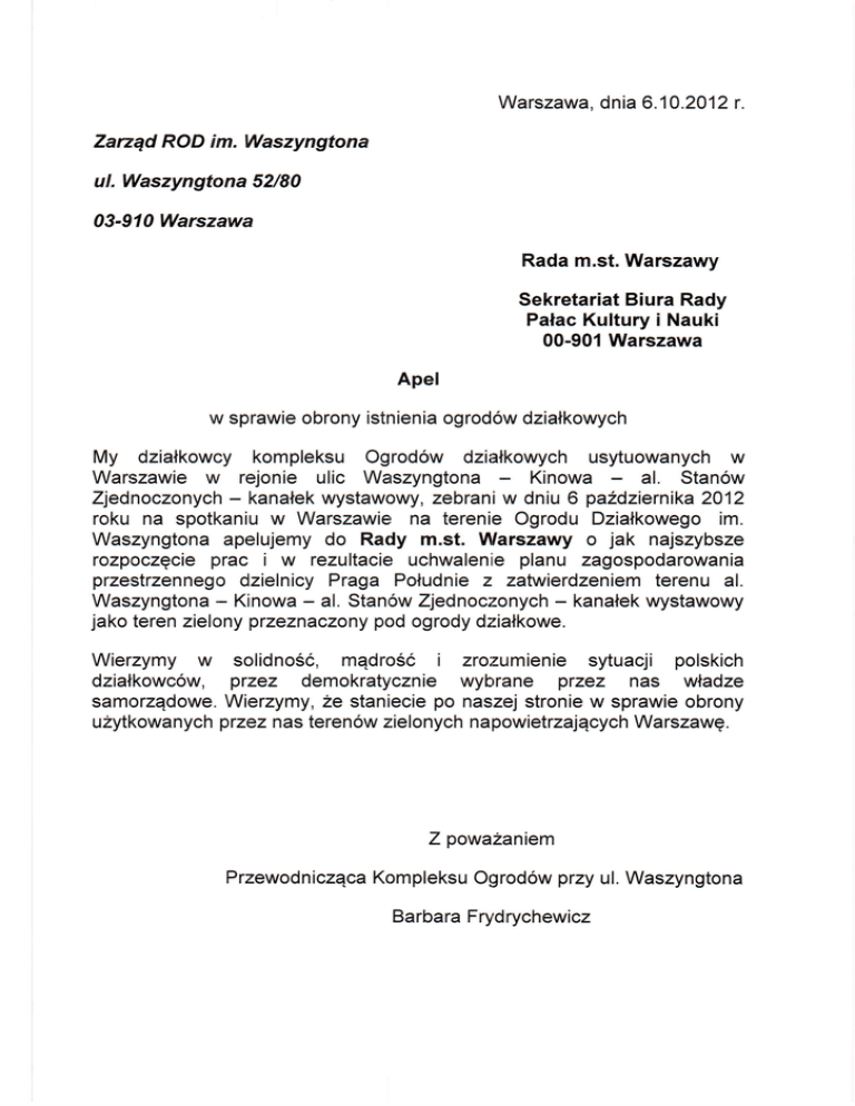 Warszawa. dnia6.10.2012 r. Zanqd RODim. Waszyngtona ul. Waszyngtona52/80 03-910Warszawa Radam.st.Warszawy SekretariatBiura Rady PalacKulturyi Nauki 00-901Warszawa Apel w sprawieobronyistnienia ogrodowdzialkowych My dziatkowcykompleksu Ogrodow dzialkowychusytuowanychw Warszawiew rejonie ulic Waszyngtona Kinowa al. Stan6w - kanafekwystawowy,zebraniw dniu 6 pa2dziernika y'ednoczonych 2012 roku na spotkaniuw Warszawiena terenieOgroduDziatkowegoim. Waszyngtonaapelujemydo Rady m.st. Vllarszawyo jak najszybsze planu zagospodarowania rozpoaTqsisprac i w rezultacieuchwaleniie prze:strzennego dzielnicyPraga Poludniez zatwierdzeniem terenu al. Waszyngtona Kinowa al. Stan6wZjednoc:zonychkanalekwystawowy jakoterenzielonyprzeznaczony podogrodydzialkowe. Wierzymy w solidnoSc,mqdro6c i zro:zumieniesytuacji polskich dziaNkowc6w,przez demokratyczniewybrrane przez nas wNadze po naszejstroniew sprawieobrony Wierzymy, samorzEdowe. 2e staniecie qcychWarszawg. nychprzeznas terenow zielonych uZytkowa napowietrzaj Z powa2aniem Przewodniczqca KompleksuOgrodowprzy ul. Waszyngtona BarbaraFrydrychewicz
