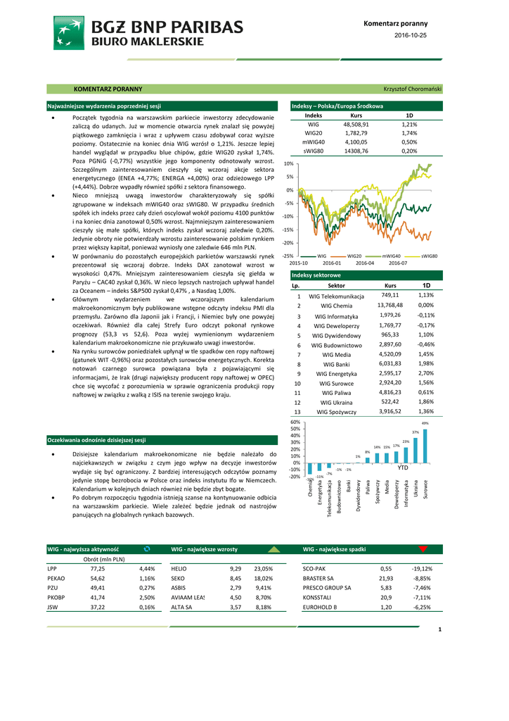 Komentarz poranny 2016-10-25 KOMENTARZ PORANNY Krzysztof Choromański WIG - najwyższa aktywność WIG - największe wzrosty -20% -25% 2015-10 WIG WIG20 2016-01 mWIG40 2016-04 sWIG80 2016-07 Indeksy sektorowe Lp. WIG Telekomunikacja Kurs 749,11 2 WIG Chemia 13,768,48 0,00% 3 WIG Informatyka 1,979,26 -0,11% 4 WIG Deweloperzy 1,769,77 -0,17% 5 WIG Dywidendowy 965,33 1,10% 6 WIG Budownictowo 2,897,60 -0,46% 7 WIG Media 4,520,09 1,45% 8 WIG Banki 6,031,83 1,98% 9 WIG Energetyka 2,595,17 2,70% 10 WIG Surowce 2,924,20 1,56% 11 WIG Paliwa 4,816,23 0,61% 12 WIG Ukraina 522,42 1,86% 13 WIG Spożywczy 3,916,52 1,36% 49% 37% 23% 14% 15% 17% 8% 1% YTD -1% -1% Ukraina Surowce -7% Informatyka -16% -11% Media 60% 50% 40% 30% 20% 10% 0% -10% -20% Sektor 1D 1,13% 1 Deweloperzy Dzisiejsze kalendarium makroekonomiczne nie będzie należało do najciekawszych w związku z czym jego wpływ na decyzje inwestorów wydaje się być ograniczony. Z bardziej interesujących odczytów poznamy jedynie stopę bezrobocia w Polsce oraz indeks instytutu Ifo w Niemczech. Kalendarium w kolejnych dniach również nie będzie zbyt bogate. Po dobrym rozpoczęciu tygodnia istnieją szanse na kontynuowanie odbicia na warszawskim parkiecie. Wiele zależeć będzie jednak od nastrojów panujących na globalnych rynkach bazowych. -15% Paliwa -10% Spożywczy Oczekiwania odnośnie dzisiejszej sesji -5% Banki 0% Dywidendowy 5% Budownictowo 1D 1,21% 1,74% 0,50% 0,20% 10% Telekomunikacja Początek tygodnia na warszawskim parkiecie inwestorzy zdecydowanie zaliczą do udanych. Już w momencie otwarcia rynek znalazł się powyżej piątkowego zamknięcia i wraz z upływem czasu zdobywał coraz wyższe poziomy. Ostatecznie na koniec dnia WIG wzrósł o 1,21%. Jeszcze lepiej handel wyglądał w przypadku blue chipów, gdzie WIG20 zyskał 1,74%. Poza PGNiG (-0,77%) wszystkie jego komponenty odnotowały wzrost. Szczególnym zainteresowaniem cieszyły się wczoraj akcje sektora energetycznego (ENEA +4,77%; ENERGA +4,00%) oraz odzieżowego LPP (+4,44%). Dobrze wypadły również spółki z sektora finansowego. Nieco mniejszą uwagą inwestorów charakteryzowały się spółki zgrupowane w indeksach mWIG40 oraz sWIG80. W przypadku średnich spółek ich indeks przez cały dzień oscylował wokół poziomu 4100 punktów i na koniec dnia zanotował 0,50% wzrost. Najmniejszym zainteresowaniem cieszyły się małe spółki, których indeks zyskał wczoraj zaledwie 0,20%. Jedynie obroty nie potwierdzały wzrostu zainteresowanie polskim rynkiem przez większy kapitał, ponieważ wyniosły one zaledwie 646 mln PLN. W porównaniu do pozostałych europejskich parkietów warszawski rynek prezentował się wczoraj dobrze. Indeks DAX zanotował wzrost w wysokości 0,47%. Mniejszym zainteresowaniem cieszyła się giełda w Paryżu – CAC40 zyskał 0,36%. W nieco lepszych nastrojach upływał handel za Oceanem – indeks S&P500 zyskał 0,47% , a Nasdaq 1,00%. Głównym wydarzeniem we wczorajszym kalendarium makroekonomicznym były publikowane wstępne odczyty indeksu PMI dla przemysłu. Zarówno dla Japonii jak i Francji, i Niemiec były one powyżej oczekiwań. Również dla całej Strefy Euro odczyt pokonał rynkowe prognozy (53,3 vs 52,6). Poza wyżej wymienionym wydarzeniem kalendarium makroekonomiczne nie przykuwało uwagi inwestorów. Na rynku surowców poniedziałek upłynął w tle spadków cen ropy naftowej (gatunek WIT -0,96%) oraz pozostałych surowców energetycznych. Korekta notowań czarnego surowca powiązana była z pojawiającymi się informacjami, że Irak (drugi największy producent ropy naftowej w OPEC) chce się wycofać z porozumienia w sprawie ograniczenia produkcji ropy naftowej w związku z walką z ISIS na terenie swojego kraju. Chemia Indeksy – Polska/Europa Środkowa Indeks Kurs WIG 48,508,91 WIG20 1,782,79 mWIG40 4,100,05 sWIG80 14308,76 Energetyka Najważniejsze wydarzenia poprzedniej sesji WIG - największe spadki Obrót (mln PLN) LPP 77,25 4,44% HELIO 9,29 23,05% SCO-PAK 0,55 -19,12% PEKAO 54,62 1,16% SEKO 8,45 18,02% BRASTER SA 21,93 -8,85% PZU 49,41 0,27% ASBIS 2,79 9,41% PRESCO GROUP SA 5,83 -7,46% PKOBP 41,74 2,50% AVIAAM LEASING A 4,50 8,70% KONSSTALI 20,9 -7,11% JSW 37,22 0,16% ALTA SA 3,57 8,18% EUROHOLD BULGARI 1,20 -6,25% 1 Komentarz poranny NOTOWANIA Z DNIA Indeksy – Europa 24.10.2016 Indeksy – Świat Europa Niemcy Wlk. Brytania Francja Rosja Turcja Euro Stoxx 50 DAX FTSE 250 CAC40 RTS XU100 3077,65 10710,73 17934,24 4536,07 986,37 78843,66 0,53% 0,47% -0,41% 0,36% 0,75% 1,38% USA USA USA Chiny Japonia Brazylia 30% 30% 20% 20% 10% 10% 0% 0% -10% -10% -20% -30% 2015-10 S&P500 DJI NASDAQ Shanghai B-share Nikkei 225 Bovespa 0,47% 0,43% 1,00% -0,03% 0,76% 0,42% 2,141,16 18,145,71 5,257,40 3,127,19 17,365,25 64,108,08 -20% DAX XU100 CAC40 FTSE250 2016-01 RTS 2016-04 -30% 2015-10 2016-07 Surowce / Metale S&P500 DJIA Shanghai Nikkei 2015-12 2016-02 2016-04 NASDAQ BOVESPA 2016-06 2016-08 Surowce / Towary Ropa Crude $/bbl. Miedź $/t Złoto $/t oz. Srebro $/t oz. Aluminium $/t 51,46 4638,00 1264,44 17,59 1630,50 -0,62% 0,06% -0,16% 0,28% 0,34% Kukurydza Future Pszenica Future Soja Future Cukier Future Kawa Future 40% 70% 20% 50% 0% 30% -20% 10% -40% -60% 2015-10 źródło: Bloomberg 352,50 414,50 992,25 22,71 156,10 -1,21% -2,90% 1,01% 2,16% 1,15% -10% Ropa Future Złoto Future Aluminium Future 2016-01 Miedź Future Srebro Future 2016-04 Kukurydza Future -30% Cukier Future 2015-10 2015-12 2016-07 Waluty (kursy z godziny 8.30) EUR/PLN USD/PLN CHF/PLN GBP/PLN EUR/USD Pszenica Future 2016-02 2016-04 -0,03% -0,01% -0,12% -0,13% -0,01% 2016-06 YTM Rentowność obligacji 4,3139 3,9645 3,9862 4,8457 1,0881 Soja Future Kawa Future 1 rok 2 lata 4 lata 6 lat 10 lat 2016-08 YTM* 1,57 1,77 2,22 2,55 2,97 1,54 1,73 2,12 2,41 2,82 * YTM 30 dni wcześniej 15% 10% 3,50 5% 3,00 0% -5% 2,50 -10% 2,00 -15% -20% 2015-10 YTM 1,50 2015-12 2016-02 2016-04 2016-06 EUR/PLN USD/PLN GBP/PLN EUR/USD YTM* 2016-08 CHF/PLN 1,00 1 rok 2 lata 4 lata 