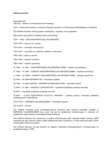 Wilfried Gerstner Wykształcenie: 1967-68 – studia na Uniwersytecie we Freibergu 1973 – ukończenie studiów w zakresie inżynierii ceramiki na Uniwersytecie Mendelejewa w Moskwie Pan Wilfried Gerstner włada językiem niemieckim, rosyjskim oraz angielskim. Zajmowane stanowiska i przebieg kariery zawodowej: 1973 – 1990 – VEB SANITÄRPOTZELLAN DRESDEN 1973-1974 – inżynier ds. rozwoju 1973-1974 – menedżer laboratorium 1975-1979 – menedżer ds. szklenia, opalania i sortowania 1980-1982 – główny inżynier 1982-1984 – dyrektor produkcji 1984-1990 – dyrektor generalny 07.1990 – 12.1991 – SANITÄRPORZELLAN DRESDEN GMBH - dyrektor zarządzający 01.1992 – 10.1994 – DURAVIT SANITÄRPORZELLAN DRESDEN GMBH – dyrektor techniczny 11.1994 – 02.19994 – DURAVIT SANITÄRPORZELLAN MEISSEN GMBH - dyrektor techniczny 03.1997 – 08.1999 KERAMAG AG – menedżer projektu 09.1999 – 10.2000 SANITEC JOHNSON SUISSE MALAYSIA – menedżer fabryki 11.2000 – 01.2004 - SANITEC CORPORATION – menedżer projektów produkcji ceramiki 02.2007 – menedżer projektów produkcji ceramiki 03.2007 – 12.2012 BUDFARFOR SLAVUTA, UKRAINE – dyrektor jakości, menedżer projektów inwestycyjnych nowej fabryki Od 01.2013 – KERAMAG HALDENSLEBEN – menedżer projektu Od 10.2013 – emeryt Pan Wilfried Gerstner poza przedsiębiorstwem Emitenta pełni funkcję menedżer projektu w KERAMAG HALDENSLEBEN przy czym nie jest to działalność konkurencyjna w stosunku do działalności wykonywanej w przedsiębiorstwie Emitenta. Pan Wilfried Gerstner nie uczestniczy w spółce konkurencyjnej jako wspólnik spółki cywilnej, spółki osobowej lub jako członek organu spółki kapitałowej bądź uczestniczy w innej konkurencyjnej osobie prawnej jako członek jej organu. Pan Wilfried Gerstner nie jest wpisany do Rejestru Dłużników Niewypłacalnych, prowadzonego na podstawie ustawy o KRS.