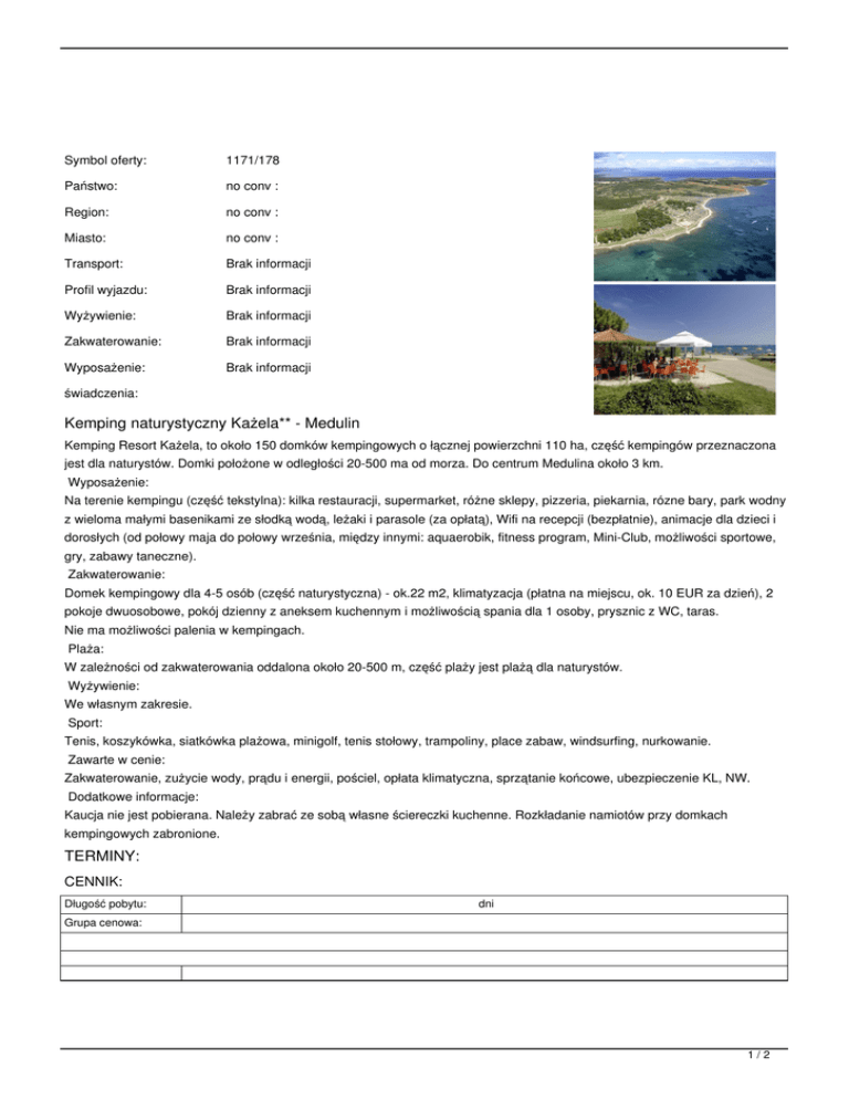 Symbol oferty: 1171/178 Państwo: no conv : Region: no conv : Miasto: no conv : Transport: Brak informacji Profil wyjazdu: Brak informacji Wyżywienie: Brak informacji Zakwaterowanie: Brak informacji Wyposażenie: Brak informacji świadczenia: Kemping naturystyczny Każela** - Medulin Kemping Resort Każela, to około 150 domków kempingowych o łącznej powierzchni 110 ha, część kempingów przeznaczona jest dla naturystów. Domki położone w odległości 20-500 ma od morza. Do centrum Medulina około 3 km. Wyposażenie: Na terenie kempingu (część tekstylna): kilka restauracji, supermarket, różne sklepy, pizzeria, piekarnia, rózne bary, park wodny z wieloma małymi basenikami ze słodką wodą, leżaki i parasole (za opłatą), Wifi na recepcji (bezpłatnie), animacje dla dzieci i dorosłych (od połowy maja do połowy września, między innymi: aquaerobik, fitness program, Mini-Club, możliwości sportowe, gry, zabawy taneczne). Zakwaterowanie: Domek kempingowy dla 4-5 osób (część naturystyczna) - ok.22 m2, klimatyzacja (płatna na miejscu, ok. 10 EUR za dzień), 2 pokoje dwuosobowe, pokój dzienny z aneksem kuchennym i możliwością spania dla 1 osoby, prysznic z WC, taras. Nie ma możliwości palenia w kempingach. Plaża: W zależności od zakwaterowania oddalona około 20-500 m, część plaży jest plażą dla naturystów. Wyżywienie: We własnym zakresie. Sport: Tenis, koszykówka, siatkówka plażowa, minigolf, tenis stołowy, trampoliny, place zabaw, windsurfing, nurkowanie. Zawarte w cenie: Zakwaterowanie, zużycie wody, prądu i energii, pościel, opłata klimatyczna, sprzątanie końcowe, ubezpieczenie KL, NW. Dodatkowe informacje: Kaucja nie jest pobierana. Należy zabrać ze sobą własne ściereczki kuchenne. Rozkładanie namiotów przy domkach kempingowych zabronione. TERMINY: CENNIK: Długość pobytu: dni Grupa cenowa: 1/2 Waluta: EUR Aktualne ceny z systemu S.A.R.T. (-) - cena usługi, podatku kalkulowana przy osobie lub gratis (*) - kwota wliczona w cenę standardową 2/2