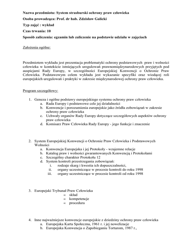 Nazwa przedmiotu: System strasburski ochrony praw człowieka Osoba prowadząca: Prof. dr hab. Zdzisław Galicki Typ zajęć : wykład Czas trwania: 10 Sposób zaliczenia: egzamin lub zaliczenie na podstawie udziału w zajęciach Założenia ogólne: Przedmiotem wykładu jest prezentacja problematyki ochrony podstawowych praw i wolności człowieka w kontekście istniejących uregulowań prawnomiędzynarodowych przyjętych pod auspicjami Rady Europy, w szczególności Europejskiej Konwencji o Ochronie Praw Człowieka. Podstawowym celem wykładu jest wykazanie specyfiki oraz wiodącej roli europejskich uregulowań i praktyki w zakresie międzynarodowej ochrony praw człowieka. Program szczegółowy: 1. Geneza i ogólne podstawy europejskiego systemu ochrony praw człowieka a. Rada Europy i podstawowe cele jej działalności b. Konwencje i porozumienia europejskie jako źródła zobowiązań w zakresie ochrony praw człowieka c. Uchwały organów Rady Europy dotyczące szczegółowych aspektów ochrony praw człowieka d. Komisarz Praw Człowieka Rady Europy - jego funkcje i znaczenie 2. System Europejskiej Konwencji o Ochronie Praw Człowieka i Podstawowych Wolności a. Konwencja Europejska i jej Protokoły - wzajemne relacje b. Katalog praw i wolności gwarantowanych Konwencją i Protokołami c. Szczególny charakter Protokołu 12 d. System kontroli przestrzegania zobowiązań: i. rodzaje skarg i kwestia ich dopuszczalności, ii. organy uczestniczące w procesie kontroli do roku 1998 iii. organy uczestniczące w procesie kontroli od roku 1998 3. Europejski Trybunał Praw Człowieka • skład • kompetencje • procedura 4. Inne najważniejsze konwencje europejskie z dziedziny ochrony praw człowieka a. Europejska Karta Społeczna, 1961 r. i jej nowelizacje b. Europejska Konwencja o Zapobieganiu Torturom, 1987 r., c. Konwencja Ramowa o Ochronie Mniejszości Narodowych, 1994 r. 5. Karta Praw Fundamentalnych Unii Europejskiej a Europejska Konwencja o Ochronie Praw Człowieka i Podstawowych Wolności. Bibliografia: • • • • Konwencja o Ochronie Praw Człowieka i Podstawowych Wolności, Komentarz do artykułów … t. 1 - 2010, t. 2 – 2011, red. Leszek Garlicki, Warszawa wyd. BECK M. Nowicki.: Wokół Konwencji Europejskiej, Wyd. Zakamycze, 2000. M. Nowicki: Europejska Konwencja Praw Człowieka, Wyd. Zakamycze, 2004. B.Banaszak, A.Bisztyga, K.Complak, M.Jabłoński, R.Wieruszewski, K.Wójtowicz : System ochrony praw człowieka, Wyd. Zakamycze, (wyd.2) 2005.