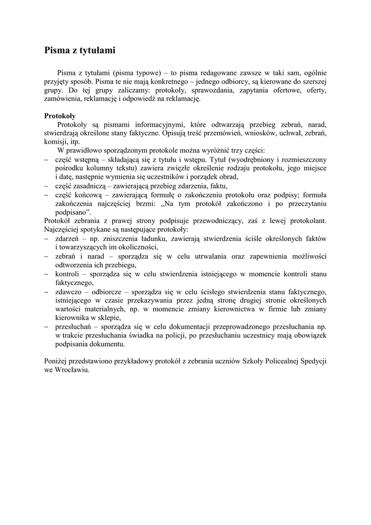 Pisma z tytułami Pisma z tytułami (pisma typowe) – to pisma redagowane zawsze w taki sam, ogólnie przyjęty sposób. Pisma te nie mają konkretnego – jednego odbiorcy, są kierowane do szerszej grupy. Do tej grupy zaliczamy: protokoły, sprawozdania, zapytania ofertowe, oferty, zamówienia, reklamację i odpowiedź na reklamację. Protokoły Protokoły są pismami informacyjnymi, które odtwarzają przebieg zebrań, narad, stwierdzają określone stany faktyczne. Opisują treść przemówień, wniosków, uchwał, zebrań, komisji, itp. W prawidłowo sporządzonym protokole moŜna wyróŜnić trzy części: − część wstępną – składającą się z tytułu i wstępu. Tytuł (wyodrębniony i rozmieszczony pośrodku kolumny tekstu) zawiera zwięzłe określenie rodzaju protokołu, jego miejsce i datę, następnie wymienia się uczestników i porządek obrad, − część zasadniczą – zawierającą przebieg zdarzenia, faktu, − część końcową – zawierającą formułę o zakończeniu protokołu oraz podpisy; formuła zakończenia najczęściej brzmi: „Na tym protokół zakończono i po przeczytaniu podpisano”. Protokół zebrania z prawej strony podpisuje przewodniczący, zaś z lewej protokolant. Najczęściej spotykane są następujące protokoły: − zdarzeń – np. zniszczenia ładunku, zawierają stwierdzenia ściśle określonych faktów i towarzyszących im okoliczności, − zebrań i narad – sporządza się w celu utrwalania oraz zapewnienia moŜliwości odtworzenia ich przebiegu, − kontroli – sporządza się w celu stwierdzenia istniejącego w momencie kontroli stanu faktycznego, − zdawczo – odbiorcze – sporządza się w celu ścisłego stwierdzenia stanu faktycznego, istniejącego w czasie przekazywania przez jedną stronę drugiej stronie określonych wartości materialnych, np. w momencie zmiany kierownictwa w firmie lub zmiany kierownika w sklepie, − przesłuchań – sporządza się w celu dokumentacji przeprowadzonego przesłuchania np. w trakcie przesłuchania świadka na policji, po przesłuchaniu uczestnicy mają obowiązek podpisania dokumentu. PoniŜej przedstawiono przykładowy protokół z zebrania uczniów Szkoły Policealnej Spedycji we Wrocławiu. Protokół zebrania uczniów Szkoły Policealnej Spedycji we Wrocławiu, które odbyło się 13 kwietnia 2006 roku o godzinie 12:30 związane z wyborami do Samorządu Uczniowskiego Obecni według załączonej listy. Porządek obrad: 1. Podsumowanie pracy Samorządu Uczniowskiego w latach 2004 – 2006. 2. Wybory członków do Samorządu Uczniowskiego na lata 2006 – 2008. 3. Sprawy róŜne. Otwarcie zebrania dokonała Pani Anna Dudek – opiekun Samorządu Uczniowskiego z grona nauczycieli. Protokolantem została Agnieszka Mazur. Do p. 1. Przewodniczący Samorządu Uczniowskiego Tomasz Kowalski przedstawił dokonania Samorządu w latach 2004 – 2006. Poinformował o sytuacji finansowej Samorządu, podjętych działaniach w zakresie promocji szkoły w otoczeniu zewnętrznym. Podziękował za współpracę wszystkim uczniom. śyczył przyszłemu Samorządowi realizacji zamierzonych planów. Do p. 2. W wyniku głosowania jawnego wybrano Komisję Skrutacyjną w sprawie wyborów na członków Samorządu Uczniowskiego: Marek Kawka, Piotr Tomaszewski, Katarzyna Turowicz. Następnie rozpoczęto zgłaszanie kandydatów na członków Samorządu Uczniowskiego. Zgłoszono następujące osoby: Marzena Tarnowska, Barbara Zimach, Jacek Lewandowski. W wyniku głosowania uczniowie wybrali następujące osoby do Samorządu Uczniowskiego. Przewodniczącym Samorządu został: Jacek Lewandowski, Sekretarzem Samorządu została Marzena Tarnowska a Skarbnikiem została Barbara Zimach. Nowo wybrany przewodniczący podziękował za wybór oraz przedstawił plan działania Samorządu na lata 2006 – 2008. Do p. 3. Pani Anna Dudek poruszyła problem niskiej frekwencji na zajęciach lekcyjnych oraz przedstawiła plan praktyk zawodowych w okresie letnim. Na zakończenie Pani Anna Dudek złoŜyła Ŝyczenia świąteczne. Na tym protokół zakończono. Protokowała Agnieszka Mazur Przewodnicząca zebrania Anna Dudek Sprawozdanie Sprawozdanie jest pismem informacyjnym. Stanowi relację z przebiegu określonego zdarzenia. W sprawozdaniach obowiązuje język sformalizowany. Sprawozdanie powinno zawierać następujące elementy: − tytuł „Sprawozdanie”, − określenie sprawy, − określenie strony składającej sprawozdanie, − określenie czasu, jakiego dotyczy, − datę jego sporządzenia, − przedstawienie przedmiotu, tj. zasadnicza część sprawozdania, w której opisuje się zdarzenia, działalność oraz ewentualne wnioski, − nazwisko i imię oraz podpis sporządzającego sprawozdanie. Przykład sprawozdania Sprawozdanie z działalności Komisji Socjalnej w Szkole Policealnej Spedycji we Wrocławiu za okres od 1 stycznia do 31 grudnia 2005. W okresie sprawozdawczym w Komisji Socjalnej pracowali: Marzena Zatorska – przewodnicząca, Andrzej Nowak i Zuzana Muzyka – członkowie. Na dzień 1 stycznia fundusz socjalny wynosił 16 000 zł. W trakcie roku udzielono 15 zapomóg na kwotę 5 000 zł. Dofinansowano wypoczynek dla 20 pracowników na kwotę 5 000 zł. Z okazji Świąt BoŜego Narodzenia rozdysponowano dla pracowników bony towarowe na zakup Ŝywności na kwotę 4 600 zł. Stan środków pienięŜnych na dzień 31 grudnia 2005 wynosił 1400 zł. Przewodniczący Komisji Socjalnej Marzena Zatorska Wrocław, 15 stycznia 2006 roku
