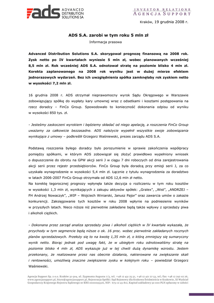 Kraków, 19 grudnia 2008 r. ADS S.A. zarobi w tym roku 5 mln zł Informacja prasowa Advanced Distribution Solutions S.A. skorygował prognozę finansową na 2008 rok. Zysk netto po IV kwartałach wyniesie 5 mln zł, wobec planowanych wcześniej 8,5 mln zł. Rok wcześniej ADS S.A. odnotował stratę na poziomie blisko 4 mln zł. Korekta zaplanowanego na 2008 rok wyniku jest w dużej mierze efektem jednorazowych wydarzeń. Bez ich uwzględnienia spółka zamknęłaby rok zyskiem netto w wysokości 7,2 mln zł. 16 grudnia 2008 r. ADS otrzymał nieprawomocny wyrok Sądu Okręgowego w Warszawie zobowiązujący spółkę do wypłaty kary umownej wraz z odsetkami i kosztami postępowania na rzecz doradcy – FinCo Group. Spowodowało to konieczność dokonania odpisu od wyniku w wysokości 850 tys. zł. - Jesteśmy zaskoczeni wyrokiem i będziemy składać od niego apelację, a roszczenia FinCo Group uważamy za całkowicie bezzasadne. ADS należycie wypełnił wszystkie swoje zobowiązania wynikające z umowy – podkreślił Grzegorz Waśniewski, prezes zarządu ADS S.A. Podstawą roszczenia byłego doradcy było porozumienie w sprawie zakończenia współpracy pomiędzy spółkami, w którym ADS zobowiązał się złożyć prawidłowo wypełniony wniosek o dopuszczenie do obrotu na GPW akcji serii J w ciągu 7 dni roboczych od dnia zarejestrowania akcji serii przez rejestr przedsiębiorców. FinCo Group była doradcą przy emisji serii J, za co uzyskała wynagrodzenie w wysokości 5,4 mln zł. Łącznie z tytułu wynagrodzenia za doradztwo w latach 2006-2007 FinCo Group otrzymała od ADS 12,6 mln zł netto. Na korektę tegorocznej prognozy wpłynęła także decyzja o rozliczeniu w tym roku kosztów w wysokości 1,3 mln zł, wynikających z zakupu aktywów spółek: „Gralex”, „Wist”, „ANDRZEJ – FH Andrzej Nowaczyk”, „WIP – Wojciech Winiarski, Janusz Pajor” oraz zawarcia umów o zakazie konkurencji. Zaksięgowanie tych kosztów w roku 2008 wpłynie na podniesienie wyników w przyszłych latach. Nieco niższe niż pierwotnie zakładane będą także wpływy z sprzedaży piwa i alkoholi ciężkich. - Dokonana przez zarząd analiza sprzedaży piwa i alkoholi ciężkich w IV kwartale wykazała, że przychody w tym segmencie będą niższe o ok. 16 proc. wobec pierwotnie zakładanych rocznych planów sprzedażowych. Przełoży się to na kwotę 1,35 mln zł, o którą zmniejszy się sumaryczny wynik netto. Biorąc jednak pod uwagę fakt, że w ubiegłym roku odnotowaliśmy stratę na poziomie blisko 4 mln zł, ADS wykazuje już w tej chwili dużą dynamikę wzrostu. Jestem przekonany, że realizowane przez nas obecnie działania, nakierowane na zwiększanie skali i rentowności, umożliwią znaczne zwiększenie zysku w kolejnym roku – powiedział Grzegorz Waśniewski. Informacje o firmie: Advanced Distribution Solutions S.A. jest pierwszą na polskim rynku niezależną, skonsolidowaną grupą dystrybucyjną, świadczącą wyspecjalizowane usługi w branży piwowarskiej, napojów alkoholowych i bezalkoholowych. Istotną przewagą rynkową Grupy ADS jest jej ogólnopolski zasięg, pozwalający świadczyć usługi niedostępne dla małych, rozproszonych na rynku dystrybutorów. Ponadregionalny charakter oraz niezależność od producentów daje jej możliwości oferowania najatrakcyjniejszych na rynku produktów oraz wsparcia ich sprzedaży, bez konieczności koncentrowania się na produktach własnych. Dzięki temu ADS jest najatrakcyjniejszym dostawcą dla istniejących i powstających dynamicznie sieci sklepów. Grupa jest obecna w następujących makroregionach: - Śląsk (Katowice, Zabrze, Rybnik, Tychy, Wodzisław Śląski, Żory, Mysłowice, Kobielice, Ćwiklice, Będzin); - Południe (Kraków, Kielce, Wieliczka, Lubartów, Szczurowa); - Południowy Zachód (Poznań, Świdnica, Zgorzelec, Leszno, Jelenia Góra); - Północ (Słupsk, Szczecinek, Koszalin); - Środkowy Wschód (Bydgoszcz, Koronowo). Ze względu na dużą skalę działania, szeroki pakiet usług oraz przejrzystość, wynikającą z funkcjonowania na rynku publicznym, ADS stał się także atrakcyjnym partnerem dla producentów. Poza usługami dystrybucyjnymi, ADS zaoferuje swoim dostawcom wsparcie sprzedaży rozszerzenie poprzez implementację powierzchni działań sprzedaży), producenta szybkie (promocje, wprowadzanie na budowa rynek ekspozycji, nowości, usługi merchandisingowe oraz realizację polityki cenowej producenta na poziomie detalicznym. Wiedza rynkowa, pozyskanie najlepszych partnerów do współpracy oraz ich dobra kondycja finansowa stanowią o sile Grupy ADS. Obecnie ADS ujednolica obsługę bankową i ubezpieczeniową oraz procedury zarządzania personelem. Wdraża także systemy motywowania pracowników, jednolite zasady rachunkowości i raportowania, a także wprowadza rachunkowość zarządczą w spółkach oraz program zarządzania flotą. Efekty procesu konsolidacji, takie jak zmniejszenie kosztów stałych, optymalizacja logistyki oraz wynegocjowanie lepszych warunków z dostawcami, przełożą się na dalszy wzrost rentowności całej Grupy. Więcej informacji: Grzegorz Waśniewski Prezes Zarządu Advanced Distribution Solutions S.A. ul. Balicka 35, 30-149 Kraków tel.: +48 12 415 87 73