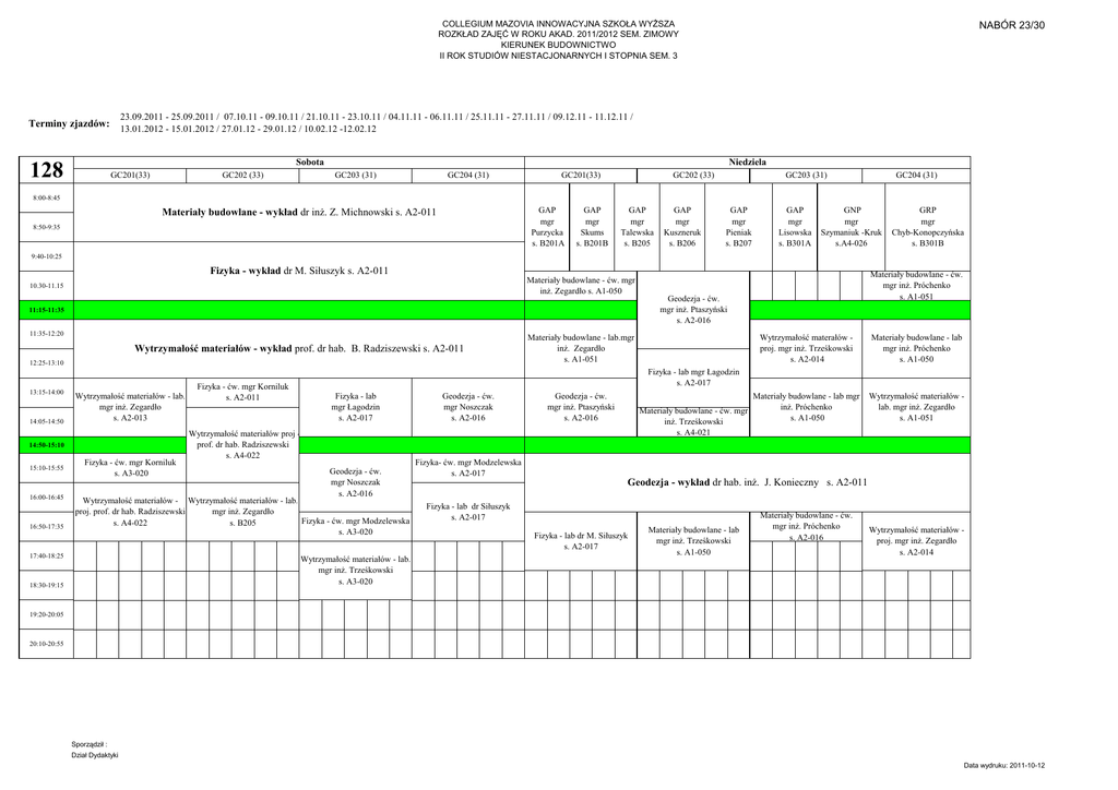 COLLEGIUM MAZOVIA INNOWACYJNA SZKOŁA WYŻSZA ROZKŁAD ZAJĘĆ W ROKU AKAD. 2011/2012 SEM. ZIMOWY KIERUNEK BUDOWNICTWO II ROK STUDIÓW NIESTACJONARNYCH I STOPNIA SEM. 3 23.09.2011 - 25.09.2011 / 07.10.11 - 09.10.11 / 21.10.11 - 23.10.11 / 04.11.11 - 06.11.11 / 25.11.11 - 27.11.11 / 09.12.11 - 11.12.11 / 13.01.2012 - 15.01.2012 / 27.01.12 - 29.01.12 / 10.02.12 -12.02.12 Terminy zjazdów: 128 NABÓR 23/30 Sobota GC201(33) GC202 (33) Niedziela GC203 (31) GC204 (31) GC201(33) GC202 (33) GC204 (31) GC203 (31) 8:00-8:45 GAP mgr Purzycka s. B201A Materiały budowlane - wykład dr inż. Z. Michnowski s. A2-011 8:50-9:35 GAP mgr Skums s. B201B GAP mgr Talewska s. B205 GAP mgr Kuszneruk s. B206 GAP mgr Pieniak s. B207 GAP mgr Lisowska s. B301A GNP mgr Szymaniuk -Kruk s.A4-026 GRP mgr Chyb-Konopczyńska s. B301B 9:40-10:25 Fizyka - wykład dr M. Siłuszyk s. A2-011 Materiały budowlane - ćw. mgr inż. Zegardło s. A1-050 10.30-11.15 11:15-11:35 11:35-12:20 Wytrzymałość materiałów - wykład prof. dr hab. B. Radziszewski s. A2-011 12:25-13:10 13:15-14:00 14:05-14:50 Wytrzymałość materiałów - lab. mgr inż. Zegardło s. A2-013 14:50-15:10 15:10-15:55 16:00-16:45 16:50-17:35 Fizyka - ćw. mgr Korniluk s. A3-020 Fizyka - ćw. mgr Korniluk s. A2-011 Fizyka - lab mgr Łagodzin s. A2-017 Wytrzymałość materiałów proj prof. dr hab. Radziszewski s. A4-022 Geodezja - ćw. mgr Noszczak s. A2-016 Wytrzymałość materiałów - lab. mgr inż. Trześkowski s. A3-020 18:30-19:15 Geodezja - ćw. mgr inż. Ptaszyński s. A2-016 Materiały budowlane - lab.mgr inż. Zegardło s. A1-051 Wytrzymałość materałów proj. mgr inż. Trześkowski s. A2-014 Materiały budowlane - lab mgr inż. Próchenko s. A1-050 Materiały budowlane - lab mgr inż. Próchenko s. A1-050 Wytrzymałość materiałów lab. mgr inż. Zegardło s. A1-051 Fizyka - lab mgr Łagodzin s. A2-017 Wytrzymałość materiałów - Wytrzymałość materiałów - lab. proj. prof. dr hab. Radziszewski mgr inż. Zegardło Fizyka - ćw. mgr Modzelewska s. B205 s. A4-022 s. A3-020 17:40-18:25 Materiały budowlane - ćw. mgr inż. Próchenko s. A1-051 Geodezja - ćw. mgr Noszczak s. A2-016 Geodezja - ćw. mgr inż. Ptaszyński s. A2-016 Materiały budowlane - ćw. mgr inż. Trześkowski s. A4-021 Fizyka- ćw. mgr Modzelewska s. A2-017 Geodezja - wykład dr hab. inż. J. Konieczny s. A2-011 Fizyka - lab dr Siłuszyk s. A2-017 Fizyka - lab dr M. Siłuszyk s. A2-017 Materiały budowlane - lab mgr inż. Trześkowski s. A1-050 Materiały budowlane - ćw. mgr inż. Próchenko s. A2-016 Wytrzymałość materiałów proj. mgr inż. Zegardło s. A2-014 19:20-20:05 20:10-20:55 Sporządził : Dział Dydaktyki Data wydruku: 2011-10-12