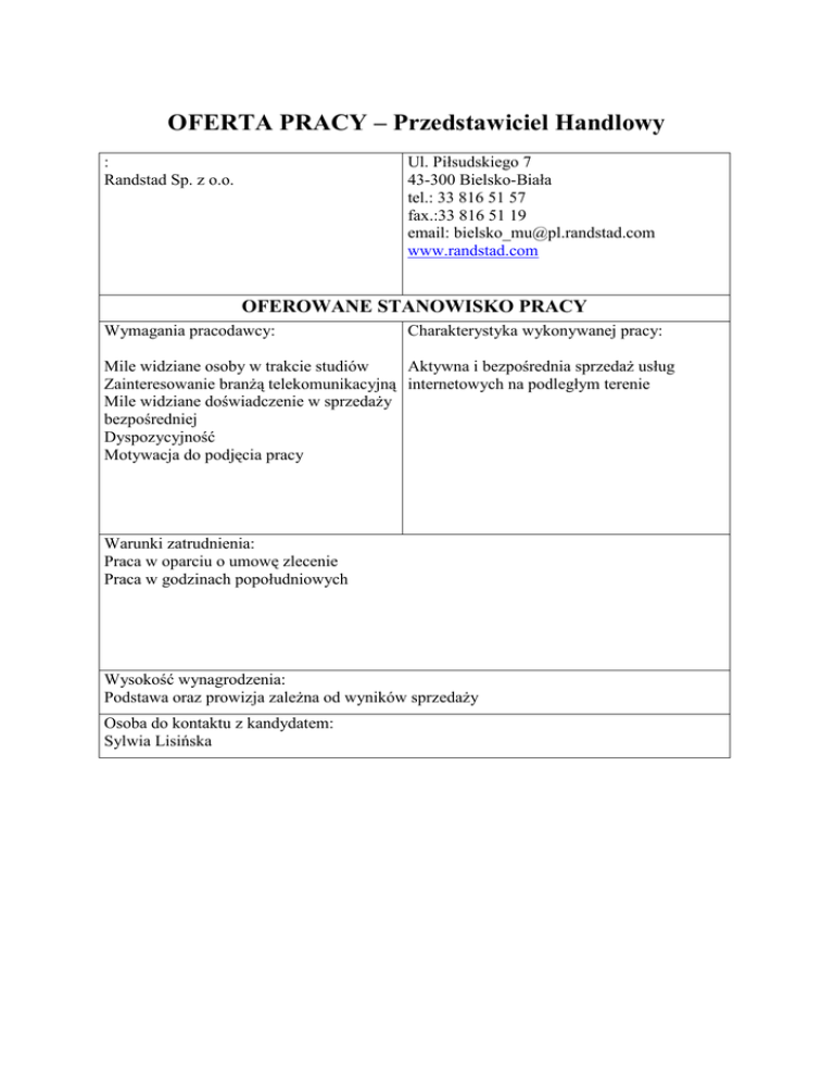OFERTA PRACY – Przedstawiciel Handlowy : Randstad Sp. z o.o. Ul. Piłsudskiego 7 43-300 Bielsko-Biała tel.: 33 816 51 57 fax.:33 816 51 19 email: [email protected] www.randstad.com OFEROWANE STANOWISKO PRACY Wymagania pracodawcy: Charakterystyka wykonywanej pracy: Aktywna i bezpośrednia sprzedaŜ usług Mile widziane osoby w trakcie studiów Zainteresowanie branŜą telekomunikacyjną internetowych na podległym terenie Mile widziane doświadczenie w sprzedaŜy bezpośredniej Dyspozycyjność Motywacja do podjęcia pracy Warunki zatrudnienia: Praca w oparciu o umowę zlecenie Praca w godzinach popołudniowych Wysokość wynagrodzenia: Podstawa oraz prowizja zaleŜna od wyników sprzedaŜy Osoba do kontaktu z kandydatem: Sylwia Lisińska