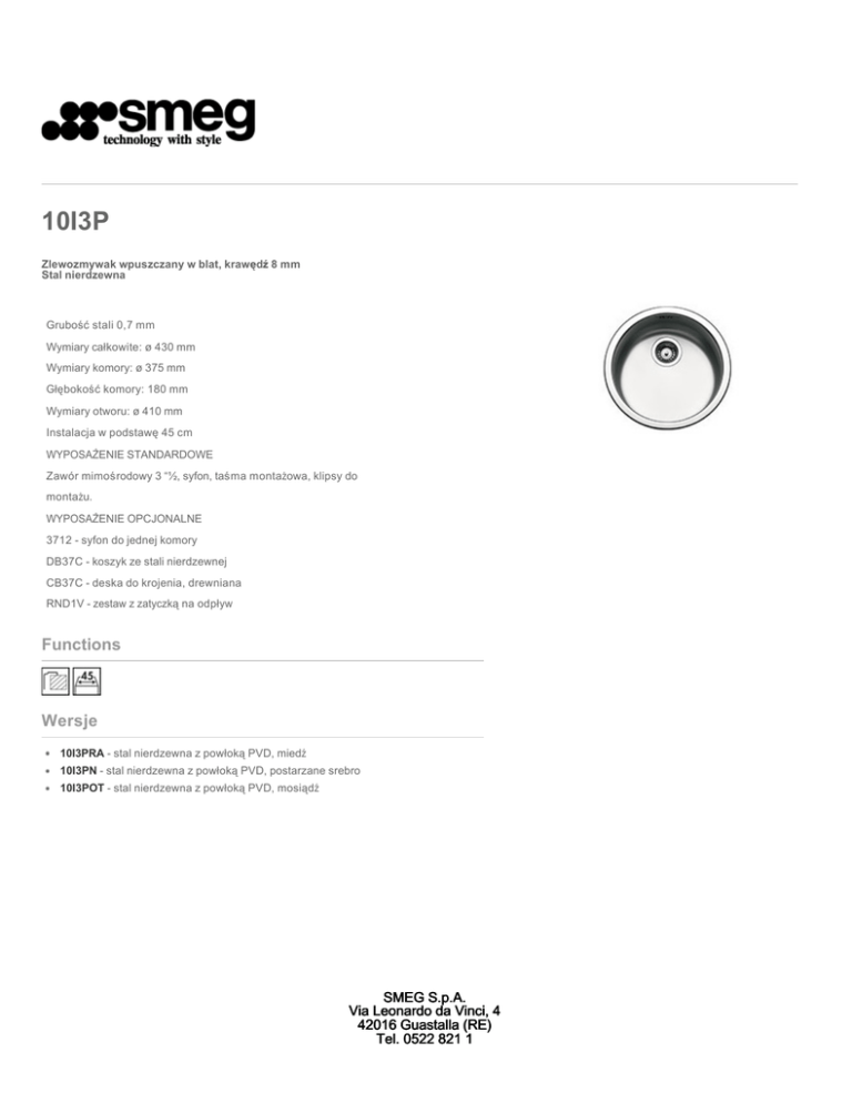10I3P Zlewozmywak wpuszczany w blat, krawędź 8 mm Stal nierdzewna Grubość stali 0,7 mm Wymiary całkowite: ø 430 mm Wymiary komory: ø 375 mm Głębokość komory: 180 mm Wymiary otworu: ø 410 mm Instalacja w podstawę 45 cm WYPOSAŻENIE STANDARDOWE Zawór mimośrodowy 3 “½, syfon, taśma montażowa, klipsy do montażu. WYPOSAŻENIE OPCJONALNE 3712 - syfon do jednej komory DB37C - koszyk ze stali nierdzewnej CB37C - deska do krojenia, drewniana RND1V - zestaw z zatyczką na odpływ Functions Wersje 10I3PRA - stal nierdzewna z powłoką PVD, miedź 10I3PN - stal nierdzewna z powłoką PVD, postarzane srebro 10I3POT - stal nierdzewna z powłoką PVD, mosiądź SMEG S.p.A. Via Leonardo da Vinci, 4 42016 Guastalla (RE) Tel. 0522 821 1 10I3P iLOŚĆ KOMÓR: 1 stal nierdzewna Ø 37,5 cm zlewozmywaki ze stali nierdzewnej wpuszczane w blat INSTALACJA STANDARDOWA: Tradycyjna instalacja nad blatem. 45 CM PODSTAWA: Szerokość szafki/ podstawy wymagana do instalacji - 45 cm SMEG S.p.A. Via Leonardo da Vinci, 4 42016 Guastalla (RE) Tel. 0522 821 1 10I3P iLOŚĆ KOMÓR: 1 stal nierdzewna Ø 37,5 cm zlewozmywaki ze stali nierdzewnej wpuszczane w blat SMEG S.p.A. Via Leonardo da Vinci, 4 42016 Guastalla (RE) Tel. 0522 821 1