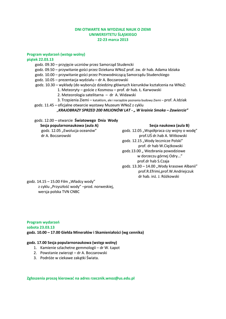 DNI OTWARTE NA WYDZIALE NAUK O ZIEMI UNIWERSYTETU ŚLĄSKIEGO 22-23 marca 2013 Program wydarzeń (wstęp wolny) piątek 22.03.13 godz. 09.30 – przyjęcie uczniów przez Samorząd Studencki godz. 09.50 – przywitanie gości przez Dziekana WNoZ prof. zw. dr hab. Adama Idziaka godz. 10.00 – przywitanie gości przez Przewodniczącą Samorządu Studenckiego godz. 10.05 – prezentacja wydziału – dr A. Boczarowski godz. 10.30 – wykłady (do wyboru)z dziedziny głównych kierunków kształcenia na WNoZ: 1. Meteoryty – goście z Kosmosu – prof. dr hab. Ł. Karwowski 2. Meteorologia satelitarna – dr A. Widawski 3. Trzęsienia Ziemi – kataklizm, ale i narzędzie poznania budowy Ziemi – prof. A.Idziak godz. 11.45 – oficjalne otwarcie wystawy Muzeum WNoZ z cyklu „KRAJOBRAZY SPRZED 200 MILIONÓW LAT - „ W krainie Smoka – Zawiercie” godz. 12.00 – otwarcie Światowego Dnia Wody Sesja popularnonaukowa (aula A) godz. 12.05 „Ewolucja oceanów” dr A. Boczarowski Sesja naukowa (aula B) godz. 12.05 „Współpraca czy wojny o wodę” prof.UŚ dr.hab A. Witkowski godz. 12.15 „Wody lecznicze Polski” prof. dr hab W.Ciężkowski godz.13.00 „ Wezbrania powodziowe w dorzeczu górnej Odry...” prof.dr hab S.Czaja godz. 13.30 – 14.00 „Wody krasowe Albanii” prof.R.Efrimi,prof.W.Andriejczuk dr hab. inż. J. Różkowski godz. 14.15 – 15.00 Film „Władcy wody” z cyklu „Przyszłość wody” –prod. norweskiej, wersja polska TVN CNBC Program wydarzeń sobota 23.03.13 godz. 10.00 – 17.00 Giełda Minerałów i Skamieniałości (wg cennika) godz. 17.00 Sesja popularnonaukowa (wstęp wolny) 1. Kamienie szlachetne gemmologii – dr W. Łapot 2. Powstanie zwierząt – dr A. Boczarowski 3. Podróże w ciekawe zakątki Świata. Zgłoszenia proszę kierować na adres [email protected]