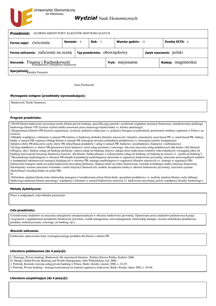 Wydział Nauk Ekonomicznych Przedmiot: Forma zajęć: SCORING KREDYTOWY KLIENTÓW INDYWIDUALNYCH ćwiczenia Forma zaliczenia: Kierunek: Semestr: 9 zaliczenie na ocenę Rok: 5 Typ przedmiotu: Finanse i Rachunkowość Pośrednictwo i Doradztwo Finansowe Wymiar godzin: 15 obowiązkowy Tryb: Punkty ECTS: 6 Język nauczania: stacjonarne Rodzaj: polski magisterskie Specjalność: Katedra Finansów Anna Piechaczek Wymagania wstępne (przedmioty wprowadzające): Bankowość, Rynki finansowe Program przedmiotu: 1)Profil klienta bankowości prywatnej (cechy klienta private banking, specyfika jego potrzeb i oczekiwań względem instytucji finansowej; charakterystyka polskiego bankowego klienta VIP; kryteria wyboru banku stosowane przez masowego klienta banku vs. klienta zamożnego) 2)Segmentacja klientów PB (kryteria segmentacji; ewolucja: podejście tradycyjne vs. podejście bazujące na potrzebach; porównanie struktury segmentu w Polsce i na świecie) 3)Modele współpracy z klientem w ramach PB (różnice w bankowej obsłudze klientów masowych i klientów zamożnych; asset-based PB vs. retail-based PB; funkcje banku w ramach PB; wsparcie obsługi klienta w ramach PB; koncepcja otwartej architektury produktowej vs. koncepcja centrów kompetencji) 4)Zakres oferty PB (kluczowe cechy oferty PB; klasyfikacja produktów i usług w ramach PB: bankowe i pozabankowe, finansowe i niefinansowe) 5)Usługi dodatkowe w ofercie PB (prestiżowe karty bankowe; istota usług assistance i concierge; rola oraz znaczenie usług dodatkowych (dla banku i dla klienta)) 6)Pojęcie, idea i funkcje usługi art banking (definicja i zakres usługi art banking; motywy zakupu dzieł sztuki przez klientów indywidualnych; wymagania jakie art banking stawia przed instytucją finansową; korzyści dla klienta i banku płynące z wykorzystania usługi art banking; art banking na świecie vs. „polski art banking”) 7)Komunikacja marketingowa w obszarze PB (kanały komunikacji marketingowej stosowane w segmencie bankowości prywatnej; znaczenie poszczególnych mediów w kampaniach reklamowych instytucji działających w sektorze PB; strategia marketingowa w segmencie klientów masowych vs. strategia w segmencie PB) 8)Znaczenie kategorii marki na rynku bankowości prywatnej (definicja i funkcje marki na rynku finansowym; czynniki kształtujące markę instytucji finansowej; determinanty wzrostu znaczenia wizerunku i marki instytucji finansowych; modele zarządzania marką w sektorze bankowości prywatnej; znaczenie systemu identyfikacji wizualnej banku na rynku PB) 9) 10)Osobisty opiekun klienta (rola relationship managera w kształtowaniu relacji klient-bank; specjalista produktowy vs. osobisty opiekun klienta; cechy dobrego bankowego opiekuna klienta zamożnego; współpraca z klientem w ramach bankowości masowej vs. bankowości prywatnej; proces współpracy doradcy bankowego z klientem zamożnym) Metody dydaktyczne: Praca w podgrupach, indywidualne prezentacje Cele przedmiotu: Uwrażliwienie studentów na znaczenie umiejętności interpersonalnych w obszarze bankowości prywatnej. Opanowanie przez studentów podstawowych pojęć związanych z zagadnieniem przedmiotu (bankowość prywatna, wealth management, asset management, relationship manager, otwarta architektura produktowa, produkty strukturyzowane, concierge, art banking, itp.), Warunki zaliczenia: kolokwium, opracowanie karty wyimaginowanego produktu dla klienta z sektora PB Literatura podstawowa (do 4 pozycji): L. Dziawgo, Private banking. Bankowość dla zamożnych klientów, Wolters Kluwer Polska, Kraków 2006. D. Maude, Global Private Banking and Wealth Management, John Willey&Sons Ltd, 2006. J. Pietrzak, Kierunki rozwoju usług private banking w Polsce, Bank i Kredyt, marzec 2006, s. 23-29. J. Pietrzak, Private banking - strategia koncentracji na wąskim segmencie rynkowym, Bank i Kredyt, lipiec 2002, s. 56-60. Literatura uzupełniająca (do 4 pozycji):