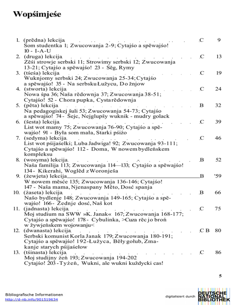 Wopśimjeśe 1. (prĕdna) lekcija Som studentka 1; Zwucowanja 2-9; Cytajśo a spĕwajśo! 10 - I-A-U 2. (druga) lekcija Zĕśi strowje serbski 11; Strowimy serbski 12; Zwucowanja 13-21; Cytajśo a spĕwajśo! 23 - Sĕg, Rymy 3. (tśeśa) lekcija Wuknjomy serbski 24; Zwucowanja 25-34; Cytajśo a spĕwajśo! 35 - Na serbsku Łužycu, Do žnjow 4. (stworta) lekcija Nowa śpa 36; Naša rĕdownja 37; Zwucowanja 38-51; Cytajśo! 52 - Chora pupka, Cysta rĕdownja 5. (pĕta) lekcija Na pedagogiskej šuli 53; Zwucowanja 54-73; Cytajśo a spĕwajśo! 74 - Šejc, Nejglupšy wuknik - mudry golack 6. (šesta) lekcija List wot mamy 75; Zwucowanja 76-90; Cytajśo a spĕwajśo! 91 - Była som mała, Starki pśiźo 7. (sedyma) lekcija List wot pśijaśelki; Luba Jadwiga! 92; Zwucowanja 93-111; Cytajśo a spĕwajśo! 112 - Doma, W nowem bydleńskem kompleksu 8. (wosyma) lekcija Naša familija 113; Zwucowanja 114—133; Cytajśo a spĕwajśo! 134 - Kikerahi, Woglĕd z Woronješa 9. (źewjeta) lekcija W nowem mĕsće 135; Zwucowanja 136-146; Cytajśo! 147 - Naša mama, Njenaspany Mĕto, Dosć spanja 10. (źaseta) lekcija Našo bydlenje 148; Zwucowanja 149-165; Cytajśo a spĕwajśo! 166 - Žednje dosć, Naš kot 11. (jadnasta) lekcija Moj studium na SWW »K. Janak« 167; Zwucowanja 168-177; Cytajśo a spĕwajśo! 178 - Cybulinka, >Cuza rĕc jo broń w žywjeńskem wojowanju< 12. (dwanasta) lekcija Serbski komunist Korla Janak 179; Zwucowanja 180-191; Cytajśo a spĕwajśo! 192-Łužyca, Bĕły gołub, Zmakanje starych pśijaśełow 13. (tśinasta) lekcija Moj studijny źeń 193; Zwucowanja 194-202 Cytajśo! 203 -Tyźeń, Wukni, ale wukni kuždycki cas! C 9 C 13 C 19 C 24 B 32 C 39 C 46 B 52 B '59 B 66 C 75 C B 80 C 86 5 http://d-nb.info/901519634 (styrnasta) lekcija Naš internat 204; Zwucowanja 205-213; Cytajśo a spĕwajśo! 214 - Naša ajtka, Gola a kral wužow (pĕśnasta) lekcija List z Budyšyna - Luba Marita! 215; Zwucowanja 216-221; Cytajśo! 222 - Mysli swinjarja, tog' Dunča, W źiwadle (šesnasta) lekcija Budu źĕśownica 223; Zwucowanja 224-231; Cytajśo a spĕwajśo! 232 - Stup dalej!, Šakal a law (sedymnasta) lekcija Studowaś jo našo źĕło 233; Zwucowanja 234-256; Cytajśo! 257 - Roztyla, SWW - kubłanišćo pedagogow a źĕśownicow (wosymnasta) lekcija W źĕśowni 258; Zwucowanja 259-267; Cytajśo a spĕwajśo! 268 - Dešć, Njepšawe rymy (źewjeśnasta) lekcija Ducy do źĕśownje 269; Mĕrko w mĕsće 270; Milenka na jsy 271; Zwucowanja 272-282; Cytajśo! 283- Z e źĕłarnje, We wukraju (dwaźasta) lekcija Kupka pśi jĕźi 284; Zwucowanja 285-293; Cytajśo! 294 - Griby, Kocka a griby (jadenadwaźasta) lekcija W myjarni 295; Zwucowanja 296-306; Cytajśo! 307 - Zegerik, Tłusty - radnje tłusty - pśetłusty (dwaadwaźasta) lekcija Naše grajki 308; Źĕśi grajkaju 309; Zwucowanja 310-318; Cytajśo! 3 1 9 - Moje grajki, Zo ga ty rad grajkaš? (tśiadwaźasta) lekcija Naša drastwa 320; Po wobjeźe źĕśi spiju 321; Kupka źo do parka 322; Zwucowanja 323-333; Cytajśo! 334 - Som policist, Wjasele a strowje (styriadwaźasta) lekcija Jaden źeń w źĕśowni 335; Zwucowanja 336-343; Cytajśo! 344 - Zajtša, Našo grumno, Słowko wo swojom powołanju (pĕśadwaźasta) lekcija Nowa źĕśownja 345; Zwucowanja 346-367; Cytajśo! 368 - Witaj došule!, Nowy chrom za źĕśi, Z wejsańskeje chroniki 91 97 102 107 117 123 131 137 143 149 155 161