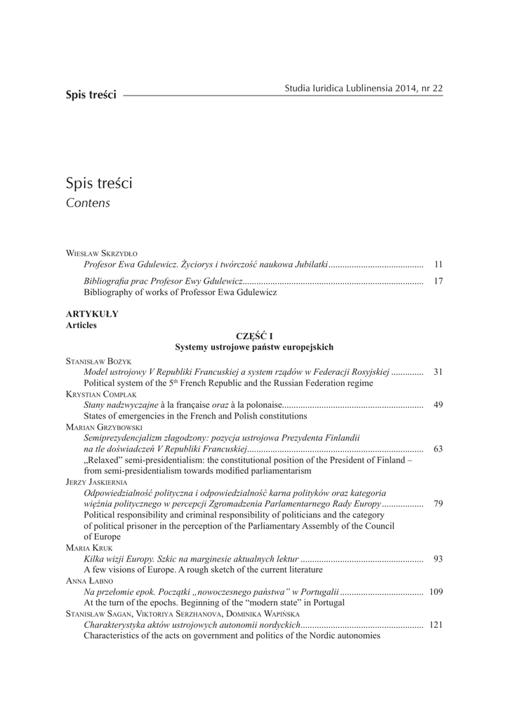 Spis treści Studia Iuridica Lublinensia 2014, nr 22 Spis treści Contens Wiesław Skrzydło Profesor Ewa Gdulewicz. Życiorys i twórczość naukowa Jubilatki.......................................... 11 Bibliografia prac Profesor Ewy Gdulewicz.............................................................................. 17 Bibliography of works of Professor Ewa Gdulewicz ARTYKUŁY Articles Część I Systemy ustrojowe państw europejskich Stanisław Bożyk Model ustrojowy V Republiki Francuskiej a system rządów w Federacji Rosyjskiej............... 31 Political system of the 5th French Republic and the Russian Federation regime Krystian Complak Stany nadzwyczajne à la française oraz à la polonaise............................................................. 49 States of emergencies in the French and Polish constitutions Marian Grzybowski Semiprezydencjalizm złagodzony: pozycja ustrojowa Prezydenta Finlandii na tle doświadczeń V Republiki Francuskiej............................................................................. 63 „Relaxed” semi-presidentialism: the constitutional position of the President of Finland – from semi-presidentialism towards modified parliamentarism Jerzy Jaskiernia Odpowiedzialność polityczna i odpowiedzialność karna polityków oraz kategoria więźnia politycznego w percepcji Zgromadzenia Parlamentarnego Rady Europy................... 79 Political responsibility and criminal responsibility of politicians and the category of political prisoner in the perception of the Parliamentary Assembly of the Council of Europe Maria Kruk Kilka wizji Europy. Szkic na marginesie aktualnych lektur...................................................... 93 A few visions of Europe. A rough sketch of the current literature Anna Łabno Na przełomie epok. Początki „nowoczesnego państwa” w Portugalii..................................... 109 At the turn of the epochs. Beginning of the “modern state” in Portugal Stanisław Sagan, Viktoriya Serzhanova, Dominika Wapińska Charakterystyka aktów ustrojowych autonomii nordyckich...................................................... 121 Characteristics of the acts on government and politics of the Nordic autonomies 8 Spis treści Jarosław Szymanek Reprezentacja polityczna w ujęciu doktryny francuskiej.......................................................... 135 The political representative government from the perspective of the French doctrine Jan Wawrzyniak O niektórych osobliwościach Konstytucji V Republiki Francuskiej......................................... 149 The original and hybrid character of the Constitution of the 5th French Republic CZĘŚĆ II Konstytucyjnoustrojowe instytucje w państwie demokratycznym Bogusław Banaszak, Krzysztof Wygoda Funkcjonowanie sądownictwa administracyjnego w Polsce w zderzeniu z problemami współczesności – wybrane zagadnienia.................................................................................... 165 Functioning of the administrative judiciary in Poland facing the problems of the contemporary society – selected problems Andrzej Bisztyga Terenowa administracja rządowa oraz samorząd terytorialny w Republice Kazachstanu. Aspekt konstytucyjny................................................................................................................. 179 Local government administration and local authority in the Republic of Kazakhstan. The constitutional aspect Jerzy Ciapała Wpływ aktów prawnych samorządów zawodowych i gospodarczych na konstytucyjne wolności działalności gospodarczej oraz wyboru i wykonywania zawodu. Uwagi w kontekście konstytucyjnego statusu samorządów...................................................... 199 The impact of legal acts of self-governed professional and business chambers on two constitutional freedoms: freedom of establishment, and freedom of choice and execution of profession. Remarks in the context of the constitutional self-government status Dariusz Dudek Biznes i (nie)odpowiedzialność konstytucyjna posła................................................................ 219 Business and constitutional (ir)responsibility of the Deputy Teresa Liszcz Praca i kapitał w Konstytucji Rzeczypospolitej Polskiej.......................................................... 253 Labour and capital in the Constitution of the Republic of Poland Ryszard Piotrowski Demokracja a finansowanie partii politycznych w świetle Konstytucji RP.............................. 279 Democracy and the financing of political parties in view of the Constitution of the Republic of Poland Paweł Sarnecki Głowa państwa w obu polskich konstytucjach kwietniowych................................................... 297 The „head of State” in both Polish „April” Constitutions Krzysztof Skotnicki Stałe zamieszkanie w gminie jako podstawa wpisu do rejestru wyborców i udziału w wyborach organów gminy oraz referendum gminnym ......................................................... 309 Permanent place of residence in the municipality as the basic requirement of the electoral register and participation in the municipal authorities elections or in minicipal referendum Stanisław Leszek Stadniczeńko Konstytucjonalizacja dialogu społecznego............................................................................... 317 Constitutionalisation of social dialogue Małgorzata Stefaniuk Rola opinii publicznej w wystąpieniach posłów VI kadencji Sejmu Rzeczypospolitej Polskiej...................................................................................................................................... 333 The role of public opinion in the speeches by deputies to the Republic of Poland’s Parliament of the Sixth-Term Spis treści 9 Mariusz Śladkowski Podejmowanie dodatkowego zatrudnienia przez sędziów w świetle Konstytucji RP............... 361 The judge undertaking additional employment in view of the Constitution of the Repu