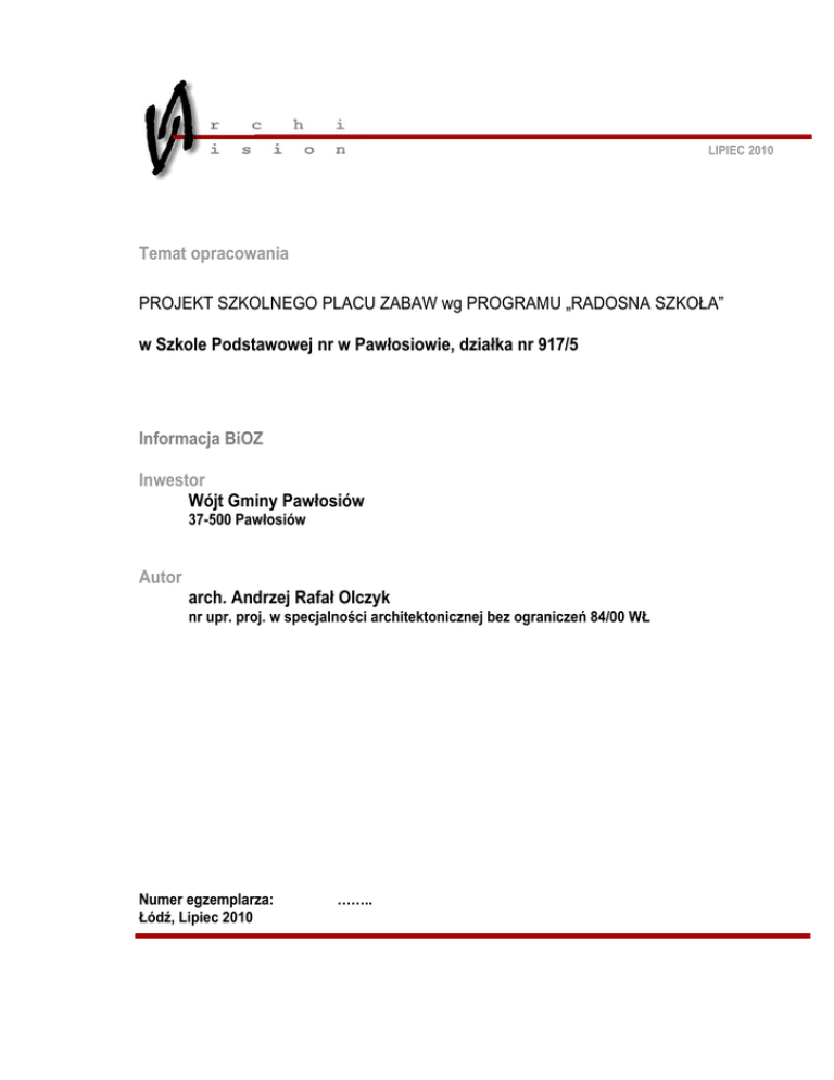 LIPIEC 2010 Temat opracowania PROJEKT SZKOLNEGO PLACU ZABAW wg PROGRAMU „RADOSNA SZKOŁA” w Szkole Podstawowej nr w Pawłosiowie, działka nr 917/5 Informacja BiOZ Inwestor Wójt Gminy Pawłosiów 37-500 Pawłosiów Autor arch. Andrzej Rafał Olczyk nr upr. proj. w specjalności architektonicznej bez ograniczeń 84/00 WŁ Numer egzemplarza: Łódź, Lipiec 2010 …….. 2 Część opisowa informacji BiOZ: zakres robót dla całego zamierzenia budowlanego oraz kolejność realizacji poszczególnych obiektów: projekt szkolnego placu zabaw wg programu „Radosna Szkoła” w Szkole Podstawowej w Pawłosiowie, działka nr 917/5 1) 2) wykaz istniejących obiektów budowlanych: budynki Szkoły poza obszarem objętym opracowaniem. wskazanie elementów zagospodarowania działki lub terenu, które mogą stwarzać zagrożenie bezpieczeństwa i zdrowia ludzi: brak elementów zagospodarowania działki lub terenu, które mogą stwarzać zagrożenie bezpieczeństwa i zdrowia ludzi. 3) wskazanie dotyczące przewidywanych zagrożeń występujących podczas realizacji robót budowlanych, określające skalę i rodzaje zagrożeń oraz miejsce i czas ich wystąpienia: brak przewidywanych zagrożeń występujących podczas realizacji robót budowlanych. 4) wskazanie sposobu prowadzenia instruktażu pracowników przed przystąpieniem do realizacji robót szczególnie niebezpiecznych: roboty szczególnie niebezpieczne nie występują w trakcie realizacji opisywanego zadania inwestycyjnego, nie ma więc potrzeby prowadzenia dodatkowego instruktażu pracowników przed przystąpieniem do ich realizacji. 5) wskazanie środków technicznych i organizacyjnych, zapobiegających niebezpieczeństwom wynikającym z wykonywania robót budowlanych w strefach szczególnego zagrożenia zdrowia lub w ich sąsiedztwie, w tym zapewniających bezpieczną i sprawną komunikację, umożliwiającą szybką ewakuację na wypadek pożaru, awarii i innych zagrożeń: brak stref szczególnego zagrożenia zdrowia lub ich sąsiedztwa. 6) Zadanie inwestycyjne opracowywane w przedkładanej dokumentacji nie spełnia wymienionych w ustawie i rozporządzeniu warunków i dlatego nie wymaga sporządzania planu BiOZ. Jednakże wszystkie osoby wykonujące roboty budowlane na terenie posesji są obowiązane stosować środki ochrony indywidualnej lub inne urządzenia ochronne. A w przypadku gdy kierownik budowy przewiduje wykonywanie robót budowlanych trwających dłużej niż 30 dni roboczych i jednoczesne zatrudnienie co najmniej 20 osób albo zaplanuje zakres robót przekracza 500 osobodni. Inwestor zawiadomi o zamiarze rozpoczęcia robót budowlanych właściwego inspektora pracy, na 7 dni przed rozpoczęciem budowy lub rozbiórki, a kierownik budowy sporządzi planu BiOZ. mgr inż.arch. Andrzej Olczyk nr upr. 84/00/WŁ Archi-Vision – Biuro w Łodzi ul. Joselewicza 13 – 91- 830 FAX. (48 42) 657 31 96 – MOBILE 600-390-661- [email protected] WWW. ARCHI-VISION.PL