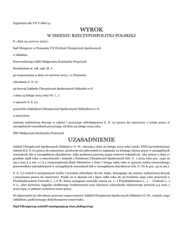 Sygnatura akt VII U 666/15 WYROK W IMIENIU RZECZYPOSPOLITEJ POLSKIEJ P., dnia 24 czerwca 2015 r. Sąd Okręgowy w Poznaniu VII Wydział Ubezpieczeń Społecznych w składzie: Przewodniczący:SSO Małgorzata Kuźniacka-Praszczyk Protokolant:st. sek. sąd. M. J. po rozpoznaniu w dniu 10 czerwca 2015 r. w Poznaniu odwołania Z. S. (1) od decyzji Zakładu Ubezpieczeń Społecznych Oddziału w O. z dnia 23 lutego 2015 roku Nr (...) w sprawie Z. S. (1) przeciwko Zakładowi Ubezpieczeń Społecznych Oddziałowi w O. o emeryturę zmienia zaskarżoną decyzję w całości i przyznaje odwołującemu Z. S. (1) prawo do emerytury z tytułu pracy w szczególnych warunkach poczynając od dnia 23 lutego 2015 roku. SSO Małgorzata Kuźniacka-Praszczyk UZASADNIENIE Zakład Ubezpieczeń Społecznych Oddział w O. W.. decyzją z dnia 23 lutego 2015 roku (znak: ENS/25/026062164) odmówił Z. S. (1) prawa do emerytury, ponieważ nie udowodnił co najmniej 15-letniego okresu pracy w szczególnych warunkach lub w szczególnym charakterze. Jako podstawę prawną organ rentowy wskazał art. 184 ustawy z dnia 17 grudnia 1998 roku o emeryturach i rentach z Funduszu Ubezpieczeń Społecznych (Dz. U. z 2013 roku poz. 1440 ze zm.) oraz § 2 ust. 2 i § 4 rozporządzenia Rady Ministrów z dnia 7 lutego 1983 roku w sprawie wieku emerytalnego pracowników zatrudnionych w szczególnych warunkach lub w szczególnym charakterze (Dz. U. Nr 8, poz. 43 ze zm.). Z. S. (1) wniósł w przepisanym trybie i terminie odwołanie do tut. Sądu, domagając się zmiany zaskarżonej decyzji i przyznania prawa do emerytury. Podał, że w okresie od 1 lipca 1986 roku do 30 kwietnia 1995 roku pracował w Przedsiębiorstwie Centrala (...) w R., które następnie zmieniło nazwę na (...) Przedsiębiorstwo (...) – Centrala (...) w L., jako kierowca ciągnika siodłowego (traktorzysta) oraz kierowca samochodu ciężarowego powyżej 3,5 tony z przyczepą, w pełnym wymiarze czasu pracy. W odpowiedzi na odwołanie pozwany organ rentowy Zakład Ubezpieczeń Społecznych Oddział w O. W.. wniósł o jego oddalenie, podtrzymując dotychczasowe stanowisko. Sąd Okręgowy ustalił następujący stan faktyczny: Odwołujący Z. S. (1) ur. (...) ma wykształcenie podstawowe. Ukończył Podstawowe Studium Zawodowe o kierunku zbrojarz – betoniarz i kurs mechanizacji rolnictwa. Od 28 grudnia 1973 roku odwołujący posiada prawo jazdy ważne na maszyny samobieżne (kategorii M) oraz ciągniki rolnicze, inne ciągniki, których cechy konstrukcyjne ograniczają szybkość do 25 km na godzinę, łącznie z przyczepami o dopuszczalnym ciężarze całkowitym przyczepy lub przyczep do 12 ton (kategorii T). Odwołujący posiada łącznie na dzień 1 stycznia 1999 roku 25 lat, 9 miesięcy i 29 dni okresów składkowych i nieskładkowych (co było bezsporne). W dniu 27 stycznia 2015 roku odwołujący złożył wniosek o emeryturę. W dniu 23 lutego 2015 roku odwołujący ukończył 60 lat. Nie jest członkiem otwartego funduszu emerytalnego. ZUS na podstawie przedłożonych dokumentów uznał jako okres wykonywania pracy w szczególnych warunkach okres od 15 października 1973 roku do 13 lipca 1983 roku z tytułu zatrudnienia w Państwowym Gospodarstwie Rolnym w W. Zakład Rolny (...) na stanowisku kierowcy ciągnika kołowego (tj. 9 lat i 9 dni) oraz okres od 14 lipca 1983 roku do 30 czerwca 1986 roku z tytułu zatrudnienia w Wojewódzkim Ośrodku (...) w B. na stanowisku kierowcy ciągnika kołowego (tj. 2 lata 11 miesięcy i 18 dni), łącznie 12 lat 8 miesięcy i 17 dni. Na dzień złożenia wniosku o emeryturę odwołujący pozostawał w stosunku pracy w Zakładzie Produkcji (...) C. B., H. K. w R.. W dniu 23 lutego 2015 roku ZUS wydał zaskarżoną decyzję. W okresie od 1 lipca 1986 roku do 30 kwietnia 1995 roku (tj. przez 8 lat i 10 miesięcy) odwołujący był zatrudniony w Przedsiębiorstwie (...) spółka z o. o. z siedzibą w R. na podstawie umowy o pracę w pełnym wymiarze czasu pracy. W okresie zatrudnienia w tym Przedsiębiorstwie odwołujący ukończył w dniu 2 kwietnia 1987 roku kurs obsługi wózka akumulatorowego i obsługi wózka spalinowego oraz w 1988 roku kurs prawa jazdy kategorii C. Na podstawie umowy o pracę z dnia 1 lipca 1986 roku odwołujący został zatrudniony na stanowisku pracownika magazynowo –technologiczno - transportowego. Z dniem 1 października 1986 roku zlecono odwołującemu wykonywanie czynności spedycyjnych w pełnym zakresie: za i wyładunek, rozliczenie, odpowiedzialność materialna. W dniu 23 czerwca 1989 roku odwołujący został upoważniony do kierowania wózkami jezdnymi na terenie Zakładu (...). W dokumentach w postaci powołania na wyższe stanowisko ze zmianą wynagrodzenia wpisano następujące stanowiska zajmowane przez odwołującego: z dnia 27 sierpnia 1986 roku – pracownik magazynowy, z dnia 4 sierpnia 1987 roku pracownik magazynowo – transportowy, z dnia 30 marca 1988 roku pracownik magazynowo – transportowy kierowca, z dnia 29 października 1988 roku pracownik magazynowo - transportowy, z dnia 31 stycznia 1989 roku pracownik magazynowo – transportowy, z dnia 23 maja 1989 roku pracownik magazynowo – transportowy, z dnia 1 lipca 1989 roku pracownik magazynowo – transportowy, z dnia 12 września 1989 roku pracownik magazynowo – transportowy, z dnia 24 listopada 1989 roku pracownik magazynowo – transportowy, z dnia 29 stycznia 1990 roku pracownik magazynowo – transportowy, z dnia 28 lutego 1990 roku kierowca, z dnia 30 kwietnia 1990 roku kierowca, z dnia 31 lipca 1990 roku kierowca, z dnia 3 października 1990 roku kierowca, z dnia 29 stycznia 1991 roku kierowca, z dnia 1 lipca 1991 roku kierowca, z dnia 14 lutego 1992 roku kierowca, z dnia 15 maja 1992 roku kierowca, z dnia 8 lipca 1992 roku kierowca. W świadectwie pracy z dnia 2 maja 1995 roku wpisano, że odwołujący był zatrudniony na stanowisku kierowca – robotnik. Nadto, że w okresie zatrudnienia przebywał na zasiłku