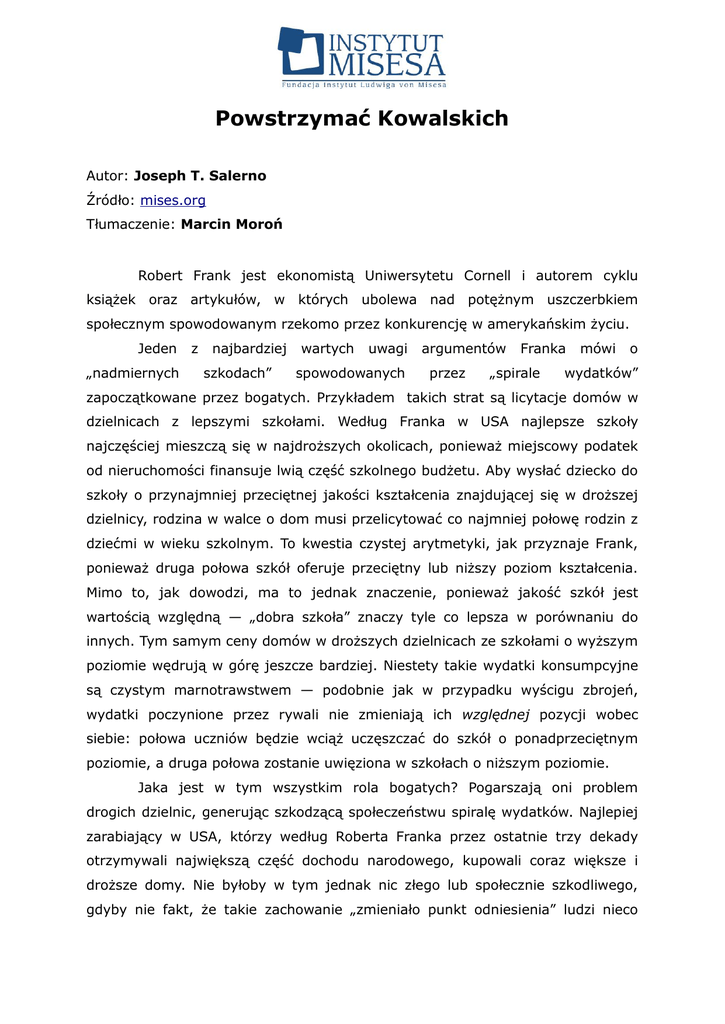 Powstrzymać Kowalskich Autor: Joseph T. Salerno Źródło: mises.org Tłumaczenie: Marcin Moroń Robert Frank jest ekonomistą Uniwersytetu Cornell i autorem cyklu książek oraz artykułów, w których ubolewa nad potężnym uszczerbkiem społecznym spowodowanym rzekomo przez konkurencję w amerykańskim życiu. Jeden „nadmiernych z najbardziej szkodach” wartych uwagi spowodowanych argumentów przez Franka „spirale mówi o wydatków” zapoczątkowane przez bogatych. Przykładem takich strat są licytacje domów w dzielnicach z lepszymi szkołami. Według Franka w USA najlepsze szkoły najczęściej mieszczą się w najdroższych okolicach, ponieważ miejscowy podatek od nieruchomości finansuje lwią część szkolnego budżetu. Aby wysłać dziecko do szkoły o przynajmniej przeciętnej jakości kształcenia znajdującej się w droższej dzielnicy, rodzina w walce o dom musi przelicytować co najmniej połowę rodzin z dziećmi w wieku szkolnym. To kwestia czystej arytmetyki, jak przyznaje Frank, ponieważ druga połowa szkół oferuje przeciętny lub niższy poziom kształcenia. Mimo to, jak dowodzi, ma to jednak znaczenie, ponieważ jakość szkół jest wartością względną — „dobra szkoła” znaczy tyle co lepsza w porównaniu do innych. Tym samym ceny domów w droższych dzielnicach ze szkołami o wyższym poziomie wędrują w górę jeszcze bardziej. Niestety takie wydatki konsumpcyjne są czystym marnotrawstwem — podobnie jak w przypadku wyścigu zbrojeń, wydatki poczynione przez rywali nie zmieniają ich względnej pozycji wobec siebie: połowa uczniów będzie wciąż uczęszczać do szkół o ponadprzeciętnym poziomie, a druga połowa zostanie uwięziona w szkołach o niższym poziomie. Jaka jest w tym wszystkim rola bogatych? Pogarszają oni problem drogich dzielnic, generując szkodzącą społeczeństwu spiralę wydatków. Najlepiej zarabiający w USA, którzy według Roberta Franka przez ostatnie trzy dekady otrzymywali największą część dochodu narodowego, kupowali coraz większe i droższe domy. Nie byłoby w tym jednak nic złego lub społecznie szkodliwego, gdyby nie fakt, że takie zachowanie „zmieniało punkt odniesienia” ludzi nieco mniej zamożnych, obracających się w tych samych kręgach społecznych co bogaci. Ta grupa aspirujących do grona bogatych, niemalże należąca do elity, zaczęła czuć presję, aby także powiększyć swoje posiadłości w celu utrzymania społecznej pozycji. W ten sposób szał budowania zbyt dużych domów ogarniał wyższe i stopniowo także średnie klasy, które również uległy budowlanej gorączce. Oczywiście nikt nie stał się w ten sposób szczęśliwszy, gdyż — tak, zgadliście! — względne rozmiary domów i pozycja społeczna poszczególnych grup nie zmieniła się za bardzo. Jedynym efektem spirali wydatków jest olbrzymie marnotrawstwo rzadkich zasobów, które mogłyby zostać użyte do zwiększenia dobrobytu społeczeństwa. Niestety, zostały one bezpowrotnie stracone przez budowę niepotrzebnych zasobów mieszkaniowych. Frank przywołuje tutaj zasadę szkody Johna Stuarta Milla — rząd ma prawo legalnie ograniczać swobodę ludzi tylko wtedy, gdy zapobiegnie to krzywdzie wyrządzanej innym. Nasz profesor należący do Ligi Bluszczowej używa zasady Milla jako naukowego płaszczyka dla swojego akademickiego sądu wartościującego, według którego spirala wydatków mieszkaniowych zapoczątkowana przez bogaczy jest nie tylko marnotrawstwem, ale powoduje ponadto przesadne szkody u rodzin z klasy średniej. Według Franka, istniejące prawa własności, łącznie z obecnym prawem podatkowym, łamią tym samym zasadę szkody Milla i muszą być zreformowane w taki sposób, aby pobudzać efektywne wykorzystanie zasobów. Zasadniczo Frank uważa, że skoro „pogoń za Kowalskimi” jest społecznie szkodliwa, powinniśmy ściągnąć cugle i powstrzymać wszystkich „Kowalskich” na świecie. Odpowiednio wysoki progresywny podatek konsumpcyjny zaczynający się od stawki 10% i rosnący aż do skrajnej stawki 100% — tak, dobrze widzicie, 100% — stłumiłby wszystkie rozrzutne spirale wydatków. Co więcej, Frank uważa, że nie tylko skłaniałby on bogatych do budowania mniejszych posiadłości, ale spowodowałby, że byliby szczęśliwsi niż w czasach poprzedniego systemu podatkowego, ponieważ ostatecznie to względny rozmiar domu ma znaczenie. Zgubne i daremne spirale wydatków zostały zainicjowane przez bogatych także w innych dziedzinach — jak choćby śluby, których przeciętny koszt w USA po uwzględnieniu inflacji wzrósł w latach 1980–2007 trzykrotnie. Oczywiście, jak przyznaje Frank, rodziny z klasy średniej pokrzywdzone spiralą wydatków mogłyby odrzucić modę na coraz wystawniejsze wesela, ale w tym przypadku, jak ubolewa Frank, robiłyby to wyłącznie „rozczarowując najbliższych lub stwarzając wrażenie, że nie potrafiły docenić wagi wydarzenia, które świętowały”. I to przywodzi nas do Afganistanu. W ubiegłym roku afgańskie Ministerstwo Sprawiedliwości przedstawiło projekt prawa mającego zatrzymać Frankowskie spirale wydatków wpływające na rozmiar i wystawność wesel. Zamożne afgańskie rodziny potrafią zapraszać na swoje wesela nawet tysiąc gości, a niektóre panny młode zmieniają w ich trakcie swoje kreacje nawet dziesięć razy. Stanowi to przykład dla uboższych rodzin, a jednocześnie nakłada na nie presję organizowania bogatszych wesel, przez co niektóre rodziny popadają w długi, a dzieci innych w ogóle zniechęcają się do małżeństwa. Proponowane prawo ograniczałoby maksymalną liczbę gości do 300, a koszt imprezy na 5 USD od osoby. Dodatkowo panna młoda mogłaby posiadać jedynie jedną suknię na przyjęcie zaręczynowe i jedną na ślub. Prawo ustanawiałoby także komisje ślubne współpracujące z policją, w których skład wchodziliby członkowie Ministerstwa Religii. Pomysł ten przypomina