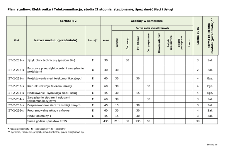 Liczba ECTS Forma zaliczenia modułu (przedmiotu)** Plan studiów: Elektronika i Telekomunikacja, studia II stopnia, stacjonarne, Specjalność Sieci i Usługi 3 Zal. 2 Zal. 4 Egz. 4 Egz. 4 Egz. 3 Zal. 30 3 Zal. 30 30 4 Zal. 45 15 30 3 Zal. 435 210 SEMESTR 2 Godziny w semestrze IET-2-201-s Język obcy techniczny (poziom B+) E 30 IET-2-202-s Podstawy przedsiębiorczości i zarządzanie projektami C 30 30 IET-2-231-s Projektowanie sieci telekomunikacyjnych E 60 30 IET-2-232-s Kierunki rozwoju telekomunikacji E 60 30 IET-2-233-s Modelowanie i symulacja sieci i usług E 45 30 IET-2-234-s Zarządzanie sieciami i usługami telekomunikacyjnymi E 60 30 IET-2-235-s Bezprzewodowe sieci transmisji danych E 45 15 IET-2-236-s Programowalne układy cyfrowe E 60 Moduł obieralny 1 E Suma godzin i punktów ECTS 30 30 30 15 30 30 135 60 inne ... Zajęcia praktyczne Zajęcia seminaryjne Konwersatorium suma Ćw. projektowe Rodzaj* Ćw. laborat. Nazwa modułu (przedmiotu) Ćw. audyt. Kod Wykład Forma zajęć dydaktycznych 30 * rodzaj przedmiotu: C – obowiązkowy, E – obieralny ** egzamin, zaliczenie, projekt, praca kontrolna, praca przejściowa itp. Strona 5 z 9 Rodzaj* suma Wykład Liczba ECTS Forma zaliczenia modułu (przedmiotu)** Plan studiów: Elektronika i Telekomunikacja, studia II stopnia, stacjonarne, Specjalność Sieci i Usługi Moduł obieralny 2 E 45 15 30 2 Zal. Moduł obieralny 3 E 45 15 30 2 Zal. Moduł obieralny 4 (prowadzony w j. obcym) E 45 15 30 3 Zal. IET-2-334-s Seminarium dyplomowe E 30 3 Zal. IET-2-335-s Praca dyplomowa E 20 Obrona pracy SEMESTR 3 Godziny w semestrze Suma godzin i punktów ECTS 165 30 45 90 30 inne ... Zajęcia praktyczne Zajęcia seminaryjne Konwersatorium Ćw. projektowe Nazwa modułu (przedmiotu) Ćw. laborat. Kod Ćw. audyt. Forma zajęć dydaktycznych 30 * rodzaj przedmiotu: C – obowiązkowy, E – obieralny ** egzamin, zaliczenie, projekt, praca kontrolna, praca przejściowa itp. Strona 9 z 9