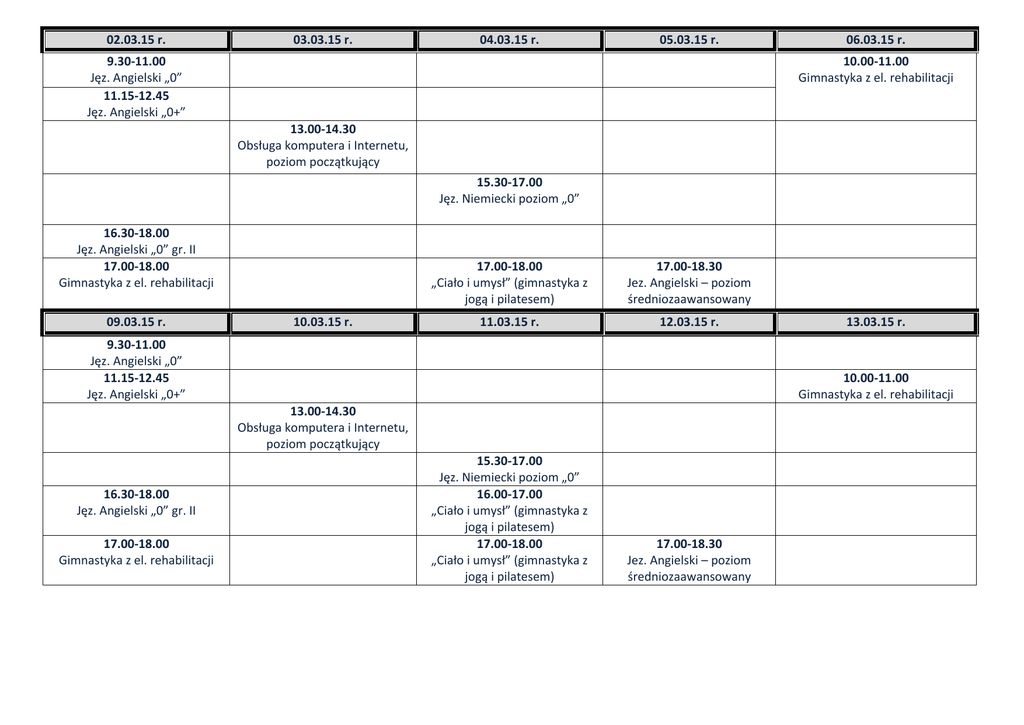 02.03.15 r. 03.03.15 r. 04.03.15 r. 05.03.15 r. 9.30-11.00 Jęz. Angielski „0” 11.15-12.45 Jęz. Angielski „0+” 06.03.15 r. 10.00-11.00 Gimnastyka z el. rehabilitacji 13.00-14.30 Obsługa komputera i Internetu, poziom początkujący 15.30-17.00 Jęz. Niemiecki poziom „0” 16.30-18.00 Jęz. Angielski „0” gr. II 17.00-18.00 Gimnastyka z el. rehabilitacji 09.03.15 r. 10.03.15 r. 17.00-18.00 „Ciało i umysł” (gimnastyka z jogą i pilatesem) 17.00-18.30 Jez. Angielski – poziom średniozaawansowany 11.03.15 r. 12.03.15 r. 9.30-11.00 Jęz. Angielski „0” 11.15-12.45 Jęz. Angielski „0+” 10.00-11.00 Gimnastyka z el. rehabilitacji 13.00-14.30 Obsługa komputera i Internetu, poziom początkujący 16.30-18.00 Jęz. Angielski „0” gr. II 17.00-18.00 Gimnastyka z el. rehabilitacji 13.03.15 r. 15.30-17.00 Jęz. Niemiecki poziom „0” 16.00-17.00 „Ciało i umysł” (gimnastyka z jogą i pilatesem) 17.00-18.00 „Ciało i umysł” (gimnastyka z jogą i pilatesem) 17.00-18.30 Jez. Angielski – poziom średniozaawansowany 16.03.15 r. 17.03.15 r. 18.03.15 r. 19.03.15 r. 9.30-11.00 Jęz. Angielski „0” 11.15-12.45 Jęz. Angielski „0+” 10.00-11.00 Gimnastyka z el. rehabilitacji 13.00-14.30 Obsługa komputera i Internetu, poziom początkujący 15.30-17.00 Zasady zdrowego żywienia – Żywność bio (zdrowa, ekologiczna)- leczenie dietą Koszt 10 zł 16.30-18.00 Jęz. Angielski „0” gr. II 17.00-18.00 Gimnastyka z el. rehabilitacji 23.03.15 r. 20.03.15 r. 24.03.15 r. 15.30-17.00 Jęz. Niemiecki poziom „0” 16.00-17.00 „Ciało i umysł” (gimnastyka z jogą i pilatesem) 17.00-18.00 „Ciało i umysł” (gimnastyka z jogą i pilatesem) 17.00-18.30 Jez. Angielski – poziom średniozaawansowany 25.03.15 r. 26.03.15 r. 9.30-11.00 Jęz. Angielski „0” 11.15-12.45 Jęz. Angielski „0+” 27.03.15 r. 10.00-11.00 Gimnastyka z el. rehabilitacji 13.00-14.30 Obsługa komputera i Internetu, poziom początkujący 16.30-18.00 Jęz. Angielski „0” gr. II 17.00-18.00 Gimnastyka z el. rehabilitacji 15.30-17.00 Jęz. Niemiecki poziom „0” 16.00-17.00 „Ciało i umysł” (gimnastyka z jogą i pilatesem) 17.00-18.00 „Ciało i umysł” (gimnastyka z jogą i pilatesem) AKADEMIA ZDROWEGO AKTYWNEGO I BEZPIECZNEGO STARZENIA SIĘ www.stronadlaseniora.pl 17.00-18.30 Jez. Angielski – poziom średniozaawansowany Zapisy na zajęcia pod nr tel. 664 999 886
