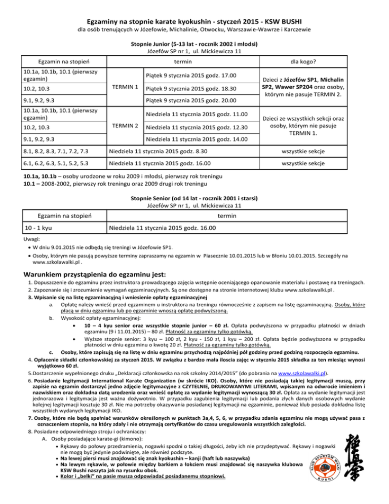 Egzaminy na stopnie karate kyokushin - styczeń 2015 - KSW BUSHI dla osób trenujących w Józefowie, Michalinie, Otwocku, Warszawie-Wawrze i Karczewie Stopnie Junior (5-13 lat - rocznik 2002 i młodsi) Józefów SP nr 1, ul. Mickiewicza 11 Egzamin na stopień termin 10.1a, 10.1b, 10.1 (pierwszy egzamin) 10.2, 10.3 dla kogo? Piątek 9 stycznia 2015 godz. 17.00 TERMIN 1 Piątek 9 stycznia 2015 godz. 18.30 9.1, 9.2, 9.3 Piątek 9 stycznia 2015 godz. 20.00 10.1a, 10.1b, 10.1 (pierwszy egzamin) Niedziela 11 stycznia 2015 godz. 11.00 10.2, 10.3 9.1, 9.2, 9.3 TERMIN 2 Niedziela 11 stycznia 2015 godz. 12.30 Dzieci z Józefów SP1, Michalin SP2, Wawer SP204 oraz osoby, którym nie pasuje TERMIN 2. Dzieci ze wszystkich sekcji oraz osoby, którym nie pasuje TERMIN 1. Niedziela 11 stycznia 2015 godz. 14.00 8.1, 8.2, 8.3, 7.1, 7.2, 7.3 Niedziela 11 stycznia 2015 godz. 8.30 wszystkie sekcje 6.1, 6.2, 6.3, 5.1, 5.2, 5.3 Niedziela 11 stycznia 2015 godz. 16.00 wszystkie sekcje 10.1a, 10.1b – osoby urodzone w roku 2009 i młodsi, pierwszy rok treningu 10.1 – 2008-2002, pierwszy rok treningu oraz 2009 drugi rok treningu Stopnie Senior (od 14 lat - rocznik 2001 i starsi) Józefów SP nr 1, ul. Mickiewicza 11 Egzamin na stopień 10 - 1 kyu termin Niedziela 11 stycznia 2015 godz. 16.00 Uwagi: W dniu 9.01.2015 nie odbędą się treningi w Józefowie SP1. Osoby, którym nie pasują powyższe terminy zapraszamy na egzamin w Piasecznie 10.01.2015 lub w Błoniu 10.01.2015. Szczegóły na www.szkolawalki.pl . Warunkiem przystąpienia do egzaminu jest: 1. Dopuszczenie do egzaminu przez instruktora prowadzącego zajęcia wstępnie oceniającego opanowanie materiału i postawę na treningach. 2. Zapoznanie się i zrozumienie wymagań egzaminacyjnych. Są one dostępne na stronie internetowej klubu www.szkolawalki.pl . 3. Wpisanie się na listę egzaminacyjną i wniesienie opłaty egzaminacyjnej a. Opłatę należy wnieść przed egzaminem u instruktora na treningu równocześnie z zapisem na listę egzaminacyjną. Osoby, które płacą w dniu egzaminu lub po egzaminie wnoszą opłatę podwyższoną. b. Wysokość opłaty egzaminacyjnej: 10 – 4 kyu senior oraz wszystkie stopnie junior – 60 zł. Opłata podwyższona w przypadku płatności w dniach egzaminu (9 i 11.01.2015) – 80 zł. Płatność za egzaminy tylko gotówką. Wyższe stopnie senior: 3 kyu – 100 zł, 2 kyu - 150 zł, 1 kyu – 200 zł. Opłata będzie podwyższona w przypadku płatności w dniu egzaminu o kwotę 20 zł. Płatność za egzaminy tylko gotówką. c. Osoby, które zapisują się na listę w dniu egzaminu przychodzą najpóźniej pół godziny przed godziną rozpoczęcia egzaminu. 4. Opłacenie składki członkowskiej za styczeń 2015. W związku z bardzo mała iloscia zajęc w styczniu 2015 składka za ten miesiąc wynosi wyjątkowo 60 zł. 5.Dostarczenie wypełnionego druku „Deklaracji członkowska na rok szkolny 2014/2015” (do pobrania na www.szkolawalki.pl). 6. Posiadanie legitymacji International Karate Organization (w skrócie IKO). Osoby, które nie posiadają takiej legitymacji muszą, przy zapisie na egzamin dostarczyć jedno zdjęcie legitymacyjne z CZYTELNIE, DRUKOWANYMI LITERAMI, wpisanym na odwrocie imieniem i nazwiskiem oraz dokładna datą urodzenia oraz wnieść opłatę za wydanie legitymacji wynoszącą 30 zł. Opłata za wydanie legitymacji jest jednorazowa i legitymacja jest ważna dożywotnio. W przypadku zagubienia legitymacji lub podania złych danych osobowych wydanie kolejnej legitymacji kosztuje 30 zł. Nie ma potrzeby okazywania posiadanej legitymacji na egzaminie, ponieważ klub posiada dokładna listę wszystkich wydanych legitymacji IKO. 7. Osoby, które nie będą spełniać warunków określonych w punktach 3a,4, 5, 6, w przypadku zdania egzaminu nie mogą używać pasa z oznaczeniem stopnia, na który zdały i nie otrzymają certyfikatów do czasu uregulowania wszystkich zaległości. 8. Posiadane odpowiedniego stroju i ochraniaczy: A. Osoby posiadające karate-gi (kimono): Rękawy do połowy przedramienia, nogawki spodni o takiej długości, żeby ich nie przydeptywać. Rękawy i nogawki nie mogą być jedynie podwinięte, ale również podszyte. Na lewej piersi musi znajdować się znak kyokushin – kanji (haft lub naszywka) Na lewym rękawie, w połowie między barkiem a łokciem musi znajdować się naszywka klubowa KSW Bushi naszyta jak na rysunku obok. Kolor i „belki” na pasie musza odpowiadać posiadanemu stopniowi. Pod karate-gi panowie nie zakładają podkoszulek, panie biała koszulka. B. Osoby nieposiadające karate-gi (kimona): Czysta, biała koszulka lub koszulka klubowa ze znakiem kyokushin – kanji C. Posiadanie karate-gi (kimona) jest niezbędne do przystąpienia do egzaminu na stopień 8 kyu w systemie senior i 9,1 w systemie junior. D. Od egzaminu na stopień 9.3 niezbędne jest posiadanie na sali, w czasie egzaminu ochraniacz goleń-stopa niezbędnych do wzięcia udziału w walkach egzaminacyjnych. Po egzaminie będzie możliwość nabycia pasów w cenie 30 zł. Kolejne „belki” na pasie tego samego koloru naszywamy we własnym zakresie. Następne egzaminy na obozie zimowym oraz w czerwcu 2015. EGZAMINY NA STOPNIE W KARATE KYOKUSHIN dla osób od 14 roku życia W Karate Kyokushin funkcjonuje oparty na japońskiej tradycji system stopni uczniowskich (kyu) i mistrzowskich (dan). Kolejne stopnie oznaczane są różnymi kolorami pasów lub odpowiednimi pagonami (tzw. „belkami”) naszytymi na pasie. Stopnie uczniowskie (kyu) liczy się od dziesiątego kyu (najniższy stopień) w górę. Oznaczane są następująco: 10 kyu - pomarańczowy pas 9 kyu - pomarańczowy pas z niebieską belką 8 kyu - niebieski pas 7 kyu - niebieski pas z żółtą belką 6 kyu 5 kyu 4 kyu 3 kyu - żółty pas - żółty pas z zieloną belką - zielony pas - zielony pas z brązową belką 2 kyu - brązowy pas 1 kyu - brązowy pas z czarną belką Biały pas nie oznacza żadnego stopnia i służ