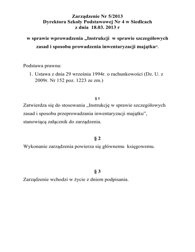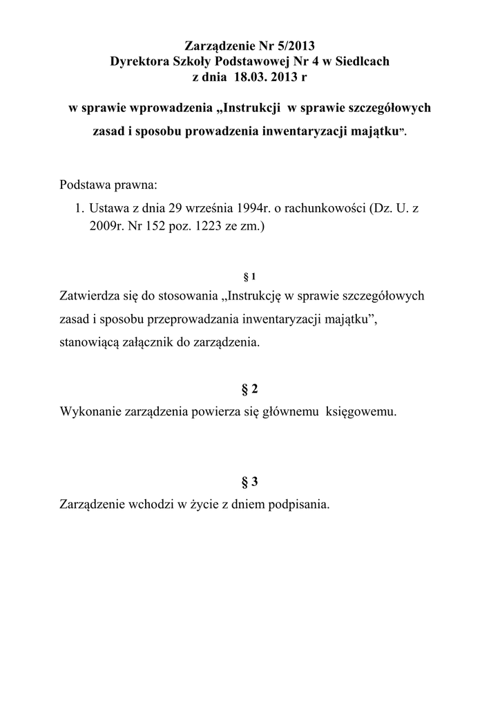 Zarządzenie Nr 5/2013 Dyrektora Szkoły Podstawowej Nr 4 w Siedlcach z dnia 18.03. 2013 r w sprawie wprowadzenia „Instrukcji w sprawie szczegółowych zasad i sposobu prowadzenia inwentaryzacji majątku”. Podstawa prawna: 1. Ustawa z dnia 29 września 1994r. o rachunkowości (Dz. U. z 2009r. Nr 152 poz. 1223 ze zm.) §1 Zatwierdza się do stosowania „Instrukcję w sprawie szczegółowych zasad i sposobu przeprowadzania inwentaryzacji majątku”, stanowiącą załącznik do zarządzenia. §2 Wykonanie zarządzenia powierza się głównemu księgowemu. §3 Zarządzenie wchodzi w życie z dniem podpisania. Załącznik nr 1 do Zarządzenia 5/2013 Dyrektora SP 4w Siedlcach INSTRUKCJA W SPRAWIE SZCZEGÓŁOWYCH ZASAD I SPOSOBU PRZEPROWADZANIA INWENTARYZACJI MAJĄTKU W SZKOLE PODSTAWOWEJ NR 4 I. w Siedlcach Cel, zasady i formy inwentaryzacji. Celem inwentaryzacji, będącej jedną z form kontroli wewnętrznej, jest ustalenie na określoną datę rzeczywistego stanu składników majątku, pozostającego w dyspozycji Szkoły Podstawowej nr 4 w Siedlcach. Wyniki inwentaryzacji powinny: 1) umożliwić doprowadzenie danych wynikających z ksiąg rachunkowych do zgodności ze stanem rzeczywistym, 2) zapewnić na podstawie uzyskanych danych realność informacji ekonomicznych, 3) umożliwić rozliczenie osób materialnie odpowiedzialnych z powierzonego im mienia, 4) zapewnić możliwość dokonania oceny gospodarczej przydatności składników majątku, 5) stworzyć warunki do usprawnienia gospodarki majątkiem poprzez przeciwdziałanie ujawnionym przejawom niegospodarności i marnotrawstwa. Podczas przeprowadzania inwentaryzacji majątku należy przestrzegać zasady kompletności i zasady rzeczywistości. Zasada kompletności polega na tym, że wszystkie składniki majątku powinny być ujęte w dokumentach spisu z natury w sposób szczegółowy pod względem ilościowym. Zasada rzeczywistości polega natomiast na ustaleniu faktycznej ilości i użyteczności składników majątku w dniu spisu. Niezachowanie podczas przeprowadzania spisu w sposób pełny i rzetelny tych zasad może spowodować, że wynik spisu nie będzie odzwierciedlał rzeczywistego stanu majątku. Rzeczywisty stan składników majątku ustala się na podstawie inwentaryzacji, która może występować w formie: − spisu z natury, − pisemnego uzgodnienia sald z kontrahentami (należności) − weryfikacji stanów ewidencyjnych. Inwentaryzacja w formie spisu z natury polega na ustaleniu i ujęciu w arkuszach spisu rzeczywistego stanu środków pieniężnych w kasie oraz rzeczowych składników majątku. Inwentaryzacja w formie uzgodnienia sald środków pieniężnych na rachunkach bankowych, kredytów bankowych następuje na podstawie wyciągów z rachunków bankowych lub pisemnego potwierdzenia salda przez banki. Należności uzgadnia się przez wysłanie pisemnej informacji o wysokości sald. Obowiązujące przepisy nie dopuszczają tzw. milczącego potwierdzenia. Obowiązek uzgadniania sald należności nie dotyczy sald zerowych. Inwentaryzację składników majątku, których stan rzeczywisty nie ustala się w formie „spisu z natury” lub w formie „uzgodnienia sald”, przeprowadza się w formie weryfikacji ich stanu ewidencyjnego, polegającego na porównaniu go z odpowiednimi dowodami oraz na rozliczeniu ewentualnych różnic. II. Przedmiot i terminy przeprowadzania inwentaryzacji. Przedmiotem inwentaryzacji są: 1) środki trwałe, 2) pozostałe środki trwałe, 3) materiały i towary, 4) środki pieniężne, 5) inne składniki majątku. Ogólne terminy i częstotliwość przeprowadzania inwentaryzacji składników majątku przedstawia poniższa tabela. Przedmiot inwentaryzacji Częstotliwość inwentaryzacji Środki trwałe , Raz na 4 lata spis z wyposażenie(ewidencja natury, wartościowa) Zbiory biblioteczne i inne wchodzące w skład biblioteki Materiały i towary Osoby odpowiedzialne za przeprowadzenie Zespoły spisowe powołane Zarządzeniem Dyrektora Termin inwentaryzacji Nie wcześniej niż na trzy miesiące przed zakończeniem roku i nie później niż do 15 stycznia roku następnego. Precyzyjny termin spisu z natury określony każdorazowo stosownym Zarządzeniem Dyrektora . corocznie uzgodnienie sald. W formie Uzgodnienie sald na pisemnej podanie dzień 31grudnia. sald przez osoby prowadzące ewidencję Raz na 4 lata spis z natury, Zespoły spisowe powołane Zarządzeniem Dyrektora corocznie uzgodnienie sald W formie pisemnej podanie Uzgodnienie sald na sald przez osoby dzień 31grudnia. prowadzące ewidencję Spis z natury Stała komisja Nie wcześniej niż na trzy miesiące przed zakończeniem roku i nie później niż do 15 stycznia roku następnego. Precyzyjny termin spisu z natury określony każdorazowo stosownym Zarządzeniem Dyrektora . Na dzień kończący (magazyn chemiczny i żywnościowy Druki ścisłego zarachowania corocznie, inwentaryzacyjna okres sprawozdawczy. W terminach nie zapowiedzianych wyrywkowe sprawdzenie stanów Spis z natury corocznie, Do decyzji Dyrektora Według decyzji Dyrektora (Plan kontroli),lub w dowolnym czasie Stała komisja Na dzień kończący inwentaryzacyjna okres sprawozdawczy Wartości niematerialne Corocznie weryfikacja i prawne sald Znaczki pocztowe W formie Na dzień kończący pisemnej podanie okres sprawozdawczy sald przez osoby prowadzące ewidencję, weryfikacja realnej wartości tych składników Spis z natury corocznie Stała komisja Na dowolny dzień . inwentaryzacyjna Składniki majątku wymagające szczególnej ochrony mienia (gotówka) Dwa razy w roku Spis z natury Główny księgowy Według decyzji dyrektora (plan kontroli), lub w dowolnym czasie. Na dzień 31 grudnia. Odzież ochronna Coroczna weryfikacja kart ewidencyjnych odzieży ochronnej ze stanem wykazanym przez Kierownika Gospodarczego Raz na 2 lata spis z natury, Stała komisja Na dzień kończący inwentaryzacyjna okres sprawozdawczy corocznie uzgodnienie sald W formie pisemnej podanie