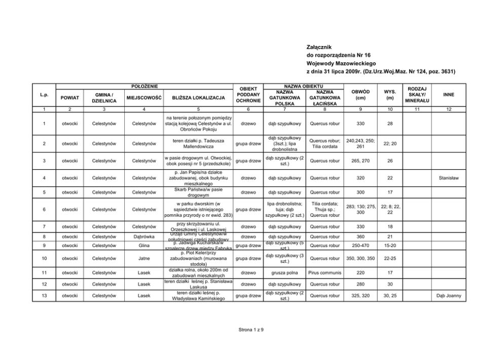Załącznik do rozporządzenia Nr 16 Wojewody Mazowieckiego z dnia 31 lipca 2009r. (Dz.Urz.Woj.Maz. Nr 124, poz. 3631) POŁOśENIE L.p. OBIEKT PODDANY OCHRONIE NAZWA OBIEKTU NAZWA NAZWA GATUNKOWA GATUNKOWA POLSKA ŁACIŃSKA 7 8 OBWÓD (cm) WYS. (m) RODZAJ SKAŁY/ MINERAŁU INNE 9 10 11 12 Quercus robur 330 28 dąb szypułkowy (3szt.); lipa drobnolistna Quercus robur; Tilia cordata 240,243, 250; 261 22; 20 dąb szypułkowy (2 szt.) Quercus robur 265, 270 26 drzewo dąb szypułkowy Quercus robur 320 22 drzewo dąb szypułkowy Quercus robur 300 17 Tilia cordata; Thuja sp.; Quercus robur 283; 130; 275, 300 22; 8; 22, 22 dąb szypułkowy Quercus robur 330 18 dąb szypułkowy dąb szypułkowy (5 szt.) Quercus robur 360 21 Quercus robur 250-470 15-20 dąb szypułkowy (3 szt.) Quercus robur 350, 300, 350 22-25 grusza polna Pirus communis 220 17 dąb szypulkowy Quercus robur 280 30 dąb szypułkowy (2 szt.) Quercus robur 325, 320 30, 25 POWIAT GMINA / DZIELNICA MIEJSCOWOŚĆ BLIśSZA LOKALIZACJA 1 2 3 4 5 6 1 otwocki Celestynów Celestynów na terenie połozonym pomiędzy stacją kolejową Celestynów a ul. Obrońców Pokoju drzewo dąb szypułkowy 2 otwocki Celestynów Celestynów teren działki p. Tadeusza Mallendowicza grupa drzew 3 otwocki Celestynów Celestynów 4 otwocki Celestynów Celestynów 5 otwocki Celestynów Celestynów 6 otwocki Celestynów Celestynów 7 otwocki Celestynów Celestynów 8 otwocki Celestynów Dąbrówka 9 otwocki Celestynów Glina 10 otwocki Celestynów Jatne 11 otwocki Celestynów Lasek 12 otwocki Celestynów Lasek 13 otwocki Celestynów Lasek w pasie drogowym ul. Otwockiej, grupa drzew obok posesji nr 5 (przedszkole) p. Jan Papis/na działce zabudowanej, obok budynku mieszkalnego Skarb Państwa/w pasie drogowym w parku dworskim (w lipa drobnolistna; sąsiedztwie istniejącego grupa drzew tuja; dąb pomnika przyrody o nr ewid. 283) szypułkowy (2 szt.) przy skrzyŜowaniu ul. drzewo Orzeszkowej i ul. Laskowej Urząd Gminy Celestynów/w drzewo południowej części zabudowy p. Jadwiga Kucharska/w grupa drzew szpalerze drzew między Fabryką p. Piot Keler/przy zabudowaniach (murowana grupa drzew stodoła) działka rolna, około 200m od drzewo zabudowań mieszkalnych teren działki leśnej p. Stanisława drzewo Laskusa teren działki leśnej p. grupa drzew Władysława Kamińskiego Strona 1 z 9 Stanisław Dąb Joanny 1 2 3 4 14 otwocki Celestynów Okoły 15 otwocki Celestynów Podbiel 16 otwocki Celestynów Pogorzel 17 otwocki Celestynów Pogorzel 18 otwocki Celestynów Pogorzel Warszawska 19 otwocki Celestynów Regut 20 otwocki Celestynów Regut 55 21 otwocki Celestynów Strzępki 22 otwocki Celestynów Strzępki 23 otwocki Celestynów Tabor 24 otwocki Józefów Dębinka 25 otwocki Józefów Dębinka nad Wisłą 26 otwocki Józefów 27 otwocki Józefów 5 6 przy drodze łączącej miejscowości Okoły i Pogorzel grupa drzew Warszawską po jej zachodniej stronie p. Henryk Suchnik/na terenie leśnym (wzniesienie wydmowe nad strumieniem), w odległości drzewo ok. 2,0 km od miejscowości Regut teren działki p. Stanisława Wicika, północna część wsi w drzewo pobliŜu strumienia przy boisku piłkarskim Skarb Państwa/100 m od miejscowości Pogorzel na skraju drzewo łąki 7 8 9 10 dąb szypułkowy (2szt.) Quercus robur 407, 265 25, 22 lipa drobnolistna Tilia cordata 630 18 sosna pospolita Pinus silvestris 272 14 dąb szypułkowy Quercus robur 310 22 Nadleśnictwo Celestynów/w grupa drzew sąsiedztwie Pogorzelskiej Strugi dąb szypułkowy (4 szt.) Quercus robur drzewo p. Józef Bąk/na pastwisku p. Stanisław Wojdowicz/obok drzewo zabudowań gospodarczych teren Zakładu Doświadczalnego grupa drzew "Unipress" dąb szypułkowy Quercus robur 350 22 lipa drobnolistna Tilia cordata 345 18 dąb szypułowy (2szt.) Quercus robur 405, 266 dąb szypułkowy (2szt.) Quercus robur 305, 275 25 drzewo dąb szypułkowy Quercus robur 550 18 drzewo dąb szypułkowy Quercus robur 436 30 około 30m na południe od domu mieszkalnego u podnóŜa skarpy drzewo dąb szypułkowy Quercus robur 402 20 Józefów teren działki p. Heleny Jaworskiej drzewo dąb szypułkowy Quercus robur 305 12 Józefów Parafia Rzymsko-Katolicka w Józefowie/na cmentarzu Kościoła Parafialego w Józefowie pod wezwaniem Matki Boskiej Częstochowskiej drzewo sosna pospolita Pinus silvestris 310 19 przy drodze łączącej miejscowości Lasek i Skarbonka, grupa drzew przy ogrodzeniu Zakładu Doświadczalnego "Unipress" p.Adam Młot/na zachód od szosy Tabor-Podbiel zachodnia strona szosy Warszawa-Karczew Strona 2 z 9 11 12 Wiekowa Lipa 310+315, 310, 17+20, 19, 275, 275 18, 16 Adam Dąb Admirała Józefa Unruga 1 2 3 4 28 otwocki Józefów Józefów 29 otwocki Józefów Józefów 30 otwocki Józefów Józefów 31 otwocki Józefów Józefów 32 otwocki Józefów Nowa Wieś 33 otwocki Karczew Całowanie 34 otwocki Karczew Glinki 35 otwocki Karczew Glinki 5 p. Tadeusz Bergiel/w ogrodzie nieruchomości Skarb Państwa/linia rozgraniczajaca ul. Westerplatte po jej południowej stronie, obok skrzyŜowania z ul. Teatralną 6 7 8 9 10 drzewo dąb szypułkowy Quercus robur 305 20 drzewo jarząb pospolity Sorbus aucuparia 100 12 dąb szypułkowy (3 szt.) Quercus robur 395, 265, 415 20-22 dąb szypułkowy (3 szt.) Quercus robur 260, 295, 405 20 dąb szypułkowy Quercus robur 350 16 lipa drobnolistna Tilia cordata 400 20 topola biała Populus alba 680 35 p. Wacław Koc/spadkobierca po Adamie Kocu/USA/adm. Urząd grupa drzew Miasta Józefów p. Maria Teresa Matusińska/na grupa drzew skarpie rośnie na granicy dwóch działek p. Anieli Marianowicz i p. Andrzeja Tybulskiego, około drzewo 200m na zachód od Wału Miedzeszyńskiego w dawnym parku wiejskim drzewo p. Henryk RaniŜ, p. Kazimierz Nojek/w pobliŜu mostu kolejowego, obok nasypu drzewo kolejowego (ok. 50 m), na działce rolnej (miedza) 36 otwocki Karczew Karczew 37 otwocki Karczew Karczew Nadleśnictwo Celestynów/adm. Leśnictwo Torfy/ok. 50 m od szlaku turystycznego czar