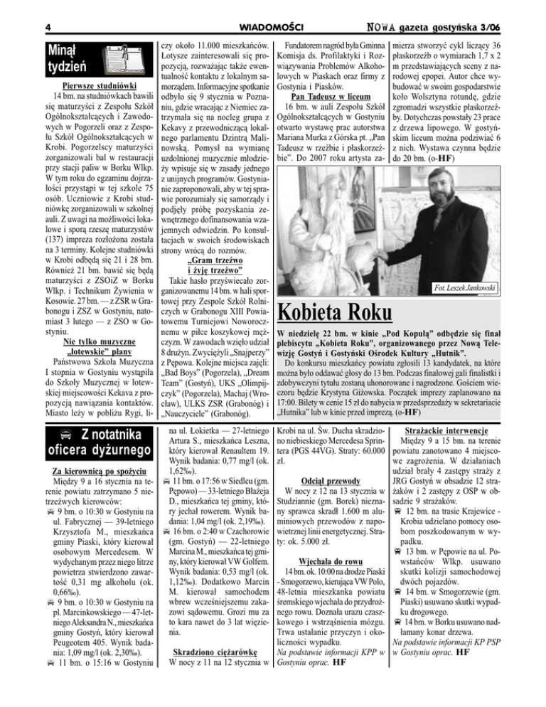 4 Min¹³ tydzieñ WIADOMOCI 4 4 Pierwsze studniówki 14 bm. na studniówkach bawili siê maturzyci z Zespo³u Szkó³ Ogólnokszta³c¹cych i Zawodowych w Pogorzeli oraz z Zespo³u Szkó³ Ogólnokszta³c¹cych w Krobi. Pogorzelscy maturzyci zorganizowali bal w restauracji przy stacji paliw w Borku Wlkp. W tym roku do egzaminu dojrza³oci przyst¹pi w tej szkole 75 osób. Uczniowie z Krobi studniówkê zorganizowali w szkolnej auli. Z uwagi na mo¿liwoci lokalowe i spor¹ rzeszê maturzystów (137) impreza roz³o¿ona zosta³a na 3 terminy. Kolejne studniówki w Krobi odbêd¹ siê 21 i 28 bm. Równie¿ 21 bm. bawiæ siê bêd¹ maturzyci z ZSOiZ w Borku Wlkp. i Technikum ¯ywienia w Kosowie. 27 bm. z ZSR w Grabonogu i ZSZ w Gostyniu, natomiast 3 lutego z ZSO w Gostyniu. Nie tylko muzyczne ³otewskie plany Pañstwowa Szko³a Muzyczna I stopnia w Gostyniu wyst¹pi³a do Szko³y Muzycznej w ³otewskiej miejscowoci Kekava z propozycj¹ nawi¹zania kontaktów. Miasto le¿y w pobli¿u Rygi, li- p Z notatnika oficera dy¿urnego Za kierownic¹ po spo¿yciu Miêdzy 9 a 16 stycznia na terenie powiatu zatrzymano 5 nietrzewych kierowców: p 9 bm. o 10:30 w Gostyniu na ul. Fabrycznej 39-letniego Krzysztofa M., mieszkañca gminy Piaski, który kierowa³ osobowym Mercedesem. W wydychanym przez niego litrze powietrza stwierdzono zawartoæ 0,31 mg alkoholu (ok. 0,66). p 9 bm. o 10:30 w Gostyniu na pl. Marcinkowskiego 47-letniego Aleksandra N., mieszkañca gminy Gostyñ, który kierowa³ Peugeotem 405. Wynik badania: 1,09 mg/l (ok. 2,30). p 11 bm. o 15:16 w Gostyniu czy oko³o 11.000 mieszkañców. £otysze zainteresowali siê propozycj¹, rozwa¿aj¹c tak¿e ewentualnoæ kontaktu z lokalnym samorz¹dem. Informacyjne spotkanie odby³o siê 9 stycznia w Poznaniu, gdzie wracaj¹c z Niemiec zatrzyma³a siê na nocleg grupa z Kekavy z przewodnicz¹c¹ lokalnego parlamentu Dzintr¹ Malinowsk¹. Pomys³ na wymianê uzdolnionej muzycznie m³odzie¿y wpisuje siê w zasady jednego z unijnych programów. Gostynianie zaproponowali, aby w tej sprawie porozumia³y siê samorz¹dy i podjê³y próbê pozyskania zewnêtrznego dofinansowania wzajemnych odwiedzin. Po konsultacjach w swoich rodowiskach strony wróc¹ do rozmów. Gram trzewo i ¿yjê trzewo Takie has³o przywieca³o zorganizowanemu 14 bm. w hali sportowej przy Zespole Szkó³ Rolniczych w Grabonogu XIII Powiatowemu Turniejowi Noworocznemu w pi³ce koszykowej mê¿czyzn. W zawodach wziê³o udzia³ 8 dru¿yn. Zwyciê¿yli Snajperzy z Pêpowa. Kolejne miejsca zajêli: Bad Boys (Pogorzela), Dream Team (Gostyñ), UKS Olimpijczyk (Pogorzela), Machaj (Wroc³aw), ULKS ZSR (Grabonóg) i Nauczyciele (Grabonóg). na ul. £okietka 27-letniego Artura S., mieszkañca Leszna, który kierowa³ Renaultem 19. Wynik badania: 0,77 mg/l (ok. 1,62). p 11 bm. o 17:56 w Siedlcu (gm. Pêpowo) 33-letniego B³a¿eja D., mieszkañca tej gminy, który jecha³ rowerem. Wynik badania: 1,04 mg/l (ok. 2,19). p 16 bm. o 2:40 w Czachorowie (gm. Gostyñ) 22-letniego Marcina M., mieszkañca tej gminy, który kierowa³ VW Golfem. Wynik badania: 0,53 mg/l (ok. 1,12). Dodatkowo Marcin M. kierowa³ samochodem wbrew wczeniejszemu zakazowi s¹dowemu. Grozi mu za to kara nawet do 3 lat wiêzienia. NOWA gazeta gostyñska 3/06 Fundatorem nagród by³a Gminna Komisja ds. Profilaktyki i Rozwi¹zywania Problemów Alkoholowych w Piaskach oraz firmy z Gostynia i Piasków. Pan Tadeusz w liceum 16 bm. w auli Zespo³u Szkó³ Ogólnokszta³c¹cych w Gostyniu otwarto wystawê prac autorstwa Mariana Murka z Górska pt. Pan Tadeusz w rzebie i p³askorzebie. Do 2007 roku artysta za- mierza stworzyæ cykl licz¹cy 36 p³askorzeb o wymiarach 1,7 x 2 m przedstawiaj¹cych sceny z narodowej epopei. Autor chce wybudowaæ w swoim gospodarstwie ko³o Wolsztyna rotundê, gdzie zgromadzi wszystkie p³askorzeby. Dotychczas powsta³y 23 prace z drzewa lipowego. W gostyñskim liceum mo¿na podziwiaæ 6 z nich. Wystawa czynna bêdzie do 20 bm. (o-HF) Fot. Leszek Jankowski Kobieta Roku W niedzielê 22 bm. w kinie Pod Kopu³¹ odbêdzie siê fina³ plebiscytu Kobieta Roku, organizowanego przez Now¹ Telewizjê Gostyñ i Gostyñski Orodek Kultury Hutnik. Do konkursu mieszkañcy powiatu zg³osili 13 kandydatek, na które mo¿na by³o oddawaæ g³osy do 13 bm. Podczas fina³owej gali finalistki i zdobywczyni tytu³u zostan¹ uhonorowane i nagrodzone. Gociem wieczoru bêdzie Krystyna Gi¿owska. Pocz¹tek imprezy zaplanowano na 17:00. Bilety w cenie 15 z³ do nabycia w przedsprzeda¿y w sekretariacie Hutnika lub w kinie przed imprez¹. (o-HF) Krobi na ul. w. Ducha skradzioStra¿ackie interwencje no niebieskiego Mercedesa SprinMiêdzy 9 a 15 bm. na terenie tera (PGS 44VG). Straty: 60.000 powiatu zanotowano 4 miejscoz³. we zagro¿enia. W dzia³aniach udzia³ bra³y 4 zastêpy stra¿y z Odci¹³ przewody JRG Gostyñ w obsadzie 12 straW nocy z 12 na 13 stycznia w ¿aków i 2 zastêpy z OSP w obStudziannie (gm. Borek) niezna- sadzie 9 stra¿aków. ny sprawca skrad³ 1.600 m alu- f 12 bm. na trasie Krajewice Krobia udzielano pomocy osominiowych przewodów z napobom poszkodowanym w wywietrznej linii energetycznej. Strapadku. ty: ok. 5.000 z³. f 13 bm. w Pêpowie na ul. PoWjecha³a do rowu wstañców Wlkp. usuwano 14 bm. ok. 10:00 na drodze Piaski skutki kolizji samochodowej - Smogorzewo, kieruj¹ca VW Polo, dwóch pojazdów. 48-letnia mieszkanka powiatu f 14 bm. w Smogorzewie (gm. Piaski) usuwano skutki wypadremskiego wjecha³a do przydro¿ku drogowego. nego rowu. Dozna³a urazu czaszkowego i wstrz¹nienia mózgu. f 14 bm. w Borku usuwano nad³amany konar drzewa. Trwa ustalanie przyczyn i okoNa podstawie informacji KP PSP licznoci wypadku. Skradziono ciê¿arówkê Na podstawie informacji KPP w w Gostyniu oprac. HF W nocy z 11 na 12 stycznia w Gostyniu oprac. HF