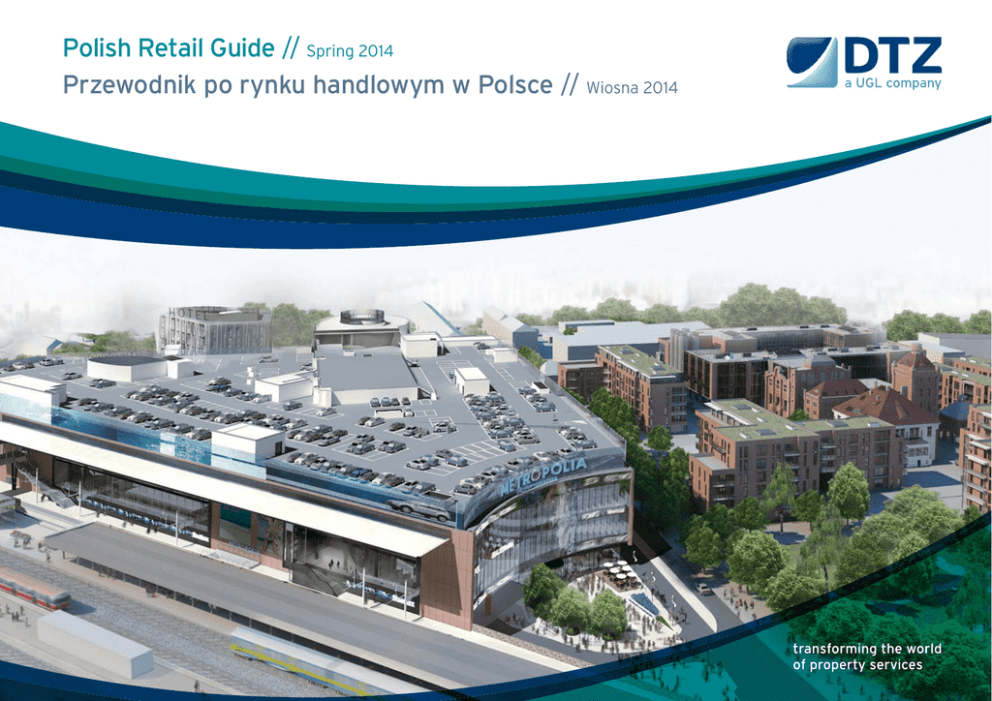 Polish Retail Guide // Spring 2014 Przewodnik po rynku handlowym w Polsce // Wiosna 2014 // Introduction / Wstęp With a variety of retail formats and an everwidening range of retailers operating across the country, the retail market in Poland has transformed significantly over the past twenty years. Both landlords and retailers have been constantly upgrading their offer to meet growing expectations and customers’ needs and sophistication. We at DTZ are closely monitoring these changes at a local level and within the context of global retail trends. Bearing in mind the still growing potential in the retail sector, and benefiting from extensive expertise in this field, DTZ has been involved in all aspects of the retail property business, including concept development support, tenant-mix advice and feasibility studies at the initial development phase and project management, letting, valuation, property management services during and after the implementation phase as well as investment advisory. As for existing assets, we have demonstrated a solid knowledge and track record in retail asset management, working closely with clients on their repositioning strategies and delivering refurbishment and redevelopment advisory services. DTZ has attracted top retail professionals who are best placed to achieve the highest quality service for our clients. Knowing exactly the local conditions, combined with global know-how DTZ is able anticipate future trends and developments, allowing us to develop solutions that deliver competitive advantages. We believe that our capacity to bring our retail clients and partners a set of complex services and solutions, shared under one roof, makes a positive difference. We have developed the present guide with the same philosophy, to make the difference and support you in taking the optimum, wellthought business decisions. We hope you enjoy reading our Polish Retail Guide. W związku z różnorodnością rynku powierzchni handlowych oraz wciąż rosnącym zasięgiem sieci handlowych działających na terenie naszego kraju, rynek ten podlega nieustannym zmianom. Zarówno właściciele powierzchni handlowych, jak i najemcy stale poszukują nowych rozwiązań, aby uatrakcyjnić swoją ofertę i spełnić rosnące oczekiwania klientów. Nad rozwiązaniami opracowywanymi na potrzeby klientów DTZ, pracują najlepsi specjaliści na rynku, którzy doskonale znając lokalne uwarunkowania wykorzystują globalne know-how, aby przewidzieć przyszłe trendy i kierunki rozwoju rynku. Pozwala to na opracowywania rozwiązań skutecznie budujących przewagi konkurencyjne danego obiektu. Jako DTZ uważnie analizujemy zmiany zachodzące na krajowym rynku w kontekście globalnych trendów obserwowanych w sektorze handlowym. Posiadamy dużą wiedzę i doświadczenie w każdym aspekcie związanym z nieruchomościami handlowymi, dzięki czemu DTZ jest partnerem naszych Klientów w każdej fazie inwestycji Niniejszy przewodnik stworzyliśmy w tym samym celu – by dostarczyć Państwu użyteczne narzędzie umożliwiające podjęcie słusznej decyzji, która przełoży się na rynkowy sukces. Życzymy udanej lektury przewodnika po rynku polskich centrów handlowych. od doradztwa przy opracowywaniu optymalnej koncepcji, poprzez doradztwo w zakresie doboru najemców, sporządzanie studiów wykonalności, usługi związane z komercjalizacją powierzchni handlowych, wyceną, zarządzaniem centrami handlowymi oraz sprzedażą nieruchomości. DTZ posiada także rozległe doświadczenie i wiedzę z zakresu asset management. Doradzamy właścicielom obiektów handlowych, jak zwiększyć ich wartość poprzez repozycjonowanie centrów handlowych, czy też doradztwo z zakresu rozbudowy i przebudowy tych obiektów. Renata Kusznierska Head of Retail Agency CEE 2 | Polish Retail Guide // Introduction / Wstęp Dear Reader, We are pleased to present the new addition of the publication that is gaining on popularity each year. This guide is a perfect tool for all market players, which allows them to get the wide picture of the retail market in Poland. The guide includes: • statistics on the major cities including earnings and purchasing power figures • information on shopping centre provision, including number of existing and planned schemes as well as total modern retail stock operating in the city The retail market in Poland is gaining on maturity, not only in terms of the dynamic supply growth but also the diversifying retail offer. The retail expansion continues in medium and small cities while the competition is strengthening in larger agglomeration. We can also expect the natural market evolution in top 5 cities towards the development of high street retailing. The presented publication focuses on the specific but also significant segment of the market, which is the traditional shopping centres format in the largest cities. Drogi Czytelniku, Mamy przyjemność zaprezentować najnowszą edycję publikacji, która z każdym rokiem zyskuje na popularności. Niniejszy przewodnik jest doskonałym narzędziem dla wszystkich uczestników rynku nieruchomości i przedstawia szerokie spektrum rynku nowoczesnych powierzchni handlowych w Polsce. Przewodnik zawiera między innymi: • statystyki dotyczące wynagrodzenia i siły nabywczej w największych miastach, • information on vacancy rates and prime rents • dane dotyczące rynku centrów handlowych tj. liczbę zarówno istniejących, jak i planowanych obiektów, jak również statystki całkowitej nowoczesnej powierzchni handlowej, • a list of the five largest schemes in operation in each city • informację o stopach pustostanów w mieście i czynszach za najlepsze lokale, • a map locating all shopping centres, retail parks and factory outlets • listę pięciu największych centrów handlowych w każdym z analizowanych miast, We encourage you to familiarize with the wide variety of DTZ publications. staje się coraz bardziej dojrzały nie tyl