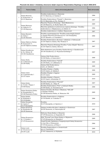 Placówki dla dzieci i młodzieży utworzone dzięki wsparciu Województwa Śląskiego w latach 2006-2010 Lp. 1 2 3 4 5 6 7 8 9 Nazwa Gminy Gmina Bestwina ul. Krakowska 111 43-512 Bestwina Gmina Bojszowy ul. Gaikowa 35 43-220 Bojszowy Gmina Boronów ul. Dolna 2 42-283 Boronów Gmina Dąbrowa Zielona Pl. Kościuszki 31 42-265 Dąbrowa Zielona Gmina Gierałtowice ul. Ks. Roboty 48 44-186 Gierałtowice Gmina Herby ul. Lubliniecka 33 42-284 Herby Gmina Janów ul. Częstochowska 1 42-253 Janów Gmina Kalety ul. Żwirki i Wigury 2 42-660 Kalety Gmina Kamienica Polska ul. Konopnickiej 12 42-260 Kamienica Polska Gmina Kobiór 10 ul. Kobiórska 5 43-210 Kobiór Gmina Konopiska 11 ul. Lipowa 5 42-274 Konopiska Gmina Kornowac 12 ul. Raciborska 48 44-285 Kornowac Gmina Krzanowice 13 ul. 15 Grudnia 5 47-470 Krzanowice Gmina Lyski 14 ul. Dworcowa 1a 44-295 Lyski Adres utworzonej placówki Świetlica środowiskowa w Bestwinie 43-512 Bestwina, ul. Szkolna 8 Świetlica Środowiskowa "Promyk" w Bestwince 43-512 Bestwinka, ul. Św. Floriana 15 Placówka Wsparcia Dziennego - Klub Młodzieżowy 43-220 Bojszowy, ul. Ruchu Oporu 102 Rok utworzenia 2006 2007 2009 Placówka opiekuńczo-wychowawcza wsparcia dziennego - Świetlica środowiskowa w Międzyrzeczu, ul. Żubrów 23 2006 Świetlica środowiskowa w Jedlinie i Bojszowach 2007 Świetlica socjoterapeutyczna "Świetlica moim drugim domem" w Zespole Placówek Oświatowych im. Unii Europejskiej 42-283 Boronów, ul. Poznańska 2 2006 Świetlica Środowiskowa dla dzieci i młodzieży w Soborzycach 42-265 Dąbrowa Zielona, Plac Wolności 4 2007 Placówka Wsparcia Dziennego Świetlica "Leśny Zakątek" Borowce 42-265 Dąbrowa Zielona, Borowce 2007 Klub młodzieżowy przy Świetlicy Środowiskowej w Gierałtowicach 44-186 Gierałtowice, ul. Wojciecha Korfantego 7 2007 Gminny Klub Środowiskowy 42-284 Herby, ul. Katowicka 6 2008 Świetlica Środowiskowa "GaCeK" 42-284 Herby, ul. Lubliniecka 31 2009 Gminny Klub Środowiskowy Lisów, ul. Szkolna 2 2009 Świetlica Wiejska w Siedlcu 42-253 Janów, ul. Szkolna 8 Świetlica Wiejska w Zagórzu 42-253 Janów Świetlica Wiejska w Żurawiu 42-253 Janów, ul Kościelna 19 Świetlica Środowiskowa "Przystań" 42-660 Kalety, ul. 1 Maja 78 Świetlica Środowiskowa "Port" w Kaletach-Miotku 42-660 Kalety, ul. Orzeszkowej 10 Gminna Świetlica dla Dzieci i Młodzieży "SOLAR" w Rudniku Wielkim 42-260 Kamienica Polska, ul. Słoneczna 186 2008 2009 2010 2007 2008 2009 Świetlica Środowiskowa w Kobiórze 43-210 Kobiór, ul. Centralna 57 2006 Świetlica 42-274 Konopiska, ul. Sportowa 1 2010 Gminna świetlica dla dzieci i młodzieży w Kornowacu 44-285 Kornowac, ul. Starowiejska 66 2007 Klub przy Domu Kultury w Borucinie 47-470 Krzanowice, ul. Kopernika 20 2008 Klub "Przystań" przy Domu Kultury w Bojanowie 47-470 Krzanowice, ul. Borucka 6 Zespół Świetlic Opiekuńczo-Terapeutycznych Gminy Krzanowice (w tym Filia w Pietraszynie) 47-470 Krzanowice, ul Polna 2 2009 2006 Świetlica Środowiskowa w Zwonowicach przy ul. Sumińskiej 1 2009 47-435 Adamowice, ul. Rybnicka 2010 Strona 1 z 3 Placówki dla dzieci i młodzieży utworzone dzięki wsparciu Województwa Śląskiego w latach 2006-2010 Lp. 15 16 17 18 19 20 21 Nazwa Gminy Gmina Łękawica ul. Wspólna 24 34-321 Łękawica Gmina Mstów ul. 16 stycznia 14 42-244 Mstów Gmina Mszana ul. 1 Maja 81 44-325 Mszana Gmina Niegowa ul. Sobieskiego 1 42-320 Niegowa Gmina Ogrodzieniec Plac Wolności 25 42-440 Ogrodzieniec Gmina Pawonków ul. Zawadzkiego 7 42-772 Pawonków Gmina Pietrowice Wielkie ul. Szkolna 5 47-480 Pietrowice Wielkie Gmina Poraj 22 ul. Jasna 21 42-360 Poraj Gmina Rudnik 23 ul. Kozielska 1 47-411 Rudnik Gmina Sławków 24 ul. Rynek1 41-260 Sławków Gmina Starcza 25 ul. Gminna 4 42-261 Starcza Gmina Ślemień 26 ul. Krakowska 148 32-323 Ślemień Gmina Wojkowice 27 ul. Jana III Sobieskiego 290a 42-580 Wojkowice Gmina Wyry 28 ul. Dąbrowszczaków 133 43-175 Wyry Adres utworzonej placówki Rok utworzenia Świetlica Środowiskowa "Barka" 34-321 Łękawica, ul. Żywiecka 23 2006 Świetlica Środowiskowa przy GOK w Mstowie 42-244 Mstów, Plac Mickiewicza 17 2009 Świetlica Środowiskowa w Połomii 44-323 Mszana, ul. Szkolna 12 2006 Świetlica środowiskowa 42-320 Niegowa, ul. Wojska Polskiego 2 2010 Świetlica Środowiskowa przy Szkole Podstawowej nr 1 w Ogrodzieńcu 2007 Świetlica dla dzieci i młodzieży w Pawonkowie 42-772 Pawonków, ul. Zawadzkiego 7 2006 Świetlica Środowiskowa w Cyprzanowie 47-480 Pietrowice Wielkie, ul. Janowska 33 2007 Świetlica Środowiskowa w Masłońskim 42-360 Poraj, ul. Sportowa 11 2008 Świetlica Środowiskowa w Choroniu 42-360 Poraj, ul. Wolności 22 2007 Świetlica Środowiskowa w Jastrzębiu 42-360 Poraj, Jastrząb ul. Mickiewicza 1a Świetlica Środowiskowa w Żarkach Letnisku 42-311 Poraj, ul. Szkolna 20 2007 2008 Klub Liderów Inicjatyw Obywatelskich 47-411 Rudnik, ul. Mickiewicza 2 2007 Świetlica środowiskowa 41-260 Sławków, ul. Kościelna 26 2010 42-261 Starcza, ul. Szkolna 1 2010 Gminna Świetlica dla dzieci i młodzieży w Lasie 34-323 Ślemień, ul. Zakopiańska 109 2007 Gminna Świetlica dla dzieci i młodzieży w Koconiu 34-323 Ślemień, ul. Żywiecka 38 2007 Świetlica dla dzieci i młodzieży 42-580 Wojkowice, ul. Jaworznik 6 2007 43-176 Gostyń, ul. Pszczyńska 368 2010 Gminna Świetlica Środowiskowa w Wyrach 43-175 Wyry, ul. Bojdoła 3a 2009 Strona 2 z 3 Placówki dla dzieci i młodzieży utworzone dzięki wsparciu Województwa Śląskiego w latach 2006-2010 Lp. Nazwa Gminy Adres utworzonej placówki 42-310 Żarki, ul. Szkolna 35 Gmina Żarki 29 ul. Kościuszki 15/17 42-310 Żarki Gmina Żarnowiec 30 ul. Krakowska 34 42-439 Żarnowiec Świetlica w Ostrowie 42-310 Żarki, ul. Szkolna 1 Świetlica w Zawadzie 42-310 Żarki, Zawada 56 Rok utworzenia 2010 2009 2006 Świetlica w Przybynowie 42-310 Żarki, ul. Słoneczna 2 2008 Świetlica na Wysokiej Lelowskiej 42-310 Żarki, ul. Częstochowska 93 2007 Klub dla dzieci i młodzieży przy