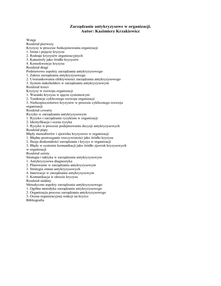 Zarządzanie antykryzysowe w organizacji. Autor: Kazimierz Krzakiewicz Wstęp Rozdział pierwszy Kryzysy w procesie funkcjonowania organizacji 1. Istota i pojęcie kryzysu 2. Rodzaje kryzysów organizacyjnych 3. Katastrofy jako źródło kryzysów 4. Konsekwencje kryzysu Rozdział drugi Podstawowe aspekty zarządzania antykryzysowego 1. Zakres zarządzania antykryzysowego 2. Uwarunkowania efektywności zarządzania antykryzysowego 3. System stakeholders w zarządzaniu antykryzysowym Rozdział trzeci Kryzysy w rozwoju organizacji 1. Warunki kryzysu w ujęciu systemowym 2. Tendencje cyklicznego rozwoju organizacji 3. Niebezpieczeństwo kryzysów w procesie cyklicznego rozwoju organizacji Rozdział czwarty Ryzyko w zarządzaniu antykryzysowym 1. Ryzyko i zarządzanie ryzykiem w organizacji 2. Identyfikacja i ocena ryzyka 3. Ryzyko w procesie podejmowania decyzji antykryzysowych Rozdział piąty Błędy menedżerów i zjawiska kryzysowe w organizacji 1. Błędne postrzeganie rzeczywistości jako źródło kryzysu 2. Iluzja doskonałości zarządzania i kryzys w organizacji 3. Błędy w systemie komunikacji jako źródło zjawisk kryzysowych w organizacji Rozdział szósty Strategia i taktyka w zarządzaniu antykryzysowym 1. Antykryzysowa diagnostyka 2. Planowanie w zarządzaniu antykryzysowym 3. Strategia zmian antykryzysowych 4. Innowacje w zarządzaniu antykryzysowym 5. Komunikacja w okresie kryzysu Rozdział siódmy Metodyczne aspekty zarządzania antykryzysowego 1. Ogólna metodyka zarządzania antykryzysowego 2. Organizacja procesu zarządzania antykryzysowego 3. Ocena organizacyjnej reakcji na kryzys Bibliografia
