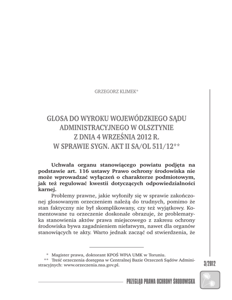 Grzegorz Klimek* Glosa do wyroku Wojewódzkiego Sądu Administracyjnego w Olsztynie z dnia 4 września 2012 r. w sprawie sygn. akt II SA/Ol 511/12** Uchwała organu stanowiącego powiatu podjęta na podstawie art. 116 ustawy Prawo ochrony środowiska nie może wprowadzać wyłączeń o charakterze podmiotowym, jak też regulować kwestii dotyczących odpowiedzialności karnej. Problemy prawne, jakie wyłoniły się w sprawie zakończonej glosowanym orzeczeniem należą do trudnych, pomimo że stan faktyczny nie był skomplikowany, czy też wyjątkowy. Komentowane tu orzeczenie doskonale obrazuje, że problematyka stanowienia aktów prawa miejscowego z zakresu ochrony środowiska bywa zagadnieniem niełatwym, nawet dla organów stanowiących te akty. Warto jednak zacząć od stwierdzenia, że * Magister prawa, doktorant KPOŚ WPiA UMK w Toruniu. ** Treść orzeczenia dostępna w Centralnej Bazie Orzeczeń Sądów Administracyjnych: www.orzeczenia.nsa.gov.pl. Przegląd prawa ochrony środowiska 3/2012 148 Grzegorz Klimek omawiany wyrok jest prawidłowy, a przytoczona przez sąd argumentacja zasługuje na aprobatę. Teza niniejszego wyroku, jakkolwiek niewyraźnie wyeksponowana, została w takim brzmieniu zamieszczona w treści uzasadnienia powyższego orzeczenia, które zapadło w związku z następującym stanem faktycznym. Rada Powiatu w (…) podjęła uchwałę w sprawie wprowadzenia zakazu używania jednostek pływających z silnikami spalinowymi na niektórych wodach powiatu. Jako podstawę prawną uchwały wskazano art. 116 ust. 1 ustawy z dnia 27 kwietnia 2001 r. Prawo ochrony środowiska1 oraz art. 41 ustawy z dnia 5 czerwca 1998 r. o samorządzie powiatowym2. W złożonej na powyższą uchwałę skardze Wojewoda wniósł o stwierdzenie nieważności jej §2. W uzasadnieniu skargi organ nadzoru wskazał, iż w §2 uchwały rada powiatu zawarła wyłączenia podmiotowe, na mocy których zakaz nie dotyczy jednostek organizacyjnych policji, pogotowia ratunkowego i wodnego, straży: pożarnych, rybackich, ochrony przyrody, rybackich użytkowników wód i jednostek przedsiębiorstwa Lasy Państwowe podczas wykonywania czynności służbowych. Argumentował, że rada powiatu na podstawie art. 116 ust. 1 ustawy p.o.ś. ma prawo ograniczyć lub zakazać używania jednostek pływających lub niektórych innych ich rodzajów na określonych zbiornikach powierzchniowych wód stojących oraz wodach płynących, jeżeli jest to konieczne do zapewnienia odpowiednich warunków akustycznych na terenach przeznaczonych na cele rekreacyjno-wypoczynkowe. Z kolei z art. 116 ust. 4 powyższej ustawy wynika, że ograniczenia nie mogą dotyczyć jednostek pływających, których użycie jest konieczne do celów bezpieczeństwa publicznego lub do utrzymania cieków i zbiorników wodnych. Zatem rada powiatu wprowadzając w §2 przedmiotowej uchwały wyłączenie spod zakazu używania jednostek pływających działała poza swoimi kompetencjami i bez podstawy prawnej. Uchwała rady, jako akt prawa miejscowego, może normować bowiem jedynie te sprawy, które zostały jej przeka- 3/2012 Tj. Dz. U. z 2008 r. Nr 25, poz.150 ze zm., dalej cyt.: ustawa p.o.ś. Tj. Dz. U. z 2001 r. Nr 142, poz. 1592 ze zm. 1 2 Przegląd prawa ochrony środowiska Glosa do wyroku Wojewódzkiego Sądu Administracyjnego... 149 zane do regulowania w przepisie upoważniającym. Akt prawa miejscowego nie może wykraczać poza zakres spraw określonych w upoważnieniu. Jednostki pływające, których użycie jest konieczne do celów bezpieczeństwa publicznego lub do utrzymania cieków i zbiorników wodnych mogą pływać na terenach przeznaczonych na cele rekreacyjno-wypoczynkowe, mimo konieczności zapewnienia na tych terenach odpowiednich warunków akustycznych. Wynika to wprost z art. 116 ust. 4 ustawy p.o.ś. Skoro ustawodawca unormował te kwestie, to rada działała w tym zakresie z przekroczeniem swoich uprawnień, nie miała bowiem podstaw prawnych do ustalenia podmiotowych wyłączeń od zakazów wprowadzonych na podstawie art. 116 ustawy p.o.ś. W odpowiedzi na skargę Przewodniczący Rady Powiatu wniósł o jej oddalenie. Wskazał, że zaskarżony zapis uchwały mieści się w całości w uregulowaniu zawartym w art. 116 ust. 4 ustawy p.o.ś. Zapis ten nie wyklucza stosowania przedmiotowego wyjątku do innych jednostek o ile wypełniają dyspozycję przewidzianą w art. 116 ust. 4 ustawy p.o.ś., dlatego zaskarżony § 2 uchwały nie jest dotknięty wadą nieważności. Nie będąc związany zarzutami i wnioskami skargi3 WSA w Olsztynie stwierdził nieważność §2 i §4 zakwestionowanej uchwały. Argumentował m.in., że delegację ustawową do stanowienia prawa miejscowego w przedmiocie wprowadzenia ograniczeń lub zakazów używania jednostek pływających na niektórych akwenach stanowi art. 116 ust. 1 ustawy p.o.ś. Zgodnie natomiast z art. 116 ust. 4 powyższej ustawy ograniczenia te nie mogą jednak dotyczyć jednostek pływających, których użycie jest konieczne do celów bezpieczeństwa publicznego lub do utrzymania cieków i zbiorników wodnych. Treść normy prawnej zawartej w tym przepisie wskazuje, że zamiarem ustawodawcy nie było wprowadzenie wyłączeń o charakterze podmiotowym, zwalniających z zakazu jednostki pływające należące do określonych rodzajów służb publicznych (takich jak wskazane w §2 zaskarżonej uchwały), ale wskazał 3 Art. 134 § 1 ustawy z dnia 30 sierpnia 2002 r. Prawo o postępowaniu przed sądami administracyjnymi, t.j. Dz. U. z 2012 r., poz. 270. Przegląd prawa ochrony środowiska 3/2012 150 Grzegorz Klimek 3/2012 on generalnie na jednostki, wykorzystywane do realizacji celów wymienionych w tym przepisie. Wynika stąd wniosek, że nie jest istotne, czyją własnością jest lub w czyim posiadaniu znajduje się konkretna jednostka pływająca ale cel, do realizacji którego jest ona wykorzystywana. Taki sposób redakcji art. 116 ust. 4 ustawy p.o.ś. wyłącza możliwość