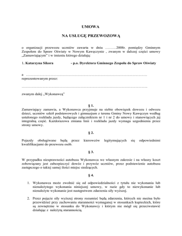 UMOWA NA USŁUGĘ PRZEWOZOWĄ o organizacji przewozu uczniów zawarta w dniu ………2008r. pomiędzy Gminnym Zespołem do Spraw Oświaty w Nowym Kawęczynie , zwanym w dalszej części umowy „Zamawiającym” i w imieniu którego działają: 1. Katarzyna Sikora - p.o. Dyrektora Gminnego Zespołu do Spraw Oświaty a ……………………………………………………………………………………… reprezentowanym przez: …………………………………………………………………………………………. zwanym dalej „Wykonawcą” § 1. Zamawiający zamawia, a Wykonawca przyjmuje na siebie obowiązek dowozu i odwozu dzieci, uczniów szkół podstawowych i gimnazjum z terenu Gminy Nowy Kawęczyn według ustalonego rozkładu jazdy, będącego załącznikiem nr 1 i nr 2 do umowy i stanowiących jej integralną część. Każdorazowa zmiana linii i rozkładu jazdy wymaga uzgodnienia przez strony umowy. § 2. Pojazdy obsługiwane będą przez kwalifikacjami do przewozu osób. kierowców legitymujących się odpowiednimi § 3. W przypadku niesprawności autobusu Wykonawca we własnym zakresie i na własny koszt zobowiązany jest zabezpieczyć dowóz i przywóz uczniów, przez podstawienie autobusu zastępczego o takiej samej ilości miejsc siedzących. § 4. 1. Wykonawca może zwolnić się od odpowiedzialności z tytułu nie wykonania lub nienależytego wykonania niniejszej umowy, w razie gdy to niewykonanie lub nienależyte wykonanie jest następstwem zdarzenia siły wyższej. 2. Przez pojęcie siły wyższej strony rozumieć będą zdarzenia, których nie można było przewidzieć przy zachowaniu staranności wymaganej w stosunkach kupieckich, które są zewnętrzne w stosunku do Wykonawcy i którym nie mógł się przeciwstawić działając z należytą starannością. 3. Zdarzeniami siły wyższej, w myśl niniejszej umowy, są w szczególności strajk generalny, blokady dróg, trzęsienie ziemi, powódź, huragan, epidemia i inne zdarzenia elementarnych sił przyrody, których strony nie mogą przezwyciężyć, nie przewidziały i nie mogły przewidzieć, a nadto które są zewnętrzne w stosunku do ich samych i ich działalności. 4. Nie wywiązanie się z obowiązku określonego w § 1 i § 3 powodować będzie naliczenie przez Zleceniodawcę kary umownej w wysokości 10 % miesięcznej wartości usług za każdy dzień niewykonania przedmiotu umowy. 5. Kara umowna określona w ust. 4 może być potrącona z każdej należności przysługującej Wykonawcy. § 5. 1. Wysokość wynagrodzenia liczona jest za 1 km przebiegu ……. brutto, słownie: …….. …………… , płatne przelewem na podstawie prawidłowo wystawionej faktury VAT w terminie 14 dni od dnia otrzymania faktury przez Zamawiającego. Wysokość zapłaty nie może ulec zmianie w okresie obowiązującej umowy. Wykonawca nie będzie obciążał Zamawiającego kosztami dojazdu autokaru ze Skierniewic do Nowego Kawęczyna i powrotu do Skierniewic. 2. Wynagrodzenie Wykonawcy rozliczane będzie w okresach miesięcznych zgodnie z umową, na podstawie prawidłowo wystawionej faktury przedłożonej przez Wykonawcę wraz z dziennymi kartami przejazdu danego pojazdu potwierdzonymi przez pracownika Urzędu Gminy – Opieki Dowozowej. § 6. 1. W przypadku konieczności wykonania usług dodatkowych, nie objętych zamówieniem Wykonawca zobowiązuje się do ich wykonania. Zakres usług oraz termin ich wykonania będzie określony w podpisanym przez Zamawiającego i Wykonawcę protokole konieczności. 2. Wartość ewentualnych usług dodatkowych zostanie ustalona przez ich rozpoczęciem w oparciu o cenę przedstawioną w niniejszej umowie za dowóz dzieci. 3. Realizacja usług dodatkowych zostanie wprowadzona aneksem do niniejszej umowy pod warunkiem, że ich wartość nie przekroczy 20% wartości realizowanego zamówienia. § 7. 1. Wykonawca jest zobowiązany utrzymać autobusy w należytym stanie technicznym, koszty remontu autobusu pokrywa Wykonawca. 2. Wykonawca ma obowiązek posiadania aktualnych ubezpieczeń komunikacyjnych w zakresie OC i NW kierowcy i pasażerów pojazdu na autobusy oraz dokonywać przeglądów technicznych zgodnie z obowiązującymi przepisami. § 8. Opieka nad dziećmi dowożonymi w trakcie dowozu spoczywa na Opiekunie Dowozuzatrudnionym przez Gminę Nowy Kawęczyn. § 9. Umowa została zawarta na czas określony od dnia 1 31 grudnia 2009r. stycznia 2009 do dnia § 10. Umowa może być rozwiązana przez każdą ze stron za jednomiesięcznym wypowiedzeniem. § 11. Zmiana treści umowy wymaga formy pisemnej pod rygorem jej nieważności. § 12. W sprawach nieuregulowanych niniejszą umową mają zastosowanie przepisy Kodeksu cywilnego i Ustawa o zamówieniach publicznych. § 13. Niniejsza umowa sporządzona została w dwóch jednobrzmiących egzemplarzach, po jednym dla każdej ze stron. Podpis Zamawiającego: Podpis Wykonawcy: Załącznik Nr 1 do umowy na usługę przewozową . Dowóz uczniów do szkół z terenu Gminy Nowy Kawęczyn (przejazd około 50 km dziennie) KURS I 06.40 Nowy Kawęczyn 06.50 Nowy Dwór 07.00 Doleck 07.05 Stara Rawa 07.10 Nowy Kawęczyn (koło biblioteki) 07.10 Podfranciszkany i Nowa Trzcianna KURS II 07.15 Strzyboga (szkoła) 07.25 Rzędków, Stary Rzędków, Nowy Rzędków 07.40 Strzyboga (szkoła) KURS III 07.50 Trzcianna (szkoła) 08.00 Strzyboga (szkoła) KURS IV 08.15 Dukaczew (koło szkoły) 08.30 Nowy Dwór (szkoła) Załącznik Nr 2 do umowy na usługę przewozową . Dowóz uczniów do szkół z terenu Gminy Nowy Kawęczyn (przejazd około 100 km dziennie) Poniedziałek 13.30 Urząd Gminy, Nowy Dwór (szkoła), Doleck, Kolonia Starorawska, Nowy Kawęczyn, Nowy Dwór Parcela, Dukaczew, Krasowiec, Zglinna Mała, Zglinna Duża, Marianów, Kawęczyn B, Nowy Kawęczyn, Nowy Dwór, Strzyboga (szkoła), Nowy Dwór (szkoła) 15.20 kurs jak wyżej Wtorek, Środa, Czwartek, Piątek Tak jak w poniedziałek