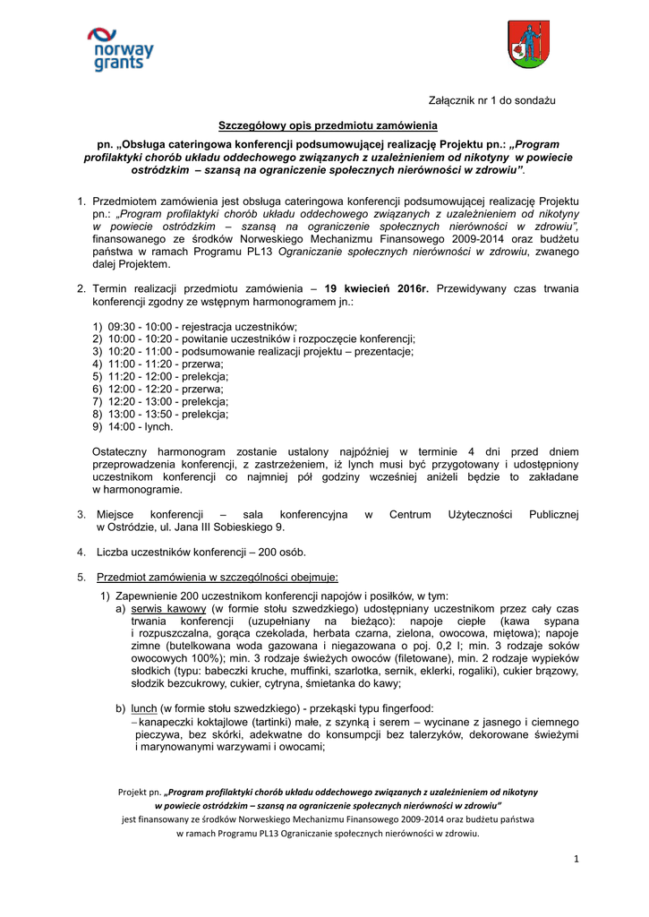 Załącznik nr 1 do sondażu Szczegółowy opis przedmiotu zamówienia pn. „Obsługa cateringowa konferencji podsumowującej realizację Projektu pn.: „Program profilaktyki chorób układu oddechowego związanych z uzależnieniem od nikotyny w powiecie ostródzkim – szansą na ograniczenie społecznych nierówności w zdrowiu”. 1. Przedmiotem zamówienia jest obsługa cateringowa konferencji podsumowującej realizację Projektu pn.: „Program profilaktyki chorób układu oddechowego związanych z uzależnieniem od nikotyny w powiecie ostródzkim – szansą na ograniczenie społecznych nierówności w zdrowiu”, finansowanego ze środków Norweskiego Mechanizmu Finansowego 2009-2014 oraz budżetu państwa w ramach Programu PL13 Ograniczanie społecznych nierówności w zdrowiu, zwanego dalej Projektem. 2. Termin realizacji przedmiotu zamówienia – 19 kwiecień 2016r. Przewidywany czas trwania konferencji zgodny ze wstępnym harmonogramem jn.: 1) 2) 3) 4) 5) 6) 7) 8) 9) 09:30 - 10:00 - rejestracja uczestników; 10:00 - 10:20 - powitanie uczestników i rozpoczęcie konferencji; 10:20 - 11:00 - podsumowanie realizacji projektu – prezentacje; 11:00 - 11:20 - przerwa; 11:20 - 12:00 - prelekcja; 12:00 - 12:20 - przerwa; 12:20 - 13:00 - prelekcja; 13:00 - 13:50 - prelekcja; 14:00 - lynch. Ostateczny harmonogram zostanie ustalony najpóźniej w terminie 4 dni przed dniem przeprowadzenia konferencji, z zastrzeżeniem, iż lynch musi być przygotowany i udostępniony uczestnikom konferencji co najmniej pół godziny wcześniej aniżeli będzie to zakładane w harmonogramie. 3. Miejsce konferencji – sala konferencyjna w Ostródzie, ul. Jana III Sobieskiego 9. w Centrum Użyteczności Publicznej 4. Liczba uczestników konferencji – 200 osób. 5. Przedmiot zamówienia w szczególności obejmuje: 1) Zapewnienie 200 uczestnikom konferencji napojów i posiłków, w tym: a) serwis kawowy (w formie stołu szwedzkiego) udostępniany uczestnikom przez cały czas trwania konferencji (uzupełniany na bieżąco): napoje ciepłe (kawa sypana i rozpuszczalna, gorąca czekolada, herbata czarna, zielona, owocowa, miętowa); napoje zimne (butelkowana woda gazowana i niegazowana o poj. 0,2 l; min. 3 rodzaje soków owocowych 100%); min. 3 rodzaje świeżych owoców (filetowane), min. 2 rodzaje wypieków słodkich (typu: babeczki kruche, muffinki, szarlotka, sernik, eklerki, rogaliki), cukier brązowy, słodzik bezcukrowy, cukier, cytryna, śmietanka do kawy; b) lunch (w formie stołu szwedzkiego) - przekąski typu fingerfood: kanapeczki koktajlowe (tartinki) małe, z szynką i serem – wycinane z jasnego i ciemnego pieczywa, bez skórki, adekwatne do konsumpcji bez talerzyków, dekorowane świeżymi i marynowanymi warzywami i owocami; Projekt pn. „Program profilaktyki chorób układu oddechowego związanych z uzależnieniem od nikotyny w powiecie ostródzkim – szansą na ograniczenie społecznych nierówności w zdrowiu” jest finansowany ze środków Norweskiego Mechanizmu Finansowego 2009-2014 oraz budżetu państwa w ramach Programu PL13 Ograniczanie społecznych nierówności w zdrowiu. 1 pszenne tortille – 2 rodzaje: z wędzonym łososiem oraz z kurczakiem, z dodatkiem świeżych warzyw i dipów; babeczki bankietowe (kruche słone) z wytrawnym nadzieniem, dekorowane świeżymi i marynowanymi warzywami 2 rodzaje: kurczak z suszonymi pomidorami, nadzienie z wędzonego pstrąga lub łososia; sałatka „Cezar” z kurczakiem i grzankami – ułożona na półmiskach lub w mini miseczkach; 3 dania podawane na ciepło w podgrzewaczach: szaszłyki z kurczakiem i warzywami; pierożki mix: z mięsem, ruskie, z kaszą gryczaną i warzywami; naleśniki pełnoziarniste w formie roladek z nadzieniem ze szpinaku i pieczarek, z suszonymi pomidorami. c) lunch musi być udostępniony wszystkim uczestnikom konferencji w tym samym czasie; d) Wykonawca zapewni stoliki koktajlowe na czas trwania konferencji; e) posiłki muszą być przygotowane ze świeżych produktów posiadających aktualne terminy przydatności do spożycia oraz zgodnie z zasadami sztuki kulinarnej i przepisami sanitarnymi obowiązującymi dla żywienia zbiorowego; f) wszystkie naczynia udostępniane uczestnikom konferencji typu filiżanki, szklanki, talerzyki, talerze, itp., muszą być szklane bądź ceramiczne; sztućce ze stali nierdzewnej. Nie dopuszcza się możliwości stosowania naczyń i sztućców jednorazowego użytku, opakowań czy pojemników styropianowych, itp.; g) posiłki muszą być estetycznie przygotowane i podane; stoły, na których będą ustawione posiłki i naczynia, muszą być pokryte białymi obrusami, schludne i czyste; 2) bieżące utrzymywanie w czystości sali przeznaczonej na konsumpcję oraz stołów i stolików koktajlowych, w tym zapewnienie odpowiedniej ilości koszy na odpadki; 3) posprzątanie sali, w której udostępniano serwis kawowy oraz lynch - po jej opuszczeniu przez uczestników konferencji, w tym wywiezienie zebranych odpadków. Projekt pn. „Program profilaktyki chorób układu oddechowego związanych z uzależnieniem od nikotyny w powiecie ostródzkim – szansą na ograniczenie społecznych nierówności w zdrowiu” jest finansowany ze środków Norweskiego Mechanizmu Finansowego 2009-2014 oraz budżetu państwa w ramach Programu PL13 Ograniczanie społecznych nierówności w zdrowiu. 2