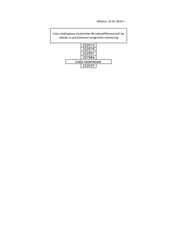 Gliwice, 31.01.2014 r. Lista rankingowa studentów IM zakwalifikowanych do udziału w prestiżowym programie mentoring 222512 222515 222501 227884 Lista rezerwowa 222537