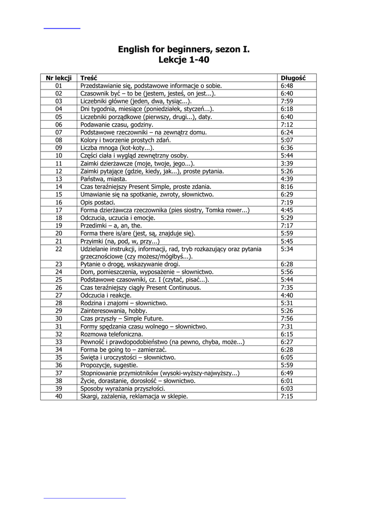 English for beginners, sezon I. Lekcje 1-40 Nr lekcji 01 02 03 04 05 06 07 08 09 10 11 12 13 14 15 16 17 18 19 20 21 22 23 24 25 26 27 28 29 30 31 32 33 34 35 36 37 38 39 40 Treść Przedstawianie się, podstawowe informacje o sobie. Czasownik być – to be (jestem, jesteś, on jest...). Liczebniki główne (jeden, dwa, tysiąc...). Dni tygodnia, miesiące (poniedziałek, styczeń...). Liczebniki porządkowe (pierwszy, drugi...), daty. Podawanie czasu, godziny. Podstawowe rzeczowniki – na zewnątrz domu. Kolory i tworzenie prostych zdań. Liczba mnoga (kot-koty...). Części ciała i wygląd zewnętrzny osoby. Zaimki dzierżawcze (moje, twoje, jego...). Zaimki pytające (gdzie, kiedy, jak...), proste pytania. Państwa, miasta. Czas teraźniejszy Present Simple, proste zdania. Umawianie się na spotkanie, zwroty, słownictwo. Opis postaci. Forma dzierżawcza rzeczownika (pies siostry, Tomka rower...) Odczucia, uczucia i emocje. Przedimki – a, an, the. Forma there is/are (jest, są, znajduje się). Przyimki (na, pod, w, przy...) Udzielanie instrukcji, informacji, rad, tryb rozkazujący oraz pytania grzecznościowe (czy możesz/mógłbyś...). Pytanie o drogę, wskazywanie drogi. Dom, pomieszczenia, wyposażenie – słownictwo. Podstawowe czasowniki, cz. I (czytać, pisać...). Czas teraźniejszy ciągły Present Continuous. Odczucia i reakcje. Rodzina i znajomi – słownictwo. Zainteresowania, hobby. Czas przyszły – Simple Future. Formy spędzania czasu wolnego – słownictwo. Rozmowa telefoniczna. Pewność i prawdopodobieństwo (na pewno, chyba, może...) Forma be going to – zamierzać. Święta i uroczystości – słownictwo. Propozycje, sugestie. Stopniowanie przymiotników (wysoki-wyższy-najwyższy...) Życie, dorastanie, dorosłość – słownictwo. Sposoby wyrażania przyszłości. Skargi, zażalenia, reklamacja w sklepie. Długość 6:48 6:40 7:59 6:18 6:40 7:12 6:24 5:07 6:36 5:44 3:39 5:26 4:39 8:16 6:29 7:19 4:45 5:29 7:17 5:59 5:45 5:34 6:28 5:56 5:44 7:35 4:40 5:31 5:26 7:56 7:31 6:15 6:27 6:28 6:05 5:59 6:49 6:01 6:03 7:15