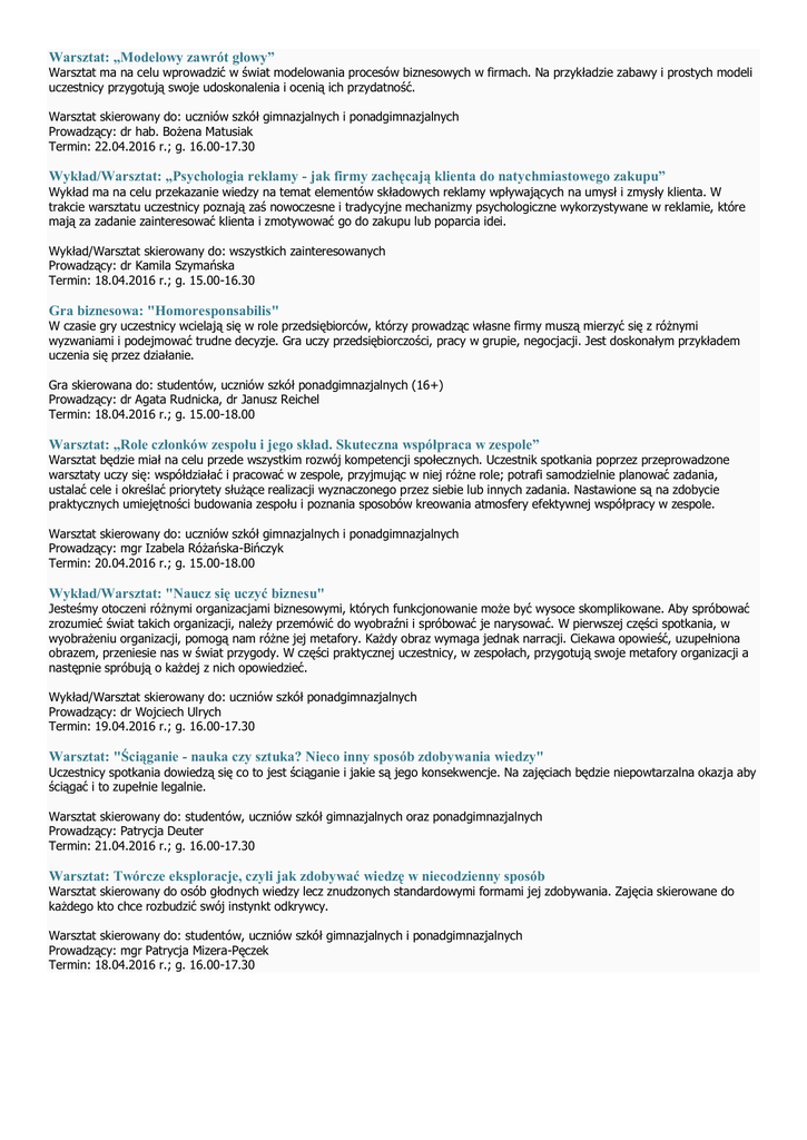 Warsztat: „Modelowy zawrót głowy” Warsztat ma na celu wprowadzić w świat modelowania procesów biznesowych w firmach. Na przykładzie zabawy i prostych modeli uczestnicy przygotują swoje udoskonalenia i ocenią ich przydatność. Warsztat skierowany do: uczniów szkół gimnazjalnych i ponadgimnazjalnych Prowadzący: dr hab. Bożena Matusiak Termin: 22.04.2016 r.; g. 16.00-17.30 Wykład/Warsztat: „Psychologia reklamy - jak firmy zachęcają klienta do natychmiastowego zakupu” Wykład ma na celu przekazanie wiedzy na temat elementów składowych reklamy wpływających na umysł i zmysły klienta. W trakcie warsztatu uczestnicy poznają zaś nowoczesne i tradycyjne mechanizmy psychologiczne wykorzystywane w reklamie, które mają za zadanie zainteresować klienta i zmotywować go do zakupu lub poparcia idei. Wykład/Warsztat skierowany do: wszystkich zainteresowanych Prowadzący: dr Kamila Szymańska Termin: 18.04.2016 r.; g. 15.00-16.30 Gra biznesowa: "Homoresponsabilis" W czasie gry uczestnicy wcielają się w role przedsiębiorców, którzy prowadząc własne firmy muszą mierzyć się z różnymi wyzwaniami i podejmować trudne decyzje. Gra uczy przedsiębiorczości, pracy w grupie, negocjacji. Jest doskonałym przykładem uczenia się przez działanie. Gra skierowana do: studentów, uczniów szkół ponadgimnazjalnych (16+) Prowadzący: dr Agata Rudnicka, dr Janusz Reichel Termin: 18.04.2016 r.; g. 15.00-18.00 Warsztat: „Role członków zespołu i jego skład. Skuteczna współpraca w zespole” Warsztat będzie miał na celu przede wszystkim rozwój kompetencji społecznych. Uczestnik spotkania poprzez przeprowadzone warsztaty uczy się: współdziałać i pracować w zespole, przyjmując w niej różne role; potrafi samodzielnie planować zadania, ustalać cele i określać priorytety służące realizacji wyznaczonego przez siebie lub innych zadania. Nastawione są na zdobycie praktycznych umiejętności budowania zespołu i poznania sposobów kreowania atmosfery efektywnej współpracy w zespole. Warsztat skierowany do: uczniów szkół gimnazjalnych i ponadgimnazjalnych Prowadzący: mgr Izabela Różańska-Bińczyk Termin: 20.04.2016 r.; g. 15.00-18.00 Wykład/Warsztat: "Naucz się uczyć biznesu" Jesteśmy otoczeni różnymi organizacjami biznesowymi, których funkcjonowanie może być wysoce skomplikowane. Aby spróbować zrozumieć świat takich organizacji, należy przemówić do wyobraźni i spróbować je narysować. W pierwszej części spotkania, w wyobrażeniu organizacji, pomogą nam różne jej metafory. Każdy obraz wymaga jednak narracji. Ciekawa opowieść, uzupełniona obrazem, przeniesie nas w świat przygody. W części praktycznej uczestnicy, w zespołach, przygotują swoje metafory organizacji a następnie spróbują o każdej z nich opowiedzieć. Wykład/Warsztat skierowany do: uczniów szkół ponadgimnazjalnych Prowadzący: dr Wojciech Ulrych Termin: 19.04.2016 r.; g. 16.00-17.30 Warsztat: "Ściąganie - nauka czy sztuka? Nieco inny sposób zdobywania wiedzy" Uczestnicy spotkania dowiedzą się co to jest ściąganie i jakie są jego konsekwencje. Na zajęciach będzie niepowtarzalna okazja aby ściągać i to zupełnie legalnie. Warsztat skierowany do: studentów, uczniów szkół gimnazjalnych oraz ponadgimnazjalnych Prowadzący: Patrycja Deuter Termin: 21.04.2016 r.; g. 16.00-17.30 Warsztat: Twórcze eksploracje, czyli jak zdobywać wiedzę w niecodzienny sposób Warsztat skierowany do osób głodnych wiedzy lecz znudzonych standardowymi formami jej zdobywania. Zajęcia skierowane do każdego kto chce rozbudzić swój instynkt odkrywcy. Warsztat skierowany do: studentów, uczniów szkół gimnazjalnych i ponadgimnazjalnych Prowadzący: mgr Patrycja Mizera-Pęczek Termin: 18.04.2016 r.; g. 16.00-17.30