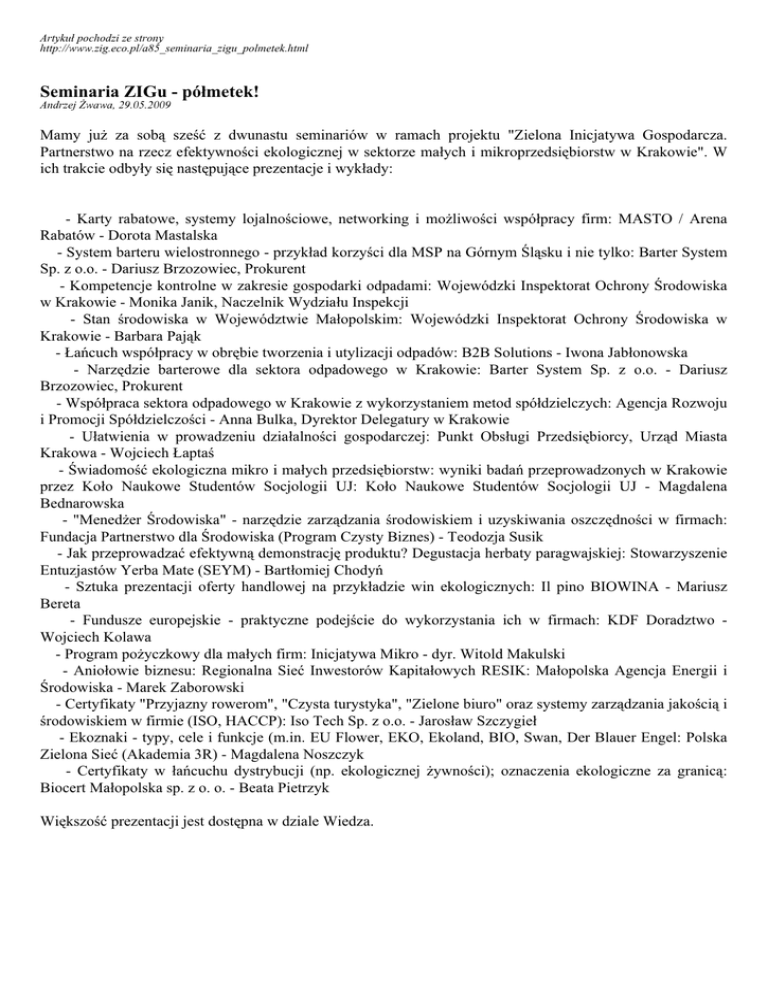 Artykuł pochodzi ze strony http://www.zig.eco.pl/a85_seminaria_zigu_polmetek.html Seminaria ZIGu - półmetek! Andrzej Żwawa, 29.05.2009 Mamy już za sobą sześć z dwunastu seminariów w ramach projektu "Zielona Inicjatywa Gospodarcza. Partnerstwo na rzecz efektywności ekologicznej w sektorze małych i mikroprzedsiębiorstw w Krakowie". W ich trakcie odbyły się następujące prezentacje i wykłady: - Karty rabatowe, systemy lojalnościowe, networking i możliwości współpracy firm: MASTO / Arena Rabatów - Dorota Mastalska - System barteru wielostronnego - przykład korzyści dla MSP na Górnym Śląsku i nie tylko: Barter System Sp. z o.o. - Dariusz Brzozowiec, Prokurent - Kompetencje kontrolne w zakresie gospodarki odpadami: Wojewódzki Inspektorat Ochrony Środowiska w Krakowie - Monika Janik, Naczelnik Wydziału Inspekcji - Stan środowiska w Województwie Małopolskim: Wojewódzki Inspektorat Ochrony Środowiska w Krakowie - Barbara Pająk - Łańcuch współpracy w obrębie tworzenia i utylizacji odpadów: B2B Solutions - Iwona Jabłonowska - Narzędzie barterowe dla sektora odpadowego w Krakowie: Barter System Sp. z o.o. - Dariusz Brzozowiec, Prokurent - Współpraca sektora odpadowego w Krakowie z wykorzystaniem metod spółdzielczych: Agencja Rozwoju i Promocji Spółdzielczości - Anna Bulka, Dyrektor Delegatury w Krakowie - Ułatwienia w prowadzeniu działalności gospodarczej: Punkt Obsługi Przedsiębiorcy, Urząd Miasta Krakowa - Wojciech Łaptaś - Świadomość ekologiczna mikro i małych przedsiębiorstw: wyniki badań przeprowadzonych w Krakowie przez Koło Naukowe Studentów Socjologii UJ: Koło Naukowe Studentów Socjologii UJ - Magdalena Bednarowska - "Menedżer Środowiska" - narzędzie zarządzania środowiskiem i uzyskiwania oszczędności w firmach: Fundacja Partnerstwo dla Środowiska (Program Czysty Biznes) - Teodozja Susik - Jak przeprowadzać efektywną demonstrację produktu? Degustacja herbaty paragwajskiej: Stowarzyszenie Entuzjastów Yerba Mate (SEYM) - Bartłomiej Chodyń - Sztuka prezentacji oferty handlowej na przykładzie win ekologicznych: Il pino BIOWINA - Mariusz Bereta - Fundusze europejskie - praktyczne podejście do wykorzystania ich w firmach: KDF Doradztwo Wojciech Kolawa - Program pożyczkowy dla małych firm: Inicjatywa Mikro - dyr. Witold Makulski - Aniołowie biznesu: Regionalna Sieć Inwestorów Kapitałowych RESIK: Małopolska Agencja Energii i Środowiska - Marek Zaborowski - Certyfikaty "Przyjazny rowerom", "Czysta turystyka", "Zielone biuro" oraz systemy zarządzania jakością i środowiskiem w firmie (ISO, HACCP): Iso Tech Sp. z o.o. - Jarosław Szczygieł - Ekoznaki - typy, cele i funkcje (m.in. EU Flower, EKO, Ekoland, BIO, Swan, Der Blauer Engel: Polska Zielona Sieć (Akademia 3R) - Magdalena Noszczyk - Certyfikaty w łańcuchu dystrybucji (np. ekologicznej żywności); oznaczenia ekologiczne za granicą: Biocert Małopolska sp. z o. o. - Beata Pietrzyk Większość prezentacji jest dostępna w dziale Wiedza. Więcej zdjęć z seminariów Zielonej Inicjatywy Gospodarczej w albumie Picasa Foto: Małgorzata Pawełek, Grzegorz Supron W trakcie dyskusji pojawiły się m.in. takie tematy jak: - możliwość założenia przez Partnerów ZIGu spółdzielni osób prawnych w celu np. wspólnych zakupów czy wspólnego rozwiązywania problemu odpadów - wspólna karta rabatowa Partnerów ZIGu jako narządzie wzajemnej promocji - wspólne zakupienie przez Partnerów ZIGu np. ekologicznych toreb na zakupy z nadrukami reklamowymi dla poszczególnych Partnerów. Torby te stanowiłyby jednocześnie swoistą "kartę lojalnościową" uprawniającą jej właściciela do rabatu przy ponownych zakupach w danym sklepie - zaprojektowanie jednolitych pojemników na odpady (np. na baterie, które mogliby przynosić klienci) dla sklepów, restauracji i biur Partnerów ZIGu - zorganizowanie systemu zbiórki odpadów od Partnerów ZIGu - zaprojektowanie wspólnych stojaków na rowery, które mogłyby zostać ustawione przez lokalami Partnerów ZIGu dla wygody ich klientów - konieczność szkolenia sprzedawców, tak aby lepiej umieli informować klientów o ekologiczności oferowanych towarów oraz odpowiadać na ich pytania i potrzeby. Firma Barter System zaproponowała Partnerom ZIGu tańsze grupowe przystąpienie do swej platformy a Inicjatywa Mikro zadeklarowała rozważenie stworzenia linii pożyczkowej dla ekologicznych MMP. Nieobecni mają czego żałować, jednakże przed nami jeszcze sześć następnych spotkań, na które serdecznie zapraszamy. Nie może państwa zabraknąć, gdyż jednym z celów seminariów jest opracowanie strategii rozwoju branży ekologicznej!!! Na bieżąco aktualizowany program wszystkich 12 seminariów znajdą państwo na stronie: http://zig.eco.pl/s31_seminaria.html. Odbywają się one we wtorki i czwartki w godz. 15.30-18.30 w centrum Krakowa. Ze względów organizacyjnych dokładny adres podajemy tylko Partnerom ZIGu. Prosimy o zgłaszanie udziału oraz o niezawodne przybycie. Liczy się kolejność zgłoszeń! Udział w seminariach jest bezpłatny, będzie też można napić się kawy i herbaty ze Sprawiedliwego Handlu, skorzystać ze zdrowego posiłku przygotowanego przez Firmę Społeczną Catering Cogito oraz degustować produkty ofiarowane przez naszych Partnerów. Moderatorem spotkań jest Tomasz Makowski. Zachęcamy do przynoszenia na spotkania swoich wizytówek, plakatów, ulotek - można je powiesić w sali seminaryjnej i kateringowej, co ułatwi państwu nawiązywanie wzajemnych kontaktów. Proponujemy też przynosić w celach promocyjnych próbki swych produktów. Jednocześnie informujemy, że ze względu na większą niż przypuszczaliśmy ilość Partnerów, będziemy zmuszeni rozdzielić zaplanowane materiały promocyjne oraz bezpłatne konsultacje pomiędzy najaktywniejszych uczestników seminariów. Zostanie im też zaproponowany udział w kolejnym naszym projekcie: "Zielona Inicjatywa Gospoda