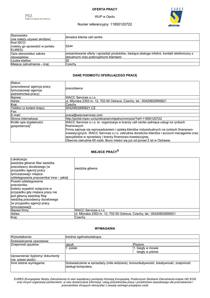 OFERTA PRACY WUP w Opolu Numer referencyjny: 11850120722 Stanowisko: (nie należy używać skrótów) Kod ISCO: (należy go sprawdzić w portalu EURES) Opis stanowiska/ zakres obowiązków: Liczba etatów: Miejsce zatrudnienia – kraj: doradca klienta call centre 5244 prezentowanie oferty i sprzedaż produktów, bieżąca obsługa infolinii, kontakt telefoniczny z aktualnymi oraz potencjalnymi klientami 20 Czechy DANE PODMIOTU OFERUJĄCEGO PRACĘ Status: (pracodawca/ agencja pracy tymczasowej/ agencja pośrednictwa pracy) Nazwa: Adres: Kraj: Telefon (z kodem kraju): Fax: E-mail: Strona internetowa: Krótki opis działalności gospodarczeji: pracodawca WACC Services s.r.o ul. Mlynska 2353 m. 12, 702 00 Ostrava, Czechy, tel.: 00420602695621 Czechy 00420602695621 CZ [email protected] http://portal.mpsv.cz/sz/obcane/vmjedno/vmrozsir?ref=11850120722 WACC Services s.r.o. to organizacja w branży call center pełniąca usługi na rynkach finansowych. Firma zajmuje się wprowadzaniem i opieką klientów indywidualnych na rynkach finansowoinwestycyjnych. WACC Services s.r.o. zatrudnia doradców klientów i account managerów oraz specjalistów w sprzedaży i branży finansowo-inwestycyjnej. Obecnie zatrudnia 60 osób. Biuro mieści się już od ponad 2 lat w Ostrawie. MIEJSCE PRACYii Lokalizacja: [siedziba główna/ filia/ siedziba pracodawcy docelowego (w przypadku agencji pracy tymczasowej)/ miejsce oddelegowania pracownika/ inne – jakie] Powód oddelegowania pracownika: [należy wypełnić wyłącznie w przypadku gdy miejsce pracy nie jest główną siedzibą/ filią/ siedzibą pracodawcy docelowego (w przypadku agencji pracy tymczasowej)] Nazwa firmy: Adres: Kraj: siedziba główna WACC Services s.r.o ul. Mlynska 2353 m. 12, 702 00 Ostrava, Czechy, tel.: 00420602695621 Czechy WYMAGANIA Wykształcenie: Doświadczenie zawodowe: Znajomość języków: Uprawnienia/ dyplomy/ dokumenty (np. prawo jazdy): Inne istotne wymagania: średnie ogólnokształcące Język 1. polski Poziom 1. biegły w mowie biegły w piśmie Doświadczenie w sprzedaży (mile widziane), komunikatywność, kreatywność, znajomość obsługi komputera, EURES (Europejskie Służby Zatrudnienia) to sieć współpracy pomiędzy Komisją Europejską, Publicznymi Służbami Zatrudnienia krajów UE/ EOG oraz innych organizacji partnerskich, w celu dostarczania informacji, usług pośrednictwa pracy i poradnictwa zawodowego dla pracodawców i pracowników chcących skorzystać z zasady wolnego przepływu osób WYNAGRODZENIE I WARUNKI ZATRUDNIENIA Wysokość pensji brutto: Wysokość pensji netto: Waluta, w jakiej wypłacana jest pensja: Rodzaj stawki wynagrodzenia: (godzinowa/ tygodniowa/ miesięczna/ roczna/ inna) Premie: Dodatkowe świadczenia (zakwaterowanie, wyżywienie, koszty związane ze zmianą miejsca zamieszkania, koszty podróży itp.): Nazwa firmy, z którą zostanie podpisana umowa: Rodzaj umowy: (umowa o pracę, umowa zlecenia, wolontariat, praktyka zawodowa/ staż, praca zdalna, agencja pracy tymczasowej, inne): Wymiar czasu pracy (praca na pełen etat/ część etatu): Czas trwania umowy: (nieokreślony/ określony) 15.000,00 Liczba godzin tygodniowo: Zmiany i praca w dni wolne: Data rozpoczęcia: Inne informacje: 40,00 jedna zmiana Korona czeska Czasowy ze stawką miesięczną tak istnieje możliwość zakwaterowania na własny koszt, wynagrodzenie od 15 000 do 50 000 podstawa + system bonusowy, pierwszy miesiac zakwaterowania opłacony przez firmę WACC Services s.r.o umowa o pracę pełny etat Data wygaśnięcia umowy (w przypadku umowy na czas określony): określony pełny etat, SPOSÓB SKŁADANIA WNIOSKU Wymagane dokumenty (list motywacyjny, CV itp.): Język, w którym muszą być sporządzone przedkładane dokumenty: Do kogo należy wysłać dokumenty: (do pracodawcy/ doradcy EURES) Gdzie należy wysłać dokumenty: (adres, adres e-mail, nr faksu z kodem kraju itp.) Dane teleadresowe doradcy EURES lub przedstawiciela pracodawcy: (nazwisko, adres, telefon, fax, e-mail itp.) CV angielski polski do pracodawcy email [email protected] DODATKOWE INFORMACJE przedstawiciel pracodawcy: Angelika Cupiał, +420602695621, [email protected] WAŻNOŚĆ 2016-12-13 Data publikacji: Termin przedkładania podań o pracę / zakończenia ważności oferty: Uprzejmie informujemy, że skontaktujemy się wyłącznie z wybranymi kandydatami. UWAGA: 1. Umowa z zagranicznym pracodawcą jest zawierana, co do zasady, zgodnie z prawem kraju zatrudnienia. Oznacza to, że wszystkie roszczenia odnośnie warunków, które obejmuje umowa, można kierować wyłącznie do odpowiedniego sądu w kraju zatrudnienia. Publiczne służby zatrudnienia (EURES) nie mogą pośredniczyć ani reprezentować pracownika w sądzie kraju zatrudnienia w przypadku sporu z pracodawcą. 2. Publiczne służby zatrudnienia (EURES) dokładają wszelkich starań, aby zapewnić rzetelność i wiarygodność ofert pracy zgłoszonych w lokalnym urzędzie pracy. Należy wyjaśnić, że oferta pracy została zgłoszona przez stronę trzecią i EURES nie odpowiada za ewentualne rozbieżności między warunkami pracy określonymi w ofercie pracy i warunkami oferowanymi przez potencjalnego pracodawcę. 3. Publiczne służby zatrudnienia (EURES) informują, że będą zbierać, przetwarzać i przekazywać potencjalnym pracodawcom EURES (Europejskie Służby Zatrudnienia) to sieć współpracy pomiędzy Komisją Europejską, Publicznymi Służbami Zatrudnienia krajów UE/ EOG oraz innych organizacji partnerskich, w celu dostarczania informacji, usług pośrednictwa pracy i poradnictwa zawodowego dla pracodawców i pracowników chcących skorzystać z zasady wolnego przepływu osób zgodnie z przepisami dotyczącymi ochrony danych osobowych wszystkie dane osobowe dostarczone przez osoby poszukujące pracy. iInformacje o firmie, takie jak: status prawny, sektor, typ działalności, rodzaj produktów lub świadczonych usług, data rozpoczęcia działalności gospodarczej, liczba 