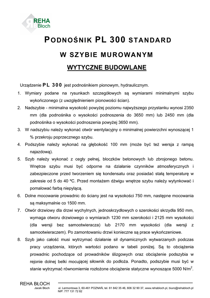P O D N O Ś N I K PL 300 STANDARD W SZYBIE MUROWANYM WYTYCZNE BUDOWLANE Urządzenie P L 3 0 0 jest podnośnikiem pionowym, hydraulicznym. 1. Wymiary podane na rysunkach szczegółowych są wymiarami minimalnymi szybu wykończonego (z uwzględnieniem pionowości ścian). 2. Nadszybie - minimalna wysokość powyżej poziomu najwyższego przystanku wynosi 2350 mm (dla podnośnika o wysokości podnoszenia do 3650 mm) lub 2450 mm (dla podnośnika o wysokości podnoszenia powyżej 3650 mm). 3. W nadszybiu należy wykonać otwór wentylacyjny o minimalnej powierzchni wynoszącej 1 % przekroju poprzecznego szybu. 4. Podszybie należy wykonać na głębokość 100 mm (może być też wersja z rampą najazdową). 5. Szyb należy wykonać z cegły pełnej, bloczków betonowych lub zbrojonego betonu. Wnętrze szybu musi być odporne na działanie czynników atmosferycznych i zabezpieczone przed tworzeniem się kondensatu oraz posiadać stałą temperaturę w zakresie od 5 do 40 ºC. Przed montażem dźwigu wnętrze szybu należy wytynkować i pomalować farbą niepylącą. 6. Dolne mocowanie prowadnic do ściany jest na wysokości 750 mm, następne mocowania są maksymalnie co 1500 mm. 7. Otwór drzwiowy dla drzwi wychylnych, jednoskrzydłowych o szerokości skrzydła 950 mm, wymaga otworu drzwiowego o wymiarach 1230 mm szerokości i 2125 mm wysokości (dla wersji bez samootwieracza) lub 2170 mm wysokości (dla wersji z samootwieraczem). Po zamontowaniu drzwi konieczne są prace wykończeniowe. 8. Szyb jako całość musi wytrzymać działanie sił dynamicznych wytwarzanych podczas pracy urządzenia, których wartości podano w tabeli poniżej. Są to obciążenia prowadnic pochodzące od prowadników ślizgowych oraz obciążenie podszybia w rejonie dolnej belki mocującej siłownik do podłoża. Ponadto, podszybie musi być w stanie wytrzymać równomiernie rozłożone obciążenie statyczne wynoszące 5000 N/m2. REHA BŁOCH Jacek Błoch ul. Lermontowa 3, 60-461 POZNAŃ, tel. 61 842 35 46, 606 32 90 37, www.rehabloch.pl, [email protected] NIP: 777 131 72 82 Obciążenia statyczne Przy obciążeniu znamionowym 300 kg Obciążenie pionowe podszybia w rejonie dolnej belki mocującej siłownik 12 000 N Obciążenia prowadnic pochodzące od prowadników ślizgowych X 800 N Y 700 N Obciążenie statyczne wynoszące 5 000 N/m2 równomiernie rozłożone na podszybie W celu obliczenia wartości obciążeń dynamicznych należy obciążenia podane w tabeli przemnożyć przez współczynnik X dynamiczny wynoszący 1,5. Siły działające na prowadnice urządzenia: 9. Urządzenie to nie wymaga osobnego pomieszczenia na maszynownię. Y 10. Skrzynka sterowa (wewnątrz której znajduje się agregat hydrauliczny z blokiem zaworów i kadzią z olejem oraz tablica sterowa ze sterownikiem) zajmuje 600 x 280 x 1000 mm i może być umieszczona do 7 m od szybu w miejscu ogrzewanym. 11. Zasilanie 230 V należy doprowadzić (przewodem YDY 3 x 2,5 mm2) do miejsca zainstalowania skrzynki sterowej i zabezpieczyć wyłącznikiem S301 C10 (moc 1,1 kW). 12. Pomiary doprowadzonej linii wykonuje wykonawca linii – protokół elektryczny dostarczyć do REHA Błoch. 13. Zamawiający dostarcza protokół prawidłowości wykonania prac budowlanych szybu. REHA BŁOCH Jacek Błoch ul. Lermontowa 3, 60-461 POZNAŃ, tel. 61 842 35 46, 606 32 90 37, www.rehabloch.pl, [email protected] NIP: 777 131 72 82