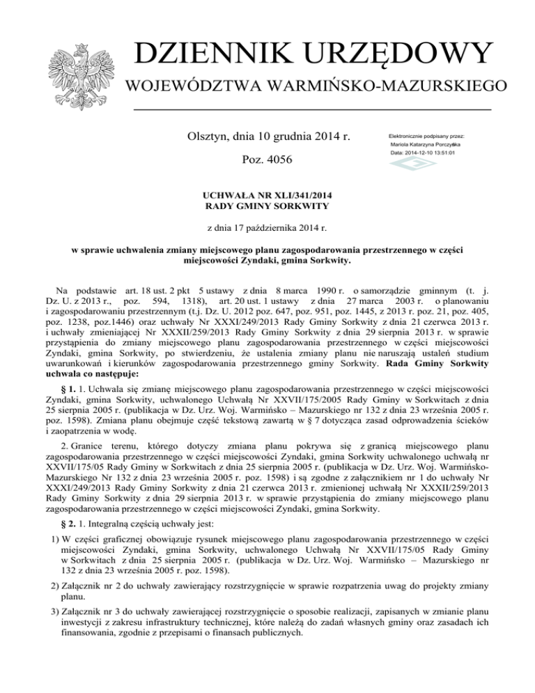 DZIENNIK URZĘDOWY WOJEWÓDZTWA WARMIŃSKO-MAZURSKIEGO Olsztyn, dnia 10 grudnia 2014 r. Elektronicznie podpisany przez: Mariola Katarzyna Porczyńska Poz. 4056 Data: 2014-12-10 13:51:01 UCHWAŁA NR XLI/341/2014 RADY GMINY SORKWITY z dnia 17 października 2014 r. w sprawie uchwalenia zmiany miejscowego planu zagospodarowania przestrzennego w części miejscowości Zyndaki, gmina Sorkwity. Na podstawie art. 18 ust. 2 pkt 5 ustawy z dnia 8 marca 1990 r. o samorządzie gminnym (t. j. Dz. U. z 2013 r., poz. 594, 1318), art. 20 ust. 1 ustawy z dnia 27 marca 2003 r. o planowaniu i zagospodarowaniu przestrzennym (t.j. Dz. U. 2012 poz. 647, poz. 951, poz. 1445, z 2013 r. poz. 21, poz. 405, poz. 1238, poz.1446) oraz uchwały Nr XXXI/249/2013 Rady Gminy Sorkwity z dnia 21 czerwca 2013 r. i uchwały zmieniającej Nr XXXII/259/2013 Rady Gminy Sorkwity z dnia 29 sierpnia 2013 r. w sprawie przystąpienia do zmiany miejscowego planu zagospodarowania przestrzennego w części miejscowości Zyndaki, gmina Sorkwity, po stwierdzeniu, że ustalenia zmiany planu nie naruszają ustaleń studium uwarunkowań i kierunków zagospodarowania przestrzennego gminy Sorkwity. Rada Gminy Sorkwity uchwala co następuje: § 1. 1. Uchwala się zmianę miejscowego planu zagospodarowania przestrzennego w części miejscowości Zyndaki, gmina Sorkwity, uchwalonego Uchwałą Nr XXVII/175/2005 Rady Gminy w Sorkwitach z dnia 25 sierpnia 2005 r. (publikacja w Dz. Urz. Woj. Warmińsko – Mazurskiego nr 132 z dnia 23 września 2005 r. poz. 1598). Zmiana planu obejmuje część tekstową zawartą w § 7 dotycząca zasad odprowadzenia ścieków i zaopatrzenia w wodę. 2. Granice terenu, którego dotyczy zmiana planu pokrywa się z granicą miejscowego planu zagospodarowania przestrzennego w części miejscowości Zyndaki, gmina Sorkwity uchwalonego uchwałą nr XXVII/175/05 Rady Gminy w Sorkwitach z dnia 25 sierpnia 2005 r. (publikacja w Dz. Urz. Woj. WarmińskoMazurskiego Nr 132 z dnia 23 września 2005 r. poz. 1598) i są zgodne z załącznikiem nr 1 do uchwały Nr XXXI/249/2013 Rady Gminy Sorkwity z dnia 21 czerwca 2013 r. zmienionej uchwałą Nr XXXII/259/2013 Rady Gminy Sorkwity z dnia 29 sierpnia 2013 r. w sprawie przystąpienia do zmiany miejscowego planu zagospodarowania przestrzennego w części miejscowości Zyndaki, gmina Sorkwity. § 2. 1. Integralną częścią uchwały jest: 1) W części graficznej obowiązuje rysunek miejscowego planu zagospodarowania przestrzennego w części miejscowości Zyndaki, gmina Sorkwity, uchwalonego Uchwałą Nr XXVII/175/05 Rady Gminy w Sorkwitach z dnia 25 sierpnia 2005 r. (publikacja w Dz. Urz. Woj. Warmińsko – Mazurskiego nr 132 z dnia 23 września 2005 r. poz. 1598). 2) Załącznik nr 2 do uchwały zawierający rozstrzygnięcie w sprawie rozpatrzenia uwag do projekty zmiany planu. 3) Załącznik nr 3 do uchwały zawierającej rozstrzygnięcie o sposobie realizacji, zapisanych w zmianie planu inwestycji z zakresu infrastruktury technicznej, które należą do zadań własnych gminy oraz zasadach ich finansowania, zgodnie z przepisami o finansach publicznych. Dziennik Urzędowy Województwa Warmińsko-Mazurskiego –2– Poz. 4056 § 3. 1. W § 7 uchwały Nr XXVII/175/05 Rady Gminy w Sorkwitach z dnia 25 sierpnia 2005 r. (publikacja w Dz. Urz. Woj. Warmińsko – Mazurskiego nr 132 z dnia 23 września 2005 r. poz. 1598) wprowadza się następujące zmiany: 1) po punkcie 1 dodaje się punkt 1a w brzmieniu: „ „1a Do czasu wybudowania sieci kanalizacji sanitarnej dopuszcza się odprowadzenie ścieków do zbiorników bezodpływowych z atestem szczelności”; 2) po punkcie 3 dodaje się punkt 3a w brzmieniu: „3a Do czasu wybudowania sieci wodociągowej dopuszcza się zaopatrzenie w wodę z indywidualnych lub grupowych ujęć, zgodnie z przepisami odrębnymi” ”. 2. W rozdziale III uchwały Nr XXVII/175/05 Rady Gminy w Sorkwitach z dnia 25 sierpnia 2005 r. (publikacja w Dz. Urz. Woj. Warmińsko – Mazurskiego nr 132 z dnia 23 września 2005 r. poz. 1598) wprowadza się następujące zmiany: 1) dodaje się § 15 w brzmieniu: „§ 15. W granicach planu inwestycji z zakresu infrastruktury technicznej, należących do zadań własnych gminy nie przewiduje się”; 2) dotychczasowy § 15 i § 16 otrzymują numery odpowiednio § 16 § 17. § 4. Wykonanie uchwały powierza się Wójtowi Gminy Sorkwity. § 5. Uchwała wchodzi w życie po upływie 14 dni od dnia ogłoszenia w Dzienniku Urzędowym Województwa Warmińsko-Mazurskiego. Przewodnicząca Rady Gminy Barbara ZmitrowiczWiszniewska Dziennik Urzędowy Województwa Warmińsko-Mazurskiego –3– Poz. 4056 ————————————————————————————————————————————————————————————— Załącznik nr 2 do Uchwały Nr XLI/341/2014 Rady Gminy Sorkwity z dnia 17 października 2014 r. w sprawie uchwalenia zmiany miejscowego planu zagospodarowania przestrzennego w części miejscowości Zyndaki, gmina Sorkwity Rozstrzygnięcie o sposobie rozpatrzenia uwag do projektu planu Do projektu w/w planu nie wniesiono żadnych uwag. W związku z tym rozstrzygnięcie, o którym mowa w art. 20 ust. 1 ustawy z dnia 27 marca 2003 r. o planowaniu i zagospodarowaniu przestrzennym (t.j. Dz. U. 2012 poz. 647, poz. 951, poz. 1445, z 2013 r. poz. 21), nie ma zastosowania. Dziennik Urzędowy Województwa Warmińsko-Mazurskiego –4– Poz. 4056 ————————————————————————————————————————————————————————————— Załącznik nr 3 do Uchwały Nr XLI/341/2014 Rady Gminy Sorkwity z dnia 17 października 2014 r. w sprawie uchwalenia zmiany miejscowego planu zagospodarowania przestrzennego w części miejscowości Zyndaki, gmina Sorkwity Rozstrzygnięcie sposobu realizacji oraz zasady finansowania inwestycji z zakresu infrastruktury technicznej, nale