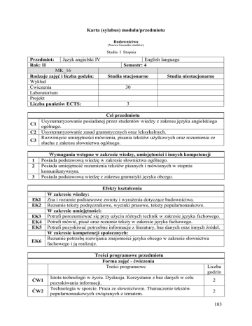 Karta (sylabus) modułu/przedmiotu Budownictwo (Nazwa kierunku studiów) Studia I Stopnia Przedmiot: Rok: II Język angielski IV MK_16 Rodzaje zajęć i liczba godzin: Wykład Ćwiczenia Laboratorium Projekt Liczba punktów ECTS: English language Semestr: 4 Studia stacjonarne Studia niestacjonarne 30 3 Cel przedmiotu Usystematyzowanie posiadanej przez studentów wiedzy z zakresu języka angielskiego C1 ogólnego. C2 Usystematyzowanie zasad gramatycznych oraz leksykalnych. Rozwinięcie umiejętności mówienia, pisania tekstów użytkowych oraz rozumienia ze C3 słuchu z zakresu słownictwa ogólnego. 1 2 3 Wymagania wstępne w zakresie wiedzy, umiejętności i innych kompetencji Posiada podstawową wiedzę w zakresie słownictwa ogólnego. Posiada umiejętność rozumienia tekstów pisanych i mówionych w stopniu komunikatywnym. Posiada podstawową wiedzę z zakresu gramatyki języka obcego. Efekty kształcenia EK1 EK2 EK3 EK4 EK5 EK6 W zakresie wiedzy: Zna i rozumie podstawowe zwroty i wyrażenia dotyczące budownictwa. Rozumie teksty podręcznikowe, wycinki prasowe, teksty popularnonaukowe. W zakresie umiejętności: Potrafi porozumiewać się przy użyciu różnych technik w zakresie języka fachowego. Potrafi mówić, pisać oraz rozumie teksty w zakresie języka fachowego. Potrafi pozyskiwać potrzebne informacje z literatury, baz danych oraz innych źródeł. W zakresie kompetencji społecznych: Rozumie potrzebę rozwijania znajomości języka obcego w zakresie słownictwa fachowego i ją realizuje. Treści programowe przedmiotu Forma zajęć - ćwiczenia Treści programowe ĆW1 ĆW2 Istota technologii w życiu. Dyskusja. Korzystanie z baz danych w celu pozyskiwania informacji. Technologia w sporcie. Praca ze słownictwem. Tłumaczenie tekstów popularnonaukowych związanych z tematem. Liczba godzin 2 2 183 ĆW3 ĆW4 ĆW5 ĆW6 ĆW7 ĆW8 ĆW9 ĆW10 ĆW11 ĆW12 Czasy gramatyczne – powtórzenie wiadomości. Słownictwo dotyczące typowych narzędzi i urządzeń na budowie. Samochód – przekrój. Praca ze słownictwem. Tłumaczenie tekstów branżowych. Strona bierna – ćwiczenia powtórzeniowe. Słownictwo dotyczące materiałów budowlanych. Praca z tekstem. Czasowniki modalne – powtórzenie wiadomości. List motywacyjny – ćwiczenia w pisaniu. Prawa i obowiązki pracodawcy i pracobiorcy – ćwiczenia leksykalne. Szyk zdaniowy – ćwiczenia utrwalające. Budowa autostrady – praca z tekstem. Praca ze słownictwem. Powtórzenie materiału. Suma godzin: 2 4 4 2 2 2 4 2 2 2 30 Metody i środki dydaktyczne 1 Ćwiczenia audytoryjne. F1 Sposoby oceniania Ocenianie kształtujące Określanie celu lekcji i przedstawienie go studentom. F2 Ustalenie i podanie studentom kryteriów oceniania. F3 Formułowanie pytań kluczowych. F4 Stosowanie różnorodnych technik zadawania pytań. F5 Stosowanie informacji zwrotnych dotyczących pracy studentów. F6 Wprowadzenie samooceny i oceny koleżeńskiej. Ocenianie podsumowujące Egzamin końcowy w formie pisemnej. P1 Obciążenie pracą studenta Forma aktywności Średnia liczba godzin na realizowanie aktywności Godziny kontaktowe z wykładowcą, realizowane w formie zajęć dydaktycznych – łączna liczba 30 godzin w semestrze. Godziny kontaktowe z wykładowcą realizowane w formie np. konsultacji – łączna liczba godzin 3 w semestrze. Przygotowanie się do zajęć – łączna liczba godzin 10 w semestrze. Wykonanie samodzielne projektów – łączna liczba 32 godzin w semestrze. Suma 75 Sumaryczna liczba punktów ECTS dla przedmiotu 3 1 Literatura podstawowa i uzupełniająca Enginerering Lindsay White 184 2 3 4 5 6 7 8 Glendinning E. H.: Technology, OXFORD University Press Hollet, V., Sydes, J.: Tech Talk Intermediate, Oxford Business English, 2009 Murphy, R.: English Grammar in Use1993, Cambridge University Press Seidel, K.-H.: Słownik techniczny angielsko-polski polsko-angielski, REA, 2009 Słowniki polsko-angielskie, angielsko-polskie Oxford, Longman Thomson, A.J, Martinet, A.V.: A Practical English Grammar, OUP, 1986 Walker, E., Elsworth, S.: Grammar Practice for Intermediate Students, Longman, 1994 Efekt kształcenia Macierz efektów kształcenia Odniesienie danego efektu kształcenia do efektów Cele Treści zdefiniowanych dla przedmiotu programowe całego programu (PEK) Metody i środki dydaktyczne EK1 B1A_W09 + C1, C2, C3 ĆW1- ĆW12 1 EK2 B1A_W09 ++ C2, C3 ĆW1- ĆW12 1 EK3 B1A_U18 +++ C2, C3 ĆW1- ĆW12 1 EK4 B1A_U18 ++ C2, C3 ĆW1- ĆW12 1 EK5 B1A_U18 +++ C2, C3 ĆW1- ĆW12 1 EK6 B1A_K01 + C2, C3 ĆW1- ĆW12 1 Sposoby oceniania F1 – F6, P1 F1 – F6, P1 F1 – F6, P1 F1 – F6, P1 F1 – F6, P1 F1 – F6, P1 Formy oceny - szczegóły EK1 Na ocenę 2 (ndst) Nie zna i nie rozumie podstawowych zwrotów i wyrażeń dotyczących budownictwa. Na ocenę 3 (dst) Zna i rozumie część podstawowych zwrotów i wyrażeń dotyczących budownictwa. Na ocenę 3+ (dst+) Zna i rozumie większość podstawowych zwrotów i wyrażeń dotyczących budownictwa. Na ocenę 4 (db) Zna i rozumie podstawowe zwroty i wyrażenia dotyczące budownictwa. Nie rozumie tekstów podręcznikow ych. Rozumie główną myśl tekstów podręcznikow ych. Rozumie teksty podręcznikow e i wycinki prasowe. Rozumie teksty podręcznikow e, wycinki prasowe i teksty popularnonauk owe. Nie potrafi porozumiewać się przy użyciu Porozumiewa się przy użyciu różnych Potrafi porozumiewać się przy użyciu Potrafi porozumiewać się przy użyciu EK2 EK3 Na ocenę 4+ (db+) Zna i rozumie podstawowe zwroty i wyrażenia dotyczące budownictwa, posługuje się nimi bez zakłóceń. Rozumie bez zakłóceń teksty podręcznikowe, wycinki prasowe i teksty popularnonauko we. Potrafi płynnie porozumiewać się przy użyciu różnych technik Na ocenę 5 (bdb) Zna i rozumie podstawowe zwroty i wyrażenia dotyczące budownictwa, płynnie się nimi posługuje. Rozumie teksty podręcznikowe, wycinki prasowe, teksty popularnonauko we i potrafi je opowiedzieć własnymi słowami