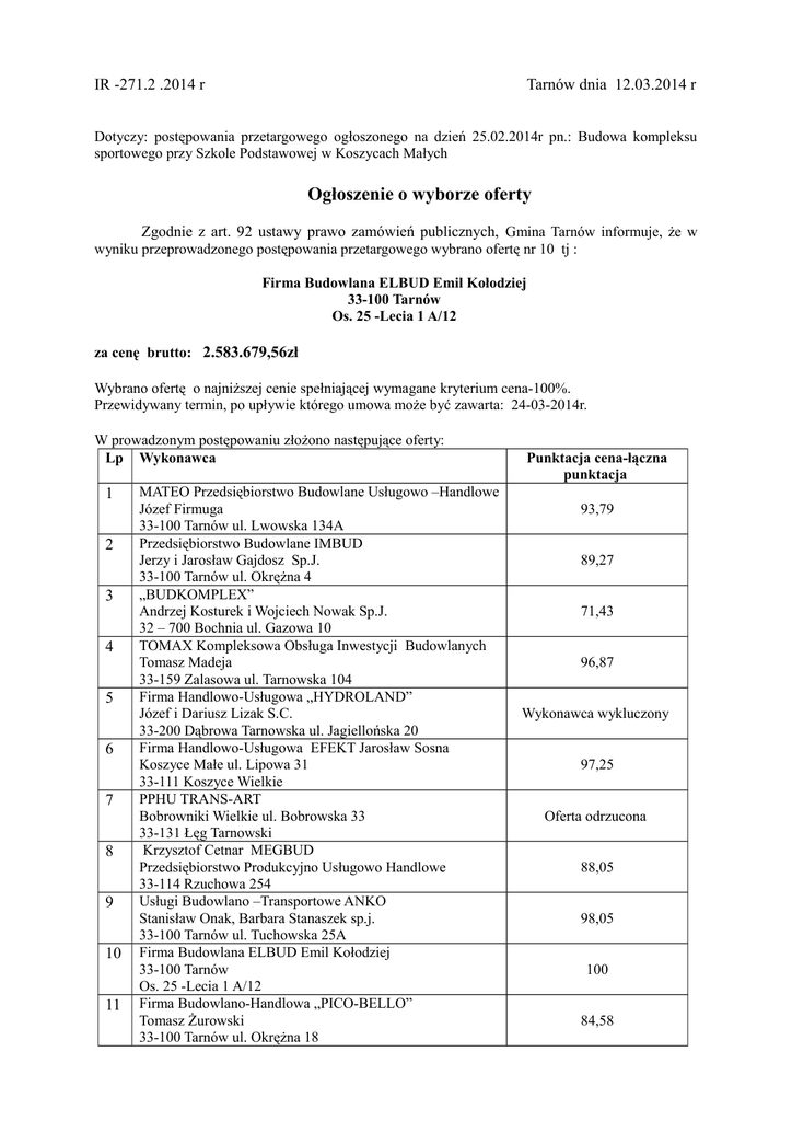 IR -271.2 .2014 r Tarnów dnia 12.03.2014 r Dotyczy: postępowania przetargowego ogłoszonego na dzień 25.02.2014r pn.: Budowa kompleksu sportowego przy Szkole Podstawowej w Koszycach Małych Ogłoszenie o wyborze oferty Zgodnie z art. 92 ustawy prawo zamówień publicznych, Gmina Tarnów informuje, że w wyniku przeprowadzonego postępowania przetargowego wybrano ofertę nr 10 tj : Firma Budowlana ELBUD Emil Kołodziej 33-100 Tarnów Os. 25 -Lecia 1 A/12 za cenę brutto: 2.583.679,56zł Wybrano ofertę o najniższej cenie spełniającej wymagane kryterium cena-100%. Przewidywany termin, po upływie którego umowa może być zawarta: 24-03-2014r. W prowadzonym postępowaniu złożono następujące oferty: Lp Wykonawca 1 2 3 4 5 6 7 8 9 10 11 MATEO Przedsiębiorstwo Budowlane Usługowo –Handlowe Józef Firmuga 33-100 Tarnów ul. Lwowska 134A Przedsiębiorstwo Budowlane IMBUD Jerzy i Jarosław Gajdosz Sp.J. 33-100 Tarnów ul. Okrężna 4 „BUDKOMPLEX” Andrzej Kosturek i Wojciech Nowak Sp.J. 32 – 700 Bochnia ul. Gazowa 10 TOMAX Kompleksowa Obsługa Inwestycji Budowlanych Tomasz Madeja 33-159 Zalasowa ul. Tarnowska 104 Firma Handlowo-Usługowa „HYDROLAND” Józef i Dariusz Lizak S.C. 33-200 Dąbrowa Tarnowska ul. Jagiellońska 20 Firma Handlowo-Usługowa EFEKT Jarosław Sosna Koszyce Małe ul. Lipowa 31 33-111 Koszyce Wielkie PPHU TRANS-ART Bobrowniki Wielkie ul. Bobrowska 33 33-131 Łęg Tarnowski Krzysztof Cetnar MEGBUD Przedsiębiorstwo Produkcyjno Usługowo Handlowe 33-114 Rzuchowa 254 Usługi Budowlano –Transportowe ANKO Stanisław Onak, Barbara Stanaszek sp.j. 33-100 Tarnów ul. Tuchowska 25A Firma Budowlana ELBUD Emil Kołodziej 33-100 Tarnów Os. 25 -Lecia 1 A/12 Firma Budowlano-Handlowa „PICO-BELLO” Tomasz Żurowski 33-100 Tarnów ul. Okrężna 18 Punktacja cena-łączna punktacja 93,79 89,27 71,43 96,87 Wykonawca wykluczony 97,25 Oferta odrzucona 88,05 98,05 100 84,58 12 13 14 15 Konsorcjum: MTM BUDOWNICTWO Spółka z o.o. I BUDOMAT Spółka z o.o. 33-100 Tarnów ul. Przemysłowa 27 A Przedsiębiorstwo Budownictwa Komunalnego Spółka z o.o. w Jaśle 38-200 Jasło ul. Bednarska 6 Firma Budowlano- Handlowo-Produkcyjna ZGODA Sp. J. Józef Tabor, Eugeniusz Łoś 33-100 Tarnów ul. Kochanowskiego 30 Zakład Ogólnobudowlany Jan Waz 33-326 Mogilno Koniuszowa 136 93,38 93,70 85,33 89,80 Działając na podstawie art. 92 ust. 1 pkt. 3 Prawa zamówień publicznych Zamawiający informuje, że w prowadzonym postępowaniu wykluczono jednego wykonawcę. Nr oferty 5 Nazwa Wykonawcy i adres Uzasadnienie prawne Uzasadnienie faktyczne Firma Handlowo-Usługowa „HYDROLAND” Józef i Dariusz Lizak S.C. 33-200 Dąbrowa Tarnowska ul. Jagiellońska 20 Wykonawca został wezwany do uzupełnienia dokumentów. W Art. 24 ust. 2 pkt. 4 Pzp wyznaczonym terminie dokument został złożony, jednak Wykonawca nie wykazał spełnienia warunków udziału w postępowaniu. Działając na podstawie art. 92 ust. 1 pkt. 2 Prawa zamówień publicznych Zamawiający informuję, że w prowadzonym postępowaniu odrzucono 2 oferty. Nr oferty Nazwa Wykonawcy i adres Uzasadnienie prawne Uzasadnienie faktyczne 5 Firma Handlowo-Usługowa „HYDROLAND” Józef i Dariusz Lizak S.C. 33-200 Dąbrowa Tarnowska ul. Jagiellońska 20 PPHU TRANS-ART Bobrowniki Wielkie ul. Bobrowska 33 33-131 Łęg Tarnowski Art. 24 ust. 4 Pzp Ofertę Wykonawcy wykluczonego uznaje się za odrzuconą . Art. 89 ust.1 pkt. 2 Zamawiający odrzuca ofertę, jeżeli jej treść nie odpowiada treści specyfikacji istotnych warunków zamówienia. 7 Otrzymują: 1 x Wykonawcy wszyscy 1 x a/a + tablica ogłoszeń + BIP