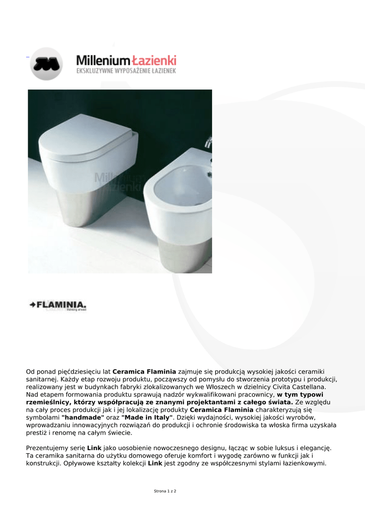 Od ponad pięćdziesięciu lat Ceramica Flaminia zajmuje się produkcją wysokiej jakości ceramiki sanitarnej. Każdy etap rozwoju produktu, począwszy od pomysłu do stworzenia prototypu i produkcji, realizowany jest w budynkach fabryki zlokalizowanych we Włoszech w dzielnicy Civita Castellana. Nad etapem formowania produktu sprawują nadzór wykwalifikowani pracownicy, w tym typowi rzemieślnicy, którzy współpracują ze znanymi projektantami z całego świata. Ze względu na cały proces produkcji jak i jej lokalizację produkty Ceramica Flaminia charakteryzują się symbolami "handmade" oraz "Made in Italy". Dzięki wydajności, wysokiej jakości wyrobów, wprowadzaniu innowacyjnych rozwiązań do produkcji i ochronie środowiska ta włoska firma uzyskała prestiż i renomę na całym świecie. Prezentujemy serię Link jako uosobienie nowoczesnego designu, łącząc w sobie luksus i elegancję. Ta ceramika sanitarna do użytku domowego oferuje komfort i wygodę zarówno w funkcji jak i konstrukcji. Opływowe kształty kolekcji Link jest zgodny ze współczesnymi stylami łazienkowymi. Strona 1 z 2 Ceramica Flaminia Linkze względu na swoje gabaryty jest łatwa do umieszczenia na każdej powierzchni. W kolekcji Ceramica Flaminia Link znajdą Państwo miski wc i bidety. Wysokiej klasy miska wc z serii Link wykonana jest z najwyższej jakości ceramiki. Ta stojąca miska wc wyposażona jest w stalową podstawę(matowa lub w połysku do wyboru); występuje w 11 kolorach wykończenia, w tym również w białym kolorze. Jej wymiary to 48x36xh44 cm. Niebanalny design miski wc CERAMICA FLAMINIA zadowoli nawet najbardziej wysublimowane gusta klientów. W komplecie: miska wc, stalowa podstawa pod miskę wc - matowa lub w połysku (do wyboru), zestaw mocujący Akcesoria dostępne za dopłatą: deska sedesowa, deska sedesowa wolnoopadająca Paleta kolorów patrz dodatkowe zdjęcia produktu. Strona 2 z 2